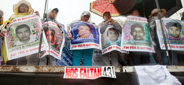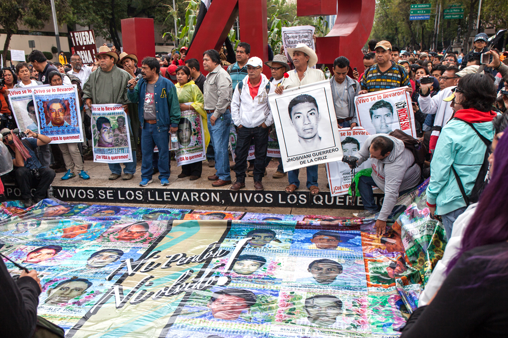 El primer mitin se realizó frente al llamado “antimonumento por los 43” (una estructura metálica que dibuja el emblemático número), donde se pasó lista a los estudiantes desaparecidos, a los heridos y a los asesinados el 26 de septiembre de 2014, y en el que se informó que aunque las familias ya habían llegado a la mitad de su caminata, más contingentes seguían sumándose a la columna que venía desde la Estela de Luz. Luego las familias siguieron avanzando para leer más muestras de agradecimiento y mirar las expresiones de protesta –como las caras de sus hijos en cartulinas frente al Hemiciclo a Juárez, en la Alameda Central– que las estaban esperando. La manifestación llegó al Zócalo pasadas las 4 de la tarde. El mitin lo iniciaron las familias. Cristina Bautista Bautista, madre del desaparecido José Ascencio Salvador Bautista (originario de una comunidad indígena de Guerrero), dio su discurso en lengua náhuatl. Esta mujer, que antes de la desaparición de su hijo era monolingüe, agradeció que su llamado a la sociedad civil para que marcharan junto a ella este día no haya sido en vano, y expresó que no va a claudicar en la exigencia de justicia hasta ver a su hijo de regreso, aunque eso la lleve a marchar una vez más el próximo año. Al final de la protesta, los gritos de las madres de los desaparecidos hicieron un eco tan grande que –como en la noche de los hechos criminales– hasta las nubes se desahogaron.