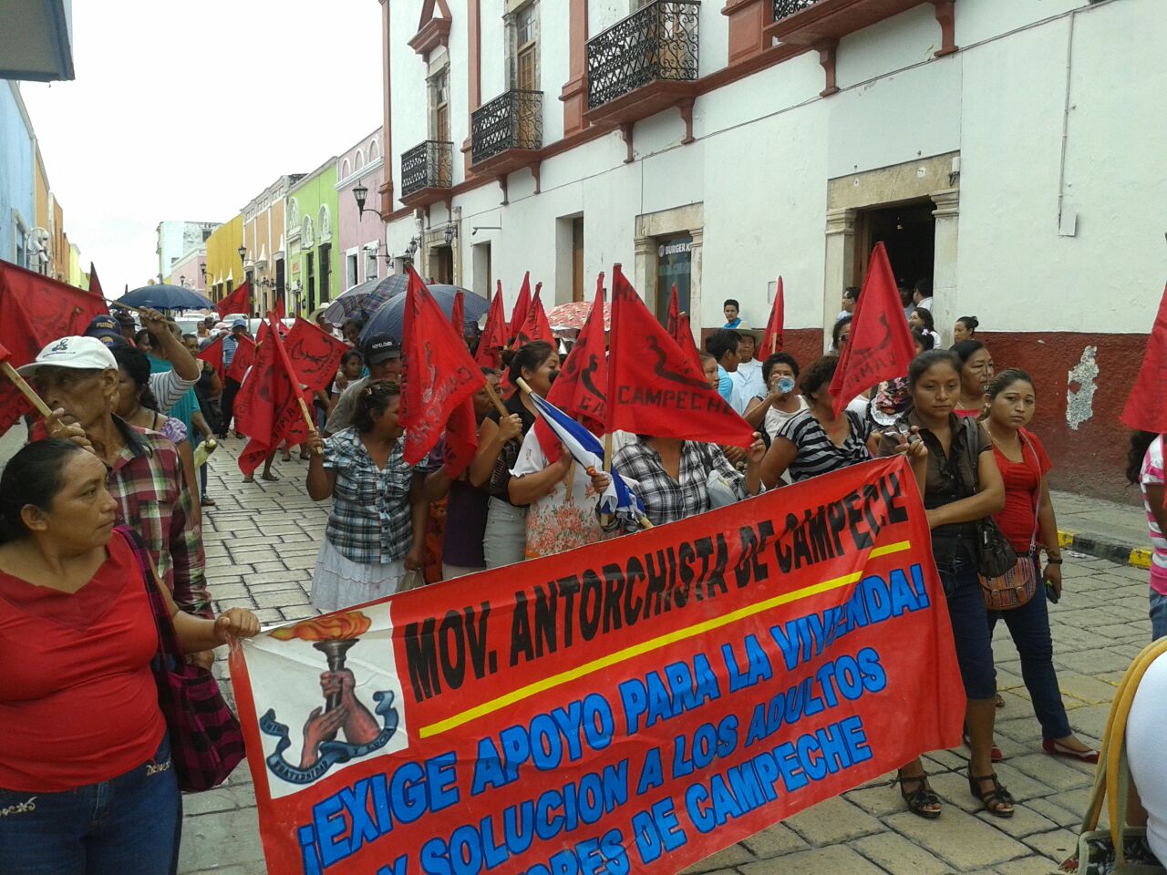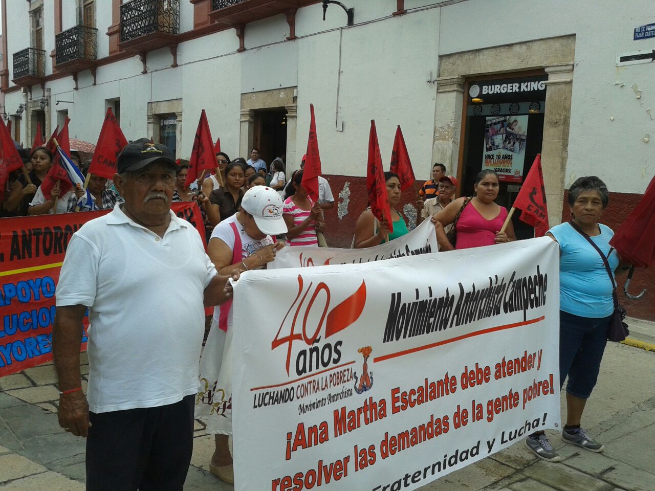 Por Luis Sánchez CAMPECHE, Cam. 15 de octubre.- Decenas de campesinos y colonos de la agrupación política Antorcha Campesina marcharon y bloquearon por unas cinco horas, los accesos al Palacio Municipal, en protesta por la falta de regularización de sus predios y por el rezago en materia eléctrica, agua potable y pavimentación de calles. Los manifestantes, encabezados por Hipólito Salazar Acosta, representante estatal de Antorcha Campesina, denunciaron que la alcaldesa de Campeche, Ana Martha Escalante Castillo, propone soluciones y no cumple, lo que afecta a más de mil familias de 18 comunidades rurales y urbanas del municipio de Campeche. “Ante los oídos sordos de Ana Martha Escalante, nos vamos a plantar aquí y vamos a mantener el bloqueo de la calle 8, el tiempo que sea necesario, hasta que se atiendan nuestras demandas”, expresó Salazar Acosta. Los inconformes indicaron que también exigen solución a la grave inseguridad pública en sus comunidades y la atención urgente a adultos mayores, y mostraron pancartas en las que consignaban: “Ana Martha Escalante se niega a atender a la gente pobre de Campeche”. Y corearon: Que viva Antorcha Campesina, que viva Antorcha Campesina, que viva Antorcha Campesina. “Ya basta de injusticias y desatención de nuestros reclamos ocasionados por la alcaldesa, los diputados federales y locales, y el gobierno del Estado”, indicaron. “Damos un plazo de tres días para atender nuestras demandas, de lo contrario, aqui nos moriremos”, amenazaron.
