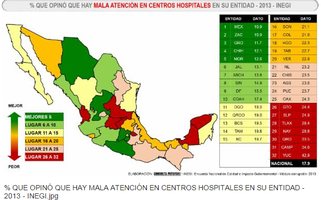 El Estado de Campeche ocupa el segundo lugar nacional de ciudadanos que opinan que hay una mala atención en los hospitales, con el 34.6 por ciento, según una gráfica elaborada por la empresa encuestadora Consulta Mitofsky. Basada en el módulo Corrupción de la Encuesta Nacional de Calidad e Impacto Gubernamental, hecha por el Instituto Nacional de Geografía y Estadística (Inegi) en 2013, la gráfica coloca a Yucatán en el primer lugar, con el 42.9 por ciento. CAMPECHE, Cam. 26 de octubre.- El Estado de Campeche ocupa el segundo lugar nacional de ciudadanos que opinan que hay una mala atención en los hospitales, con el 34.6 por ciento, según una gráfica elaborada por la empresa encuestadora Consulta Mitofsky. Basada en el módulo Corrupción de la Encuesta Nacional de Calidad e Impacto Gubernamental, hecha por el Instituto Nacional de Geografía y Estadística (Inegi) en 2013, la gráfica coloca a Yucatán en el primer lugar, con el 42.9 por ciento. El promedio nacional de los ciudadanos que se dijeron inconformes con la atención en los nosocomios fue de 17.9 por ciento, casi la mitad de los campechanos que opinaron de esta manera. Recientemente, el 17 de octubre, Paginabierta publicó que en el hospital “Manuel Campos” no hay material para hacer radiografías y que estaban aplazando la atención de los pacientes que requieren de este servicio o los estaban enviando a otros nosocomios. También, el 23 de octubre, este medio de comunicación dio a conocer la muerte una anciana en la sala de espera del hospital del Instituto Mexicano del Seguro Social (IMSS) del Centro, por no haber sido atendida a tiempo.