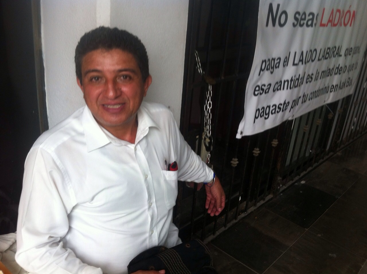 En su segundo día encadenado a las puertas de la Junta Local de Conciliación y Arbitraje, Ricardo Raúl Poot Montejo, ex comisionado de Cultura del Ayuntamiento de Champotón, insistió en su demanda al alcalde José Luis Arjona Rosado, quien se ha negado a cumplir con la sentencia de juicio laboral y pagarle más de dos millones y medio de pesos. El ex funcionario revela que en más de 30 horas de encadenamiento, nadie se ha acercado para un diálogo, y reiteró que él está abierto a todo tipo de negociaciones, pero no bajo los condicionamientos del secretario de Gobierno, Roberto Sarmiento Urbina Por Ronny Aguilar CAMPECHE, Cam. 28 de octubre.- En su segundo día encadenado a las puertas de la Junta Local de Conciliación y Arbitraje, Ricardo Raúl Poot Montejo, ex comisionado de Cultura del Ayuntamiento de Champotón, insistió en su demanda al alcalde José Luis Arjona Rosado, quien se ha negado a cumplir con la sentencia de juicio laboral y pagarle más de dos millones y medio de pesos. El ex funcionario dijo que en más de 30 horas de encadenamiento, nadie se ha acercado para un diálogo, y reiteró que él está abierto a todo tipo de negociaciones, pero no bajo los condicionamientos del secretario de Gobierno, Roberto Sarmiento Urbina. “Hoy mi abogado me comenta que Ramón Rosas, director de Trabajo, se acercó para decirle que me convenciera de que me retirara, que si no, él iba a entrar a como dé lugar, eso nos habla de la soberbia, de la falta de tacto y oficio político”, expresó. “Quieren que yo me desencadene y acuda a la Secretaría de Gobierno, pero ya les dije que tengo representante legal y que mi abogado bien puede hablar con ellos y yo me quedo aquí y él me puede mantener informado, lo único que quiero es que se cumpla con la ley, no pido que me paguen todo de golpe, pero que haya la intención de abonar al problema, estamos abiertos a negociar, hay Ayuntamientos que no tienen dinero, pero en este caso, no se ve ni la voluntad”, puntualizó. Poot Montejo denunció que los empleados de la Junta Local intentaron este mediodía entrar por la oficina de junto, que pertenece a la Secretaría de Desarrollo Social, que hay un cristal que se interpone entre las dependencias solamente y que se llevó, incluso, a una persona  que trabaja con cristales para que remueva éste y pudieran entrar. “Me di cuenta y les dije que es un delito, porque no es parte de esta oficina y es parte de otra dependencia, para eso se necesita autorización del titular y yo en verdad, espero que Miguelito no haya autorizado este tipo de acciones, es lamentable lo que están haciendo”, indicó. En horas de la tarde, Poot Montejo reportó que ya se había consumado la entrada de los trabajadores de la Junta de Conciliación por el cristal de la Sedesor, lo cual es la prueba del sucio proceder de las autoridades, que buscan formas de no solucionar los conflictos. Asimismo, informó que ya hubo un acercamiento de la Comisión de Derechos Humanos del Estado de Campeche, misma que el día de mañana se comprometió a mandar a su visitador para verificar la condición física y tomar nota del proceso de huelga, con el paso de los días.