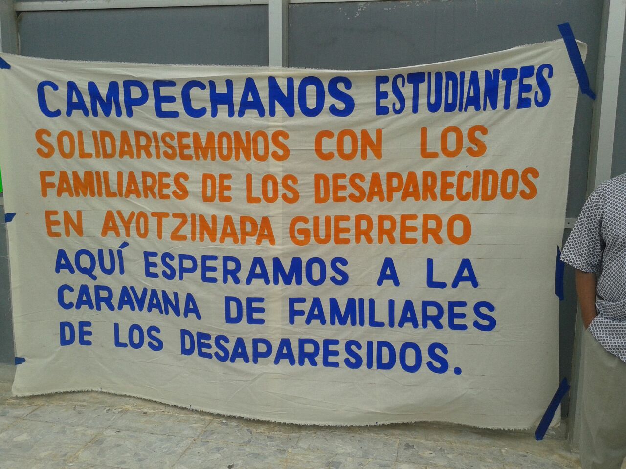 Tres solitarios manifestantes desplegaron una manta frente al Congreso del Estado, en apoyo al reclamo de los familiares de los 43 estudiantes normalistas desaparecidos de Ayotzinapa. Los protestantes informaron que se está buscando el vínculo para que la caravana nacional tome en cuenta a Campeche y puedan sumarse a la exigencia mundial de justicia. Por Ronny Aguilar CAMPECHE, Cam. 18 de noviembre.- Tres solitarios manifestantes desplegaron una manta frente al Congreso del Estado, en apoyo al reclamo de los familiares de los 43 estudiantes normalistas desaparecidos de Ayotzinapa, e informaron que se está buscando el vínculo para que la caravana nacional tome en cuenta a Campeche y puedan sumarse a la exigencia mundial de justicia. Alvaro Omar Chiquini Cu se plantó, en compañía de dos personas más, y declaró que el pueblo campechano está como dormido, pero que es necesario que despierte, por lo que están buscando que los familiares de los desaparecidos vengan al Estado, en conjunto con la caravana, y así poder sumarse a ella. “Nosotros nos sumaremos a la caravana, vamos a generar el vínculo del día y la hora de llegada a Campeche y nosotros marcharemos con ellos, en petición de la justicia que demandan padres y ciudadanos agraviados con esta acción que viene desde el gobierno, sin lugar a dudas”, expresó. “Estamos haciendo pública nuestra solidaridad y petición de justicia y esclarecimiento del caso de los 43 desaparecidos en Guerrero, queremos que el gobierno federal dé una respuesta concreta sobre este delito sobre los normalistas”, indicó. “Esto está ocasionando el levantamiento del país y la generación de más violencia y si el gobierno no quiere que lleguemos al estallido social, de una vez debe poner en claro las cosas y hacer justicia”, puntualizó.