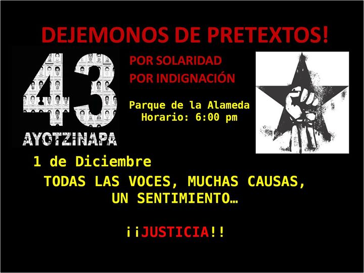 Ciudadanos campechanos se sumarán al llamado nacional, por lo que convocaron a la ciudadanía para participar en la marcha de este lunes primero de diciembre, a partir de las seis de la tarde. Exigencia de que se esclarezca el caso de los normalistas desaparecidos de Ayotzinapa y la renuncia del priísta Enrique Peña Nieto a la Presidencia de la República. Por Ronny Aguilar CAMPECHE, Cam. 30 de noviembre.- Ciudadanos campechanos se sumarán al llamado nacional, por lo que convocaron a la ciudadanía para participar en la marcha de este lunes primero de diciembre, a partir de las seis de la tarde, en exigencia de que se esclarezca el caso de los normalistas desaparecidos de Ayotzinapa y la renuncia del priísta Enrique Peña Nieto a la Presidencia de la República. Mediante redes sociales, el Consejo del Poder Popular anunció que el primer día de diciembre, realizará una marcha, en demanda de que aparezcan los 43 estudiantes de la Escuela Normal Rural de Ayotzinapa y la renuncia de Peña Nieto a la Presidencia de la República. Esta fecha es emblemática, pues se cumplen dos años de que tomó posesión “El Copetes” de la Presidencia y dos años de que reprimió brutalmente a mujeres, hombres, niños, ancianos, periodistas y estudiantes, que no estaban de acuerdo en que él fuera el jefe del Ejecutivo federal. La marcha se convocó a las seis de la tarde y partirá de las inmediaciones del parque de La Alameda, a un lado del mercado “Pedro Sáinz de Baranda”, y en caso de ser posible, se sugiere portar veladoras, pancartas y ropa negra.