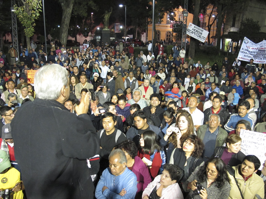 El presidente del Consejo Nacional de Morena, Andrés Manuel López Obrador, manifestó su desacuerdo en torno a que se use la fuerza para reprimir a los ciudadanos, a los jóvenes y a los manifestantes en la Ciudad de México. El ex candidato presidencial negó ser cómplice de las injusticias, porque hay cosas que no le parecen y ejemplificó con su pronunciamiento en contra del aumento del precio del boleto del Sistema de Transporte Colectivo-Metro. CIUDAD DE MEXICO, D.F. 5 de diciembre.- El presidente del Consejo Nacional de Morena, Andrés Manuel López Obrador, manifestó su desacuerdo en torno a que se use la fuerza para reprimir a los ciudadanos, a los jóvenes y a los manifestantes en la Ciudad de México y negó ser cómplice de las injusticias, porque hay cosas que no le parecen. Al ejemplificar que se manifestó en contra, como fue el caso del aumento del precio del boleto del Sistema de Transporte Colectivo-Metro, López Obrador rechazó lanzarse en contra del jefe de Gobierno del Distrito Federal, Miguel Ángel Mancera, porque lo que más le interesa es que se mantengan los programas sociales. El político de izquierda señaló que al titular del GDF, “le he dicho que si quiere pleito, que quite los programas sociales, y va a haber pleito, mientras se mantengan los programas sociales, ahí la llevamos”. Insistió en que la transformación del país será de manera pacífica, porque la mafia del poder quiere que Morena caiga en la trampa de la violencia, pero para nada, no se va a ir a que el pueblo se enfrente al mismo pueblo, y es necesario tomar en cuenta que los policías, los marinos, los soldados, son pueblo uniformado, son hijos de campesinos, de obreros. Alertó que si hay una revuelta, una confrontación, los responsables de la tragedia nacional se irían a sus mansiones, que ya tienen en el extranjero, a sus yates de dos mil 500 millones de pesos, barcos de gran lujo, que ni siquiera navegan en mares de México. Andrés Manuel expresó que así como el priista Enrique Peña Nieto es el culpable de la tragedia nacional y todos gritan: ¡Fuera Peña!, ¡Fuera Peña!, también hay que tomar en cuenta que la crisis que padece México es responsabilidad de quienes impusieron a Peña, porque al final de cuentas, “es un pelele, es un títere al servicio de la mafia del poder”. Dio a conocer la estrategia de Morena: “seguir despertando a la gente” y se va bien, porque nunca había habido tanta gente despierta como ahora, y ya se llevan años en la lucha, pero según una encuesta, ya se arrepintieron la mitad de quienes votaron por Peña Nieto en el 2012. “Morena apuesta a que si hace dos años se logró 16 millones de votos, si se sigue orientado al pueblo de México, para el 2018 o antes, se contará con el apoyo de 25, 30 millones de mexicanos y cuando se logre, a la mafia del poder no le servirá ninguna trampa, ningún fraude y se logrará la transformación del país”, expresó. Pidió a los ciudadanos a entender la lección de que “el peor de los ladrones es el político corrupto y nada ha dañado más a México que la deshonestidad de los gobernantes. Y eso tiene que dar fuerza y seguridad para luchar por el cambio”. Aseguró que sí se puede sacar adelante al país, porque tiene abundantes riquezas y recursos naturales, así como un pueblo extraordinario y un ejemplo claro son los paisanos que se van a buscar una mejor vida en la frontera, son quienes financian el desarrollo del país, porque envían cada año 24 mil millones de dólares a sus familiares. “No es que no haya riquezas, no es que no tengamos un pueblo trabajador, el problema de México es la corrupción, porque hay inclusive presupuesto suficiente de cuatro billones 600 mil millones de pesos”, indicó Expuso que solo con un gobierno honrado, limpiar de corrupción a los gobiernos, cortar con los privilegios de los altos funcionarios, evitar el robo del 10 por ciento del presupuesto, se lograrían obtener ahorros para el desarrollo del país. Mafia de poder administra la ignorancia En otro tema, Andrés Manuel López Obrador hizo un llamado a las y los promotores de la defensa de la soberanía nacional en Azcapotzalco que visiten, casa por casa, hablen e informen a la gente, porque aunque se viva en la capital, donde están concentrados la mayoría de los medios de información, hay muchas cosas que no se saben y ello se debe al control que ejerce los potentados entre los diarios, las radios y la televisión. Desde la Plaza Cívica de la colonia Adolfo López Mateos de la delegación Azcapotzalco, comentó que la mafia del poder no se derrumba, porque tiene dos pilares: la compra del voto y el control de los medios de información, porque si la gente se hubiese informado, como se dice coloquialmente, otro gallo cantaría, pero denunció que a él no lo invitan a una entrevista. “Y no crean ustedes es que yo no quiero o no acepto, es que en Televisa estoy vetado, Azteca igual, en la radio lo mismo, a veces dos programas de radio me dan oportunidad, nada más como si no existiéramos, porque ellos dominan de esa manera, administrando la ignorancia en el país”, sostuvo. Reveló que quienes integran la mafia del poder – mismos que aparecen en la lista de los hombres más ricos del mundo— son los dueños de los medios de comunicación más influyentes de México y el 80 por ciento de los mexicanos se enteran de las noticias por la televisión, la cual está monopolizada. Planteó que hace falta informar, porque los potentados controlan a los medios de la información y los datos de la casa blanca de Enrique Peña Nieto, valuada en 85 millones de pesos, no se sabe, porque Televisa no dice nada, López Dóriga, Loret de Mola, gritan como pregoneros cuando se trata de cuestionarlo, de criticarlo, pero callan como momias cuando se trata de defender a la mafia del poder. Televisa, explicó, tuvo que hacer algo sobre la casa de Enrique Peña, la señora de Peña informó nada más