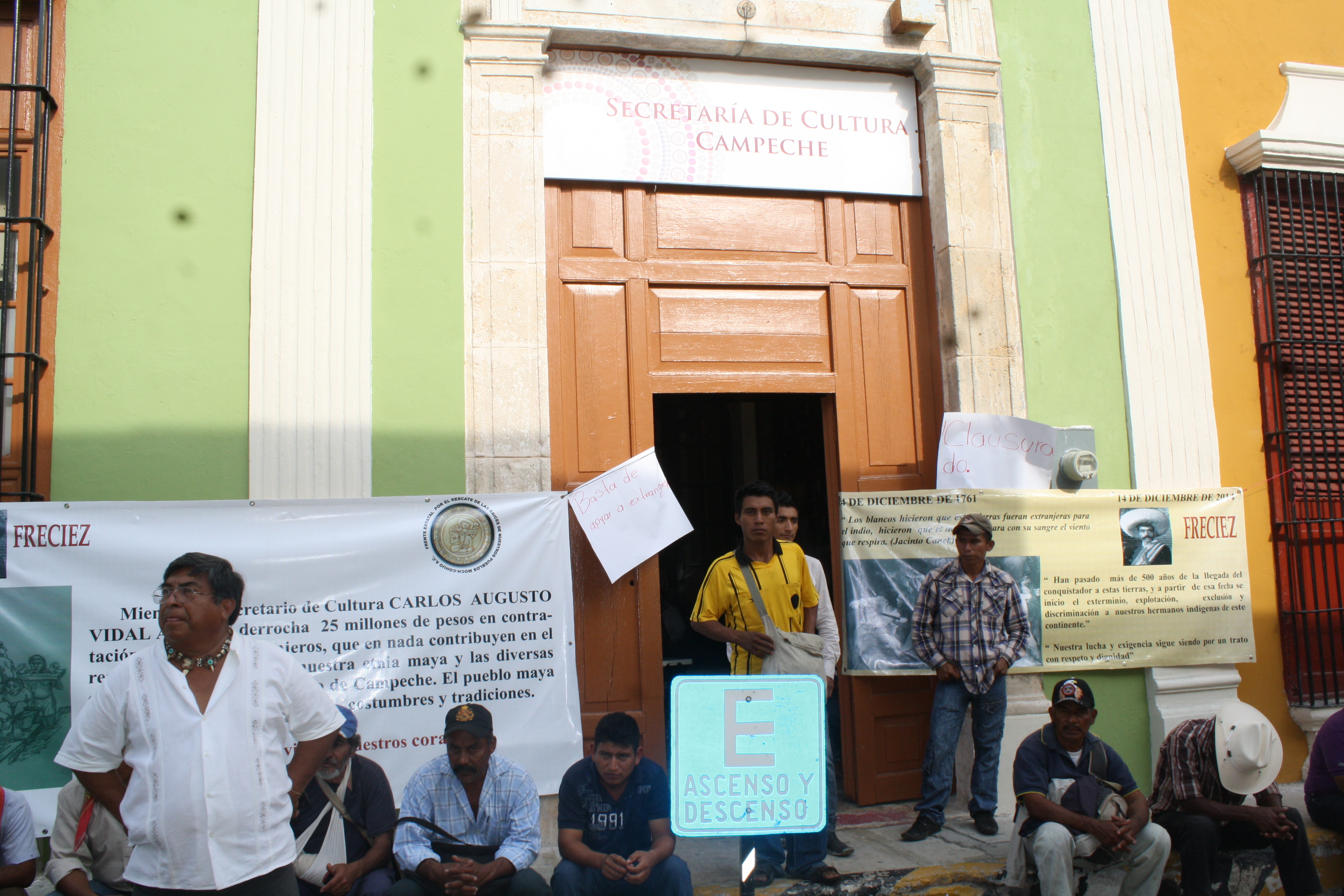 Los inconformes manifestaron estar hartos de que el secretario Carlos Vidal derroche millones de pesos en artistas extranjeros, como Ricky Martin, y no se dé espacio a la cultura local, en un claro acto discriminatorio de los orígenes mayas. Por Ronny Aguilar CAMPECHE, Cam. 12 de diciembre.- El dirigente del Frente Campesino Independiente “Emiliano Zapata” (Freciez), Luis Antonio Che Cu, en compañía de campesinos y artesanos, tomaron las instalaciones de la Secretaría estatal de Cultura y manifestaron estar hartos de que derrochen millones de pesos en artistas extranjeros, como Ricky Martin, y no se dé espacio a la cultura local, en un claro acto discriminatorio de los orígenes mayas. Alrededor de las dos de la tarde, el líder campesino arribó a las instalaciones de la Secretaría de Cultura, a cargo de Carlos Vidal Angles, y de manera pacífica, sus acompañantes ingresaron al local y se instalaron dentro y fuera de la dependencia, permitiendo que los ciudadanos abandonaran el lugar, pero nadie más pudo ingresar. “Ya estamos cansados de esta política de exclusión y discriminación que hay contra nuestras gentes, las expresiones independientes aquí en esta Secretaría, no tienen cabida, aquí el secretario derrocha recursos que no son de él, son del pueblo y no es posible que contrate extranjeros, cuando hay tantas necesidades en nuestras comunidades, no hay medicamentos en las casas de Salud, no hay luz, no hay caminos, no hay agua y se nos hace una grosería que el secretario Vidal Angles gaste 25 millones para traer a Ricky Martin y para un español, que en nada contribuyen al rescate de nuestra identidad, que tanto cacarean nuestros políticos”, expresó Che Cu. Indicó que siempre piden apoyos para los festivales que realizan, pero la Secretaría ignora dichas festividades, por lo que dijo que se quedarán dos días en las instalaciones, y no será sino hasta el domingo, a las ocho de la mañana, cuando liberen estas instalaciones y solo porque el domingo tendrán una celebración en el centro ceremonial maya de Edzná. Asimismo, comunicó que después de la celebración en el centro ceremonial, tomarán sus autobuses con personas de distintas comunidades del estado, para acudir a Ayotzinapa, Guerrero, pues recolectaron recursos que les entregarán a los estudiantes, atendiendo al llamado hecho en días anteriores por los normalistas. Manifestó que el dinero que se les donará a los estudiantes, es lo que se logró recolectar en las comunidades del estado. NO beneficia en nada Día Nacional de la Cultura Maya Luis Antonio Che señaló, por otra parte, que la declaración del Día Nacional de la Cultura Maya, aprobado en comisiones del Senado de la República, en nada beneficia realmente al rescate de los pueblos, ni elimina la política de discriminación. “Creen que con sus nombramientos van a eliminar los problemas que existen, el problema de raíz es la falta de oportunidades y que justamente no se den los espacios a nuestros hermanos, el desempleo y la corrupción prevalecen en las zonas marginadas de nuestro estado, el reconocimiento a nuestra etnia maya solo es eso, un reconocimiento, las políticas de exclusión aún prevalecen aun después del nombramiento”, puntualizó.
