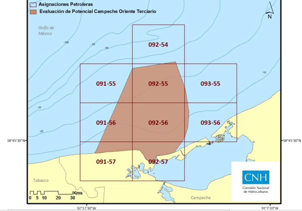 El Campeche Oriente Terciario Según el documento de la Comisión Nacional de Hidrocarburos (CNH), “el Proyecto de Exploración Evaluación del Potencial Campeche Oriente Terciario se localiza en aguas territoriales de la Plataforma Continental del Golfo de México, frente a la costa del estado de Campeche y representa la porción marina hacia el norte de la Cuenca de Macuspana”. “Está limitado al norte y al oriente por el Proyecto Campeche Oriente, al sur por la línea de costa del estado de Campeche y al poniente por los Proyectos Campeche Poniente y Crudo Ligero Marino, y cubre un área de dos mil 875 kilómetros cuadrados”, añade. Detalla que de acuerdo a la documentación presentada por Pemex, el proyecto tiene como objetivo evaluar reservas de gas húmedo, con un volumen que varía de 40 millones de barriles de petróleo crudo equivalente en el percentil 10, a 256 millones en el percentil 90; con un valor medio de 127 millones de barriles de petróleo crudo equivalente, en rocas terrígenas de edad Terciaria, en el período 2020-2023. “El proyecto considera la perforación de 17 pozos exploratorios y la realización de 12 estudios geológicos, con una inversión total exploratoria de ocho mil 159 millones de pesos”, cita. Afirma que “debido al poco avance que se tiene en el proceso exploratorio, a la similitud en características geológicas de sus objetivos y a la dimensión de su área geográfica, se considera como una sola área prioritaria de evaluación de recursos prospectivos de gas denominada Akalán”. La alternativa escogida por la CNH de las presentadas por Pemex para este proyecto, está la que abarca la exploración en las áreas occidental, central y oriental de la Cuenca de Macuspana, en su porción marina. “La estrategia es privilegiar la exploración en la porción occidental mediante la perforación de cinco pozos exploratorios, considerando su ubicación como una área de bajo riesgo geológico y de alta eficiencia de migración, manifestado en los éxitos de los pozos Chukua-1, Mots-1 e Isiw-1”. Asimismo, se espera determinar la extensión lateral del play Plioceno Superior–Pleistoceno, donde fueron productores”, indica. “También se considera la evaluación del potencial petrolero en el borde oriental, mediante la perforación de cinco localizaciones, favoreciendo el potencial petrolero en estos sectores del proyecto y probar la prospectividad y potencialidad de los plays Mioceno Superior, Plioceno y Plioceno Pleistoceno”, menciona. “En la porción central de la cuenca se considera la perforación de siete localizaciones exploratorias para evaluar el potencial petrolero en los plays Plioceno Inferior y Mioceno Superior, para ello, previamente se requiere la revaluación de la información existente de los resultados postperforación de los pozos Malah-1, Ikim-1, Samal-1 y Xotem-1, así como estudios de plays, inversión sísmica, AVO y actualización de oportunidades en esta porción del proyecto”, asevera. Asegura que “el tipo de hidrocarburo que se espera encontrar en los plays antes descritos es de gas húmedo y condensado, se toman como base los campos análogos de la Cuenca de Macuspana, en la porción terrestre, como son José Colomo, Narváez, Xicalango, Shishito y Vernet, así como los análogos del proyecto Crudo Ligero Marino (Chukua-1, Mots-1 e Isiw-1), estos hidrocarburos provienen de las rocas generadoras del Tithoniano o entrampamientos prexistentes del Cretácico”.
