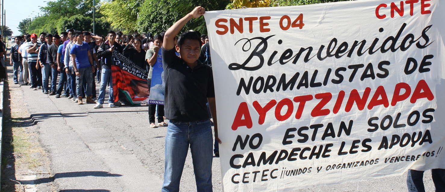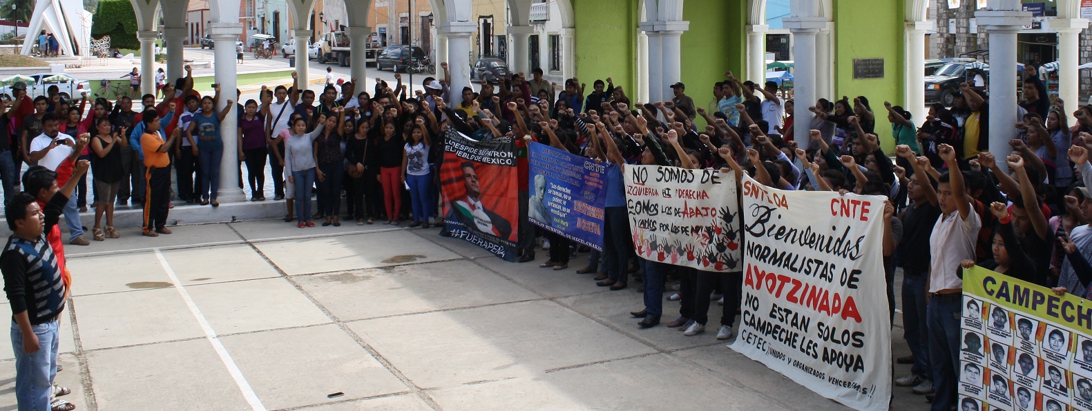 Por Ronny Aguilar HECELCHAKAN, Cam. 17 de diciembre de 2014.- Estudiantes de Escuela la Normal Rural “Justo Sierra Méndez marcharon por las calles de esta ciudad, encabezados por normalistas de Ayotzinapa, Guerrero, y realizaron un mitin en el Palacio Municipal, donde exigieron la presentación con vida de sus 43 compañeros desaparecidos desde el 26 de septiembre. Alrededor de las 10:15 horas, tal y como estaba programado, se realizó un marcha, encabezada por los tres estudiantes de la Escuela Normal Rural “Raúl Isidro Burgos”, de Ayotzinapa, Guerrero, quienes lanzaron consignas, que posteriormente fueron repetidas por los normalistas locales.