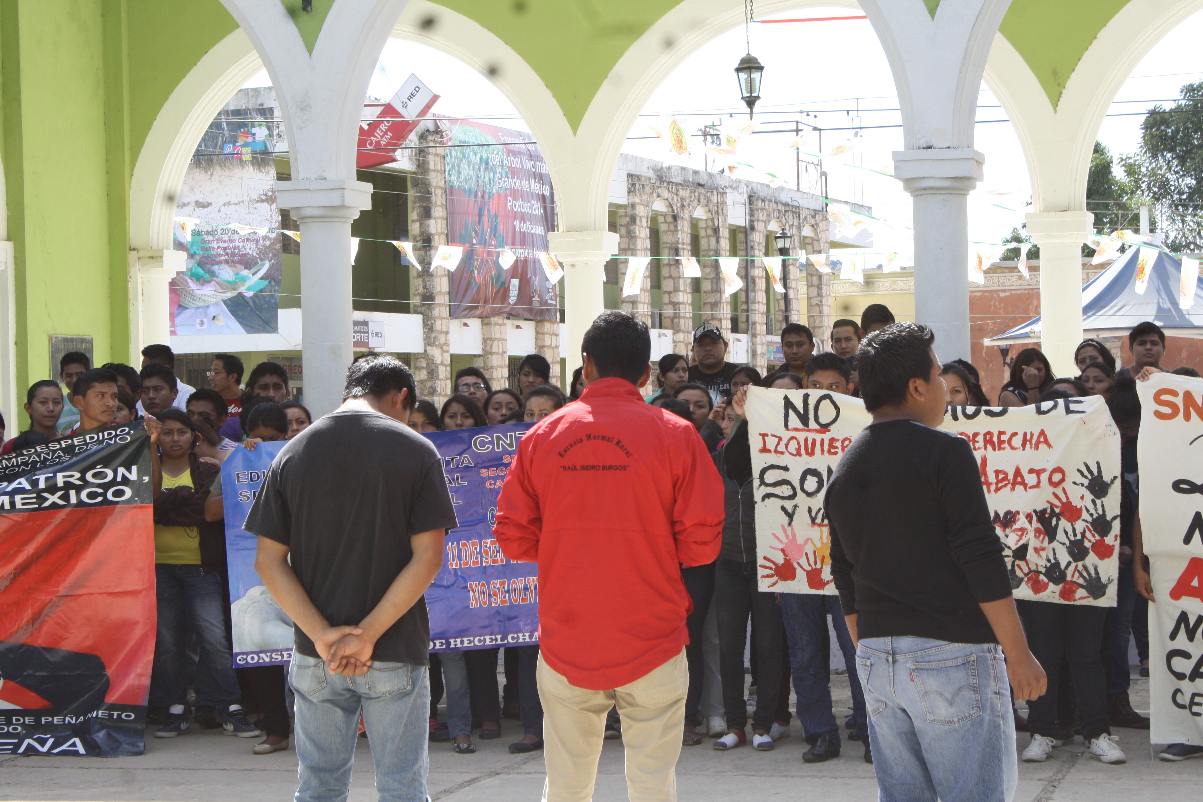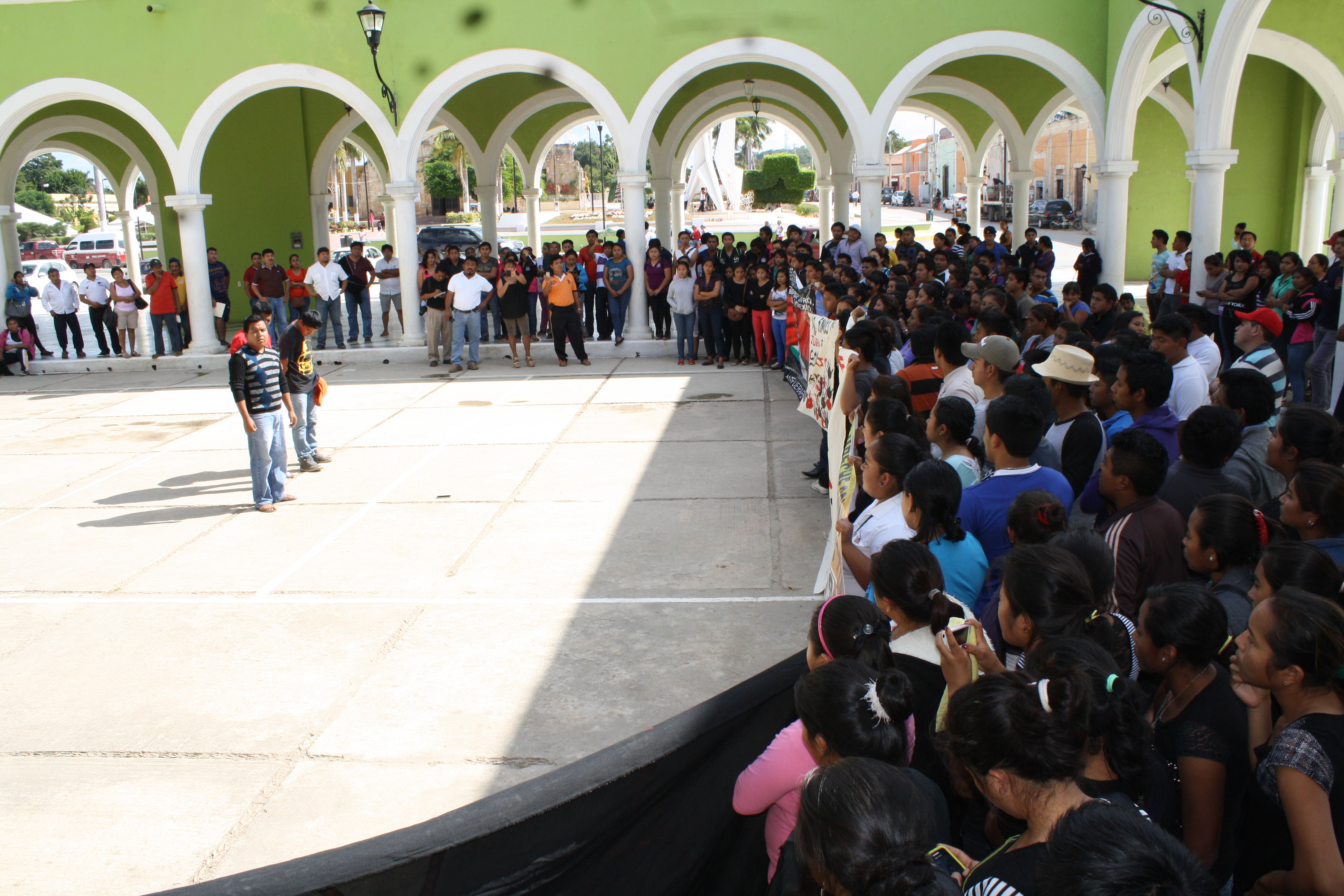 Al llegar al Palacio Municipal, los tres jóvenes de Ayotzinapa pasaron al frente y dando la espalda, pidieron a sus compañeros normalistas y al pueblo campechano, solidaridad con la lucha que emprendieron a nivel nacional. “Estamos aquí para exigir justicia por nuestros 43 compañeros que desaparecieron el día 26 de septiembre, a manos de los tres niveles de gobierno, tanto municipal, estatal, como federal y ahora vienen a decirnos que quieren paz, cuando hay 43 compañeros desaparecidos, son 43 estudiantes, son 43 futuros, son 43 familias que están llorando y se atreve a decir el procurador (Jesús Murillo Karam) que ya se cansó, acaso se preguntan cómo están los padres de los desaparecidos, hay algunos compañeros que ya tienen hijos, acaso se preguntan cómo están esas familias”, cuestionaron.