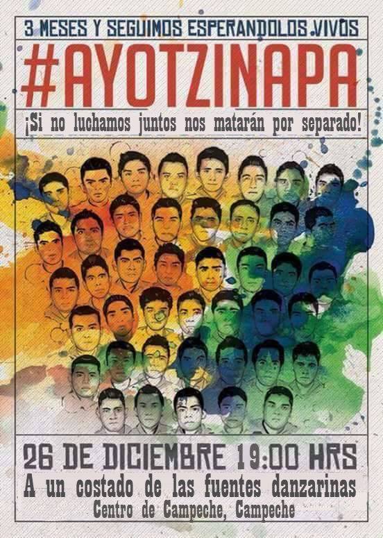 CAMPECHE, Cam. 24 de diciembre.- El Consejo del Poder Popular convocó para una manifestación en las Fuentes Danzarinas, en el centro histórico de la capital campechana, a partir de las 19:00 horas del viernes 26 de diciembre, a tres meses de la desaparición forzada de los estudiantes de la Escuela Normal Rural de Ayotzinapa, Guerrero. El organismo civil llamó a apoyar, llevando una veladora o cobertores, para hacerlos llegar a los familiares de los estudiantes normalistas afectados.