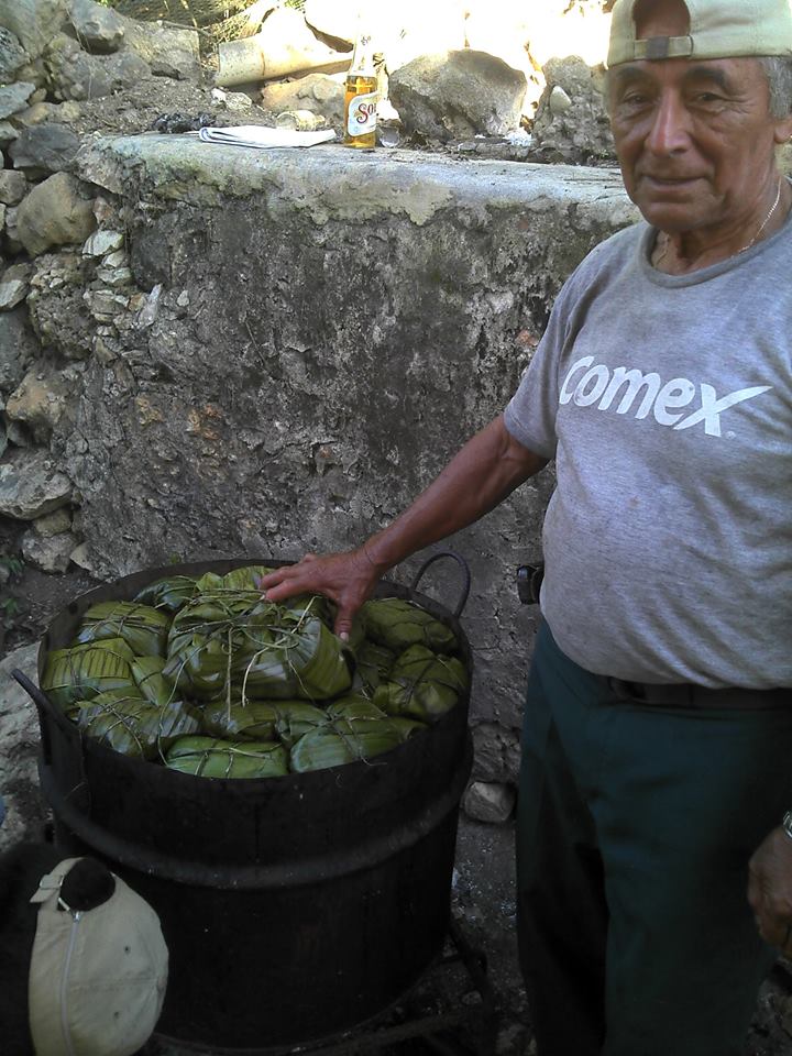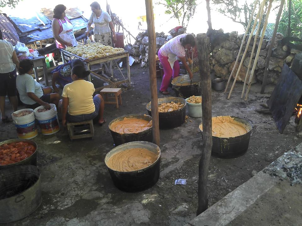 Con los cerdos que se sacrifica en los patios de la casa sede del festejo principal, se prepara la comilona de este día que consiste en: chicharrón, castakán y puyul; mientras que la carne, huesos, costillas, codillos, pezuña y demás, se divide en partes para los guisados de: Frijol con puerco (día uno), tamales y cochinita enterrada (día dos) y pavo en relleno negro y carne adobada, acompañada del k’ol para el último día. Vale la pena mencionar que ahí mismo, en el traspatio de la casa, se elaboran todos los guisos en una improvisada gran cocina, con mesas rústicas, peroles, tambores y gigantescas cacerolas. Ahí pudimos observar cómo las mujeres se esmeran preparando todos los utensilios desde días antes. Para esto, ya fue amontonada en orden la suficiente leña, unas dos mil rajas, y los tres costales de maíz de la primera cosecha. Aquí mismo se prepara el nixtamal, con agua y sal en los barriles de metal puestos en el fuego con harta leña, hasta que esté bien cocido (tzaká). Posteriormente es molido para obtener la masa que servirá para preparar los tamales y el k’ol. Para esto, desde las primeras horas de la tarde llegan las familias enteras participantes en el festejo y se distribuyen en dispersos toldos, mientras un grupo musical ameniza el ambiente. El Frijol con puerco cocinado en cantidades industriales, se sirve a diestra y siniestra. Por la tarde, ya oscureciendo, con la masa, puerco crudo adobado con achiote y envueltos en gigantescas hojas de plátano, se elaboran los tamales de un tamaño mayor al convencional. Éstos se colocan al vapor en unos enormes tambores de uso apícola, distribuyéndolos en su interior en forma circular y dejando un hoyo en medio, donde deposita un gran tamal especial -llamado “La Tapa”-, cuyos ingredientes son exclusivamente las pezuñas del cerdo.