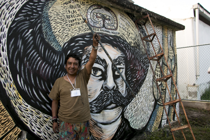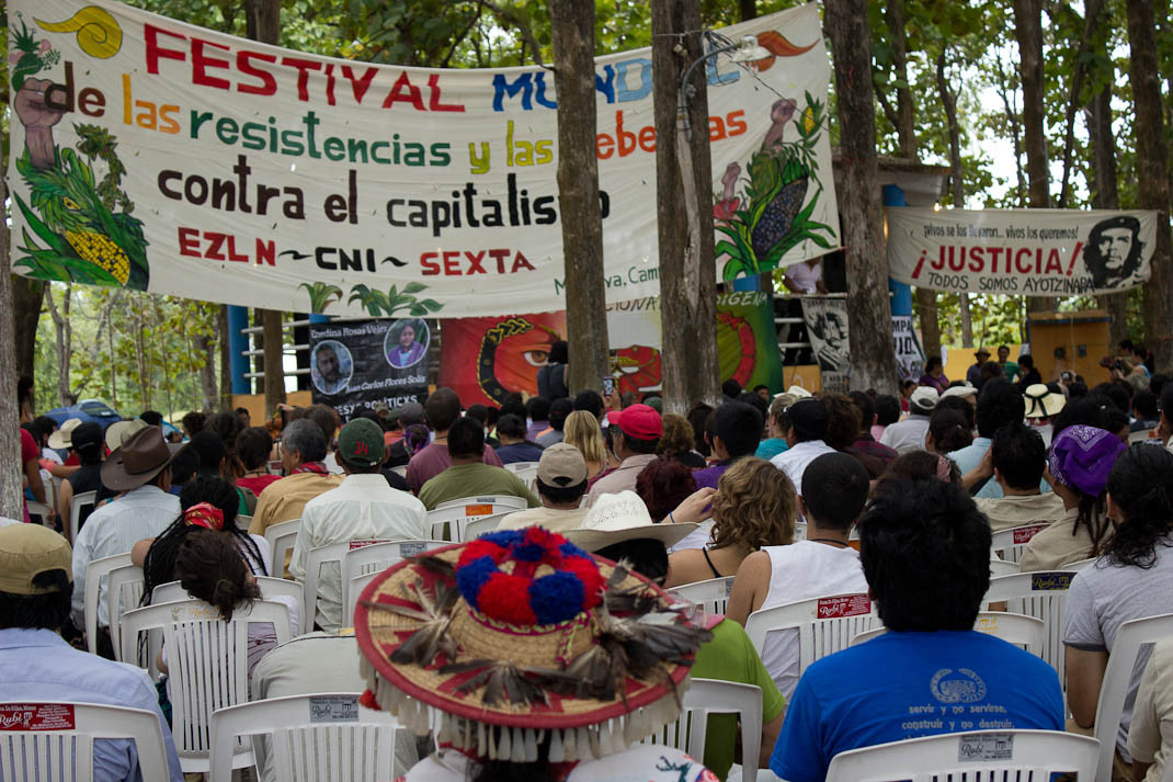 Darnos la mano y no soltarnos Tras la llegada de la caravana del Congreso Nacional Indígena (CNI) y los integrantes de la Sexta nacional e internacional, se inaugura el festival, tal como fue anunciado por la comandancia del Ejército Zapatista de Liberación Nacional: los padres y madres de familia de los normalistas de Ayotzinapa encabezan las comparticiones, desde su dolor y su fuerza hablan uno a uno. Sus rostros pronostican una lucha de largo aliento, que irá forjándose gracias a la unión de las otras luchas, las que estuvieron enlodadas y enterradas por mucho tiempo, para ahora encontrarse y mirarse de frente cual espejo. «Nosotros somos las autodefensas de nuestras tierras, nunca hemos dejado de ser raíz, árbol, fruto…han florecido nuestras rebeldías», fue el aprendizaje de varias palabras colectivas. La rabia a momentos se convierte en llanto, de los padres, de las madres, de nosotros, hasta que por fin, las nubes también lloran; la compartición es pausada, mientras la lluvia arrecia, lavando tanto dolor, las gruesas gotas caen refrescando el calor que emana de una tierra verde y llena de vida, nuestro sur nos escucha y latimos con él. La palabra sería la materia en bruto para la compartición de luchas y rebeldías; con «corazón abierto» transmitieron a través de sus palabras, desde su lengua, desde su visión del mundo, los dolores de sus pueblos, los sinsabores de sus comunidades que han sido despojadas de sus riquezas, arrancando sus costumbres y tradiciones por un sistema económico político y cultural depredador, como lo es el capitalismo dentro de la vertiente neoliberal. Comienza la compartición y en cada intervención del CNI, pueblos y luchas indígenas, aún se percibe la herencia de aquella antigua costumbre de valorar todo a partir de un documento escrito y sellado. Por eso, en los morrales y bolsas de nylon, guardan los títulos de propiedad acumulados desde tiempos coloniales. El pasado no sólo viaja en la memoria o en las luchas, también viaja en el equipaje de personas de morena piel. El pasado del país. Para esperar que pase la lluvia y calmar los corazones doloridos tomamos un vaso de pozol en la cancha del pueblo, unos a resguardo de la lluvia, otros disfrutando sentir el agua lavar las penas y convertirse en rabia y fuerza para seguir caminando. De pronto, la lluvia cede a un sol que refleja en los árboles la belleza de un pueblo digno.