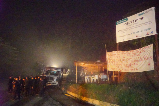 Ahí se les preguntó si el campamento había sido desalojado con violencia, a lo que contestaron que no. Al costado de ellos, con la poca luz que los faros de los camiones proyectan, se ve una manta que dice: Adherentes a La Sexta Declaración de la Selva Lacandona de San Sebastián Bachajón recuperan su territorio, respeto a los derechos a la libre determinación y al territorio de los pueblos indígenas. No al despojo. Apoyo a Ayotzinapa Más adelante, en el camino de Nahilte, km 115, se encontraban estacionados diez camiones de policía. También había un número indeterminado de policías junto a un banco de grava que está en poder del Comisariado ejidal –de tendencia oficialista– Alejandro Moreno Gómez, en el km 100, al igual que en el crucero de Agua Clara. Representantes de La Sexta de Bachajón denunciaron el señalamiento de sus domicilios por parte de Jeremías Cruz Hernández, de la comunidad de Xanil, quien trabaja con la policía estatal y de Francisco Jiménez Hernández, de la misma comunidad.