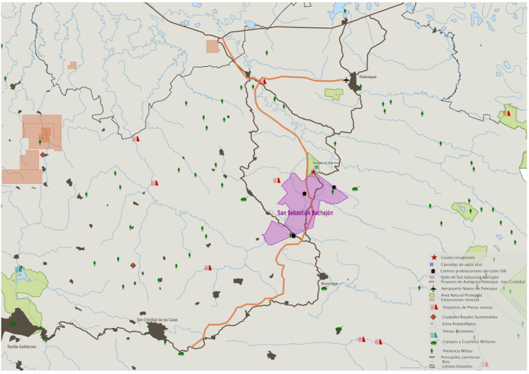 Mapa de la región en donde se muestra no sólo la ubicación del territorio de Bachajón sino las presas, los cuarteles militares y algunas de las concesiones ya existentes de mega proyectos. En otra investigación volveremos a este mapa y lo detallaremos más. Los adherentes dijeron a estos medios que temen por sus vidas haciendo referencia a los asesinatos de los coordinadores de La Sexta en Bachajón, Juan Vázquez Guzmán (asesinado en 2013) y Juan Carlos Gómez Silvano (asesinado en 2014) y también temen detenciones como las de Roberto Gómez Hernández, Juan Antonio Gómez Silvano y Mario Aguilar Silvano, detenidos ilegalmente el pasado mes de septiembre de 2014. Pidieron a medios y personas solidaras estar atentos al comunicado que emitieron este este sábado.