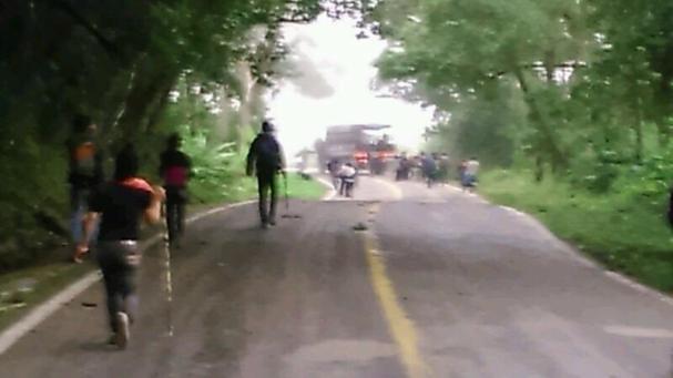Las balas hablan Tras la cobertura realizada por esta comisión de medios libres, otro suceso violento aconteció la mañana de este domingo. Alrededor de las 6:30 de la mañana, adherentes a La Sexta de Bachajón bloquearon el crucero de las cascadas de Agua Azul y en respuesta, la policía –que aún permanecía en el lugar y en los alrededores– disparó contra las y los indígenas tseltales que no portaban arma alguna. Mientras unos elementos policiacos colocaron una barricada compuesta de árboles, aproximadamente a 500 metros del crucero mencionado, otros dispararon.