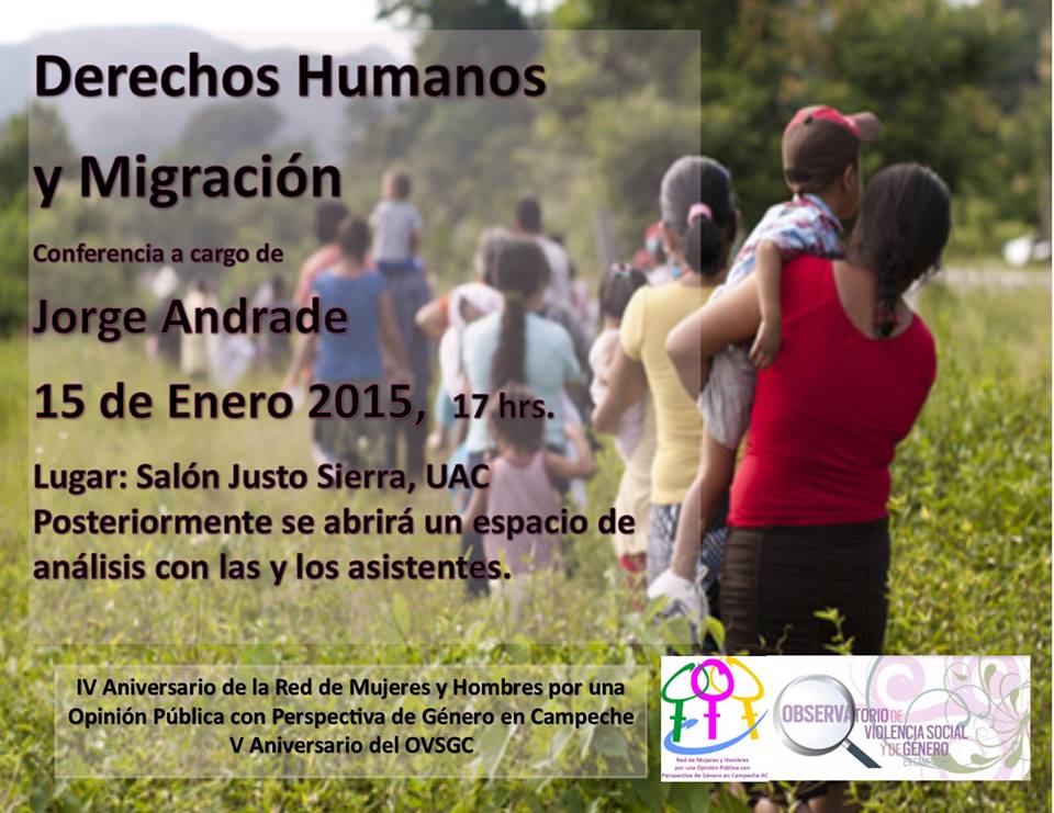 Actividades con motivo del V aniversario del Observatorio La primera actividad contemplada es la conferencia “Derechos Humanos y Migración”, impartida por el antropólogo social, Jorge Andrade, investigador del Instituto para la Seguridad y la Democracia, A.C. (Insyde), catedrático de la UNAM, es defensor de derechos humanos ligado a la defensa de personas migrantes en tránsito, principalmente en el Estado de México, quien coordinó el albergue San José en Huehuetoca, Estado de México y cofundador del Colectivo Ustedes Somos Nosotros. Esta conferencia se realizará a las 17:00 horas, en el salón “Justo Sierra Méndez”, de la Universidad Autónoma de Campeche (UAC). Al concluir, se efectuará un panel en el que participarán Jorge Andrade, Víctor Collí Ek, analista en derechos humanos, y Argentina Casanova, especialista en temas de género. La idea de esta actividad es impulsar el tema de la migración en la entidad, siendo que el estado es el único en el país que comparte la frontera con dos países, como Belice y Guatemala, y que es un estado de tránsito de migrantes que cruzan el país, la mayoría con destino a Norteamérica. El Observatorio considera importante impulsar el tema en la opinión pública, dado que en nuestro país se comenten sistemáticamente violaciones a los derechos humanos de las personas migrantes, sean o no nacionales. También se considera necesario empezar a hablar del tema, tomando en cuenta que la entidad ha recibido a personas de otras entidades y países, asentados desde hace varias décadas en nuestro territorio. En sí, la idea es visibilizar la situación que viven las personas que migran, las múltiples violaciones a sus derechos humanos. Posteriormente, para continuar con las actividades del aniversario del Observatorio, un grupo de integrantes de la organización viajará al municipio de Calakmul, para desarrollar actividades de capacitación a mujeres en materia de participación ciudadana y política, que serán observadas y acompañadas por el antropólogo Jorge Andrade, quien sostendría encuentros con algunas otras organizaciones de la sociedad civil en ese lugar. Cabe mencionar que también se realizó el domingo pasado una caravana de atención jurídica y sicológica en la cabecera municipal de Champotón, ubicándose en la colonia Tierra y Libertad. Asimismo, se iniciaron otras acciones de capacitación con mujeres de la ciudad capital, en materia de género y derechos humanos.