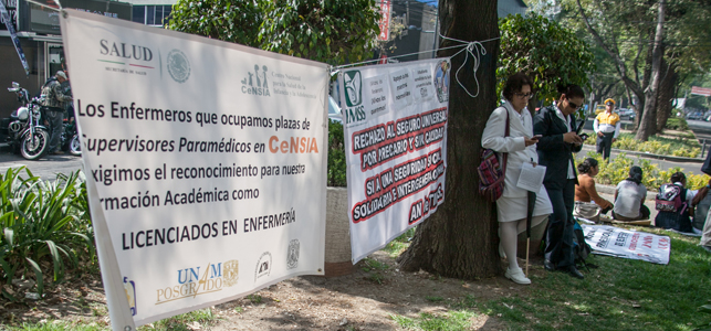 © César Martínez López La Secretaría de Salud se compromete a no hostigar a trabajadoras/CIMACFoto: César Martínez López Por Angélica Jocelyn Soto Espinosa Cimacnoticias CIUDAD DE MEXICO, D.F. 19 de enero del 2015.- La Secretaría de Salud concluyó la primera mesa de negociación con enfermeras, sin lograr un acuerdo sobre la demanda del gremio, para modificar el Programa de Promoción por Profesionalización del personal de Enfermería, Trabajo Social y de Terapia Física, a fin de hacerlo universal. Luego de una jornada de ocho horas al interior de la Dirección General de Calidad y Educación en Salud de la Secretaría, el pasado viernes 16 de enero, integrantes de la Asamblea Intergremial de Enfermeras, Trabajadoras Sociales, Terapeutas y Rehabilitadores Físicos (AIGETT) informaron que sólo consiguieron la solución concreta de uno de los cuatro puntos de su pliego petitorio. Las y los trabajadores exigen además que se otorguen garantías para las y los compañeros que integran el comité negociador; se reconozca la licenciatura de Enfermería en todas las instituciones públicas y privadas; y se dé marcha atrás a la convocatoria para la profesionalización que emitió la dependencia sanitaria. Sonia Ríos, trabajadora del Instituto Mexicano del Seguro Social (IMSS), dijo en entrevista con Cimacnoticias que tras esta primera reunión –que las enfermeras consiguieron luego de manifestarse el pasado seis de enero frente a la Secretaría de Salud– no se logró modificar el Programa de Promoción por Profesionalización del personal de Enfermería, Trabajo Social y de Terapia Física para que sea universal. La negociación de este punto se trabó porque –según argumentaron funcionarios– la Secretaría no tiene competencia para reformar el reglamento de las instituciones que no dependen directamente de la secretaría, tales como las instancias de salud privadas. Sin embargo, la enfermera aseguró que el gremio insistirá hasta garantizar las mismas oportunidades para las y los trabajadores de la salud de todas las instituciones, y lograr que la Secretaría de Salud decrete medidas para asegurar mejores condiciones laborales a todo el personal de enfermería. Sonia Ríos detalló que durante la reunión también se trataron las problemáticas que suceden en 12 entidades del país –representadas en la comisión de 38 personas que negoció con las autoridades de la salud–, y que serán analizadas en futuras mesas de diálogo. De acuerdo con la minuta de acuerdos –firmada el pasado 12 de enero por el gremio y funcionarios–, las autoridades se comprometieron a que no habrá represalias, intimidaciones ni hostigamiento contra quienes participen en la mesa de diálogo, y que “recomendarán” a otras instituciones de salud estatales y privadas que no repriman a las y los trabajadores. La Secretaría de Salud solicitará previo a cada reunión facilidades a las instituciones de salud para la asistencia y participación de los integrantes de la mesa de discusión –en las fechas que se acuerden–, para que tal participación no sea motivo de rescisiones laborales. Sobre el punto que atañe a la modificación del programa de profesionalización, la Secretaría –a través de la Comisión Permanente de Enfermería– informó que gestionará inmediatamente la participación en la mesa de diálogo de estudiantes, pasantes y docentes de las diferentes instituciones de educación superior que integran la AIGETT. También se comprometió a entregar en la próxima mesa de negociación –tres de febrero, a las 10 de la mañana– el documento que da origen al programa de Promoción por Profesionalización y sus lineamientos, además de documentar el impacto de este programa. La Secretaría dijo que presentará avances de la estructura del protocolo para el levantamiento del censo nacional de enfermería, para documentar el nivel de profesionalización, así como su relación con las condiciones de contratación en todas las instituciones de salud, públicas y privadas; y se presentará el catálogo de puestos y tabulador de sueldos vigente. De acuerdo con un comunicado de la dependencia, el grupo de enfermeras se comprometió a entregar propuestas puntuales sobre la Norma Oficial Mexicana 019 (para la práctica de la enfermería en el Sistema Nacional de Salud), y la Guía Técnica para la dotación de recursos humanos en enfermería. En esta primera mesa de negociación, por parte de la Secretaría de Salud, participaron Sebastián García Saisó, director general de Calidad y Educación en Salud; Juana Jiménez Sánchez, coordinadora general de la Comisión Permanente de Enfermería; María de las Nieves García Fernández, secretaria técnica del Consejo Nacional de Salud; y Graciela Romero, directora general de Recursos Humanos.