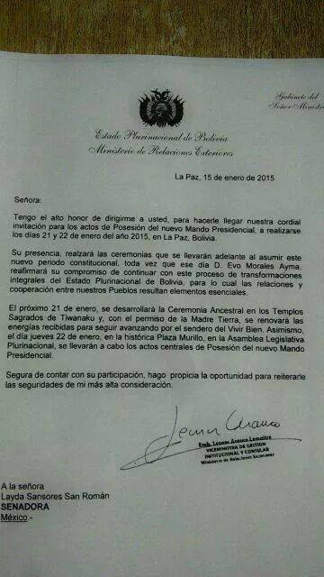 “Evo es de esos grandes líderes, como (Andrés Manuel) López Obrador, que me motiva tanto a la lucha, Evo es una aspiración y una inspiración”, expresó. Por Ronny Aguilar CAMPECHE, Cam. 19 de enero del 2015.- La senadora por Campeche, Layda Sansores San Román, partió este lunes hacia Bolivia, para asistir a la toma de posesión del presidente Evo Morales, y se dijo “muy emocionada”, porque es de “esos regalos inesperados”. “Evo es de esos grandes líderes, como (Andrés Manuel) López Obrador, que me motiva tanto a la lucha, Evo es una aspiración y una inspiración”, expresó. La legisladora revela que el contacto con Evo Morales lo hizo a través de la página electrónica Revolución 3.0, de Epigmenio Ibarra, que colaboró en la campaña del boliviano. “En uno de los encuentros, me dicen que le mostraron al vicepresidente mi último discurso sobre la Casa Blanca y el de Ayotzinapa, y dicen que solo les preguntó que si todavía vivía la senadora, y los muchachos les dijeron que sí, que aún estaba viva”, reveló. “Seguramente hicieron un comentario con Evo Morales, porque le pidió a personal de su equipo que trataran de convencerme para que asistiera a su toma de protesta, no me tuvieron que rogar a la primera vez, es más, me tiraba del avión, estoy muy emocionada de conocerlo aun fuera de lejos”, indicó. Sansores San Román informó que el presidente boliviano hace dos tomas de protesta, primero con los pueblos indígenas y luego con los presidentes de otros países solidarios, que lo apoyan en esta lucha ejemplar que ha dado. “Evo ha puesto en el progreso al pueblo de Bolivia, de manera contraria de lo que se hace aquí en México, devolviendo al pueblo lo que es suyo, el agua, el gas, explotando su riqueza para ellos crecer, con un respeto a los indígenas, a los que no ha traicionado”, apuntó. Ante de partir a La Paz, la senadora publicó en redes sociales la invitación enviada por el Ministerio de Relaciones Exteriores, en la que se le dice: “Tengo el alto honor de dirigirme a usted, para hacerle llegar nuestra cordial invitación a los actos de Posesión del nuevo Mando Presidencial, a realizarse los días 21 y 22 de enero del año 2015, en La Paz, Bolivia”. “Su presencia realzará las ceremonias que se llevarán adelante al asumir este nuevo periodo constitucional, toda vez que ese día D. Evo Morales Ayma reafirmará su compromiso de continuar con este proceso de transformaciones integrales del Estado Plurinacional de Bolivia, para lo cual la relación y la cooperación entre nuestros Pueblos resultan elementos esenciales”, agrega.