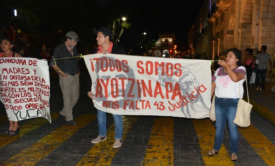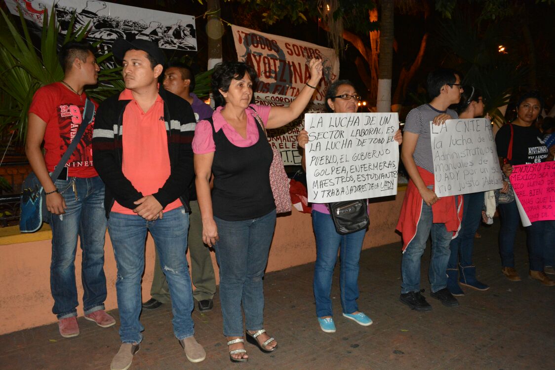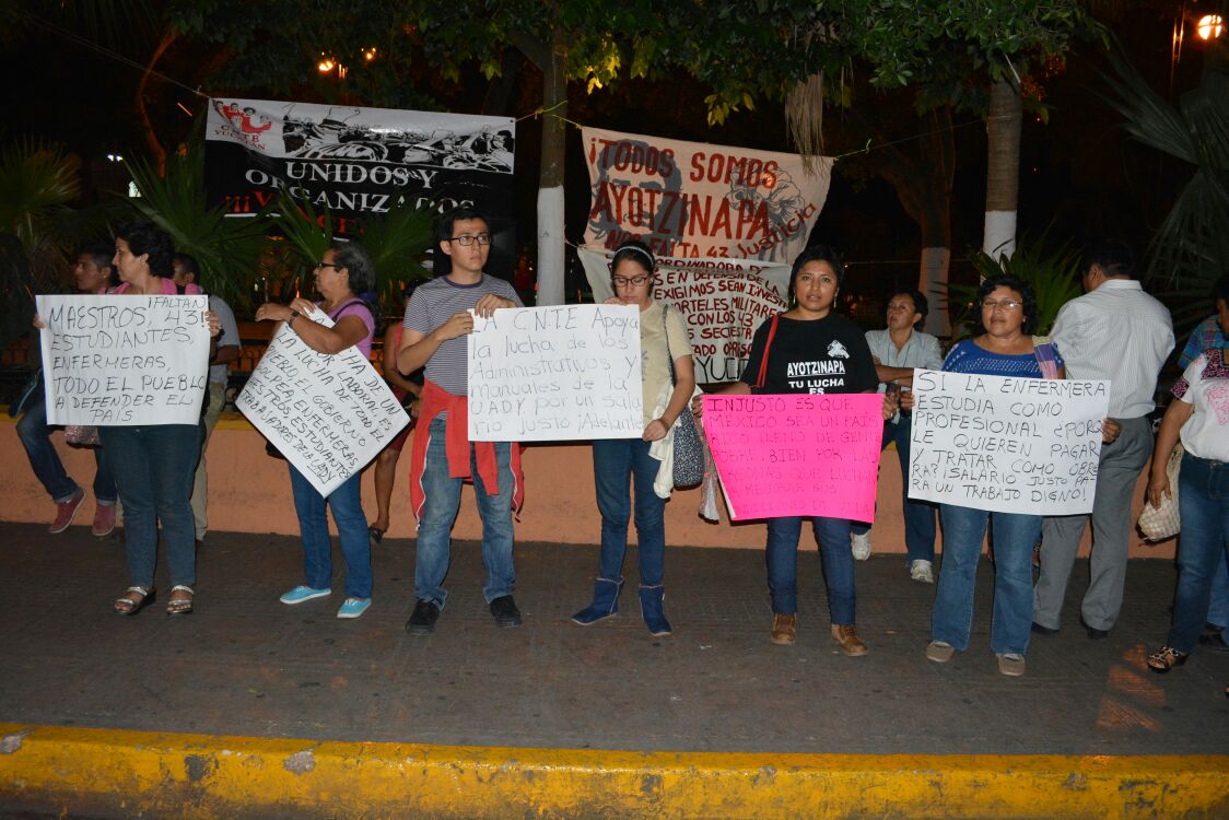 Integrantes de la Coordinadora Nacional de los Trabajadores de la Educación (CNTE) en los estados de Quintana Roo, Yucatán y Campeche, se manifestaron en la plaza principal de Mérida, en exigencia de la presentación con vida de los 43 normalistas desaparecidos y justicia para los caídos en Iguala, Guerrero.