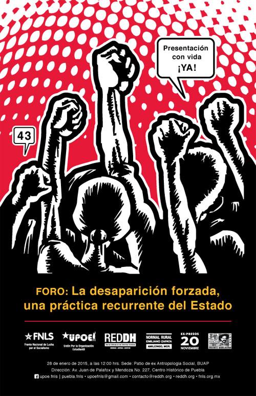 El pasado 26 y madrugada del 27 de septiembre de 2014 en Iguala, Gro, el Estado mexicano dejó una huella profunda e imborrable, la huella de la desaparición forzada de personas, acto que vulnera totalmente la dignidad humana, daña y arremete contra la sociedad misma. Es por ello que la desaparición forzada de personas lejos de ser un fenómeno social de gran importancia y preocupación, también es una práctica recurrente, sistemática y que ahora se ha vuelto en una política de Estado, cuyo objetivo es acallar toda voz de protesta, disidencia y aún de exigencia de nuestros más fundamentales derechos humanos, pero que detrás de toda esta planificación sistemática hay varios aspectos importantes: la aquiescencia y responsabilidad, ya sea por comisión u omisión del Estado. Hablar de Ayotzinapa nos remite automáticamente a los 43 compañeros normalistas rurales, miembros de la FECSM, detenidos-desaparecidos el pasado 26 de septiembre, pero cabe recalcar que no son 23,000 personas detenidas-desaparecidas de manera forzada en México como intenta hacer creer el Estado, sino que hay más de 110,000 en esta desdeñable condición. Tan solo en Puebla se desaparece a dos personas por día, mientras que en el Estado de México, a una por día. Por ello, como Frente Nacional de Lucha por el Socialismo (FNLS) invitamos al foro: La desaparición forzada, una práctica recurrente del Estado que tendrá lugar en el patio de ex Antropología Social, en la Facultad de Filosofía y Letras de la BUAP, ubicado en avenida Juan de Palafox y Mendoza número 227, Centro Histórico de Puebla, el día 28 de enero de 2015, a las 12:00 horas. Se contará con la participación de: