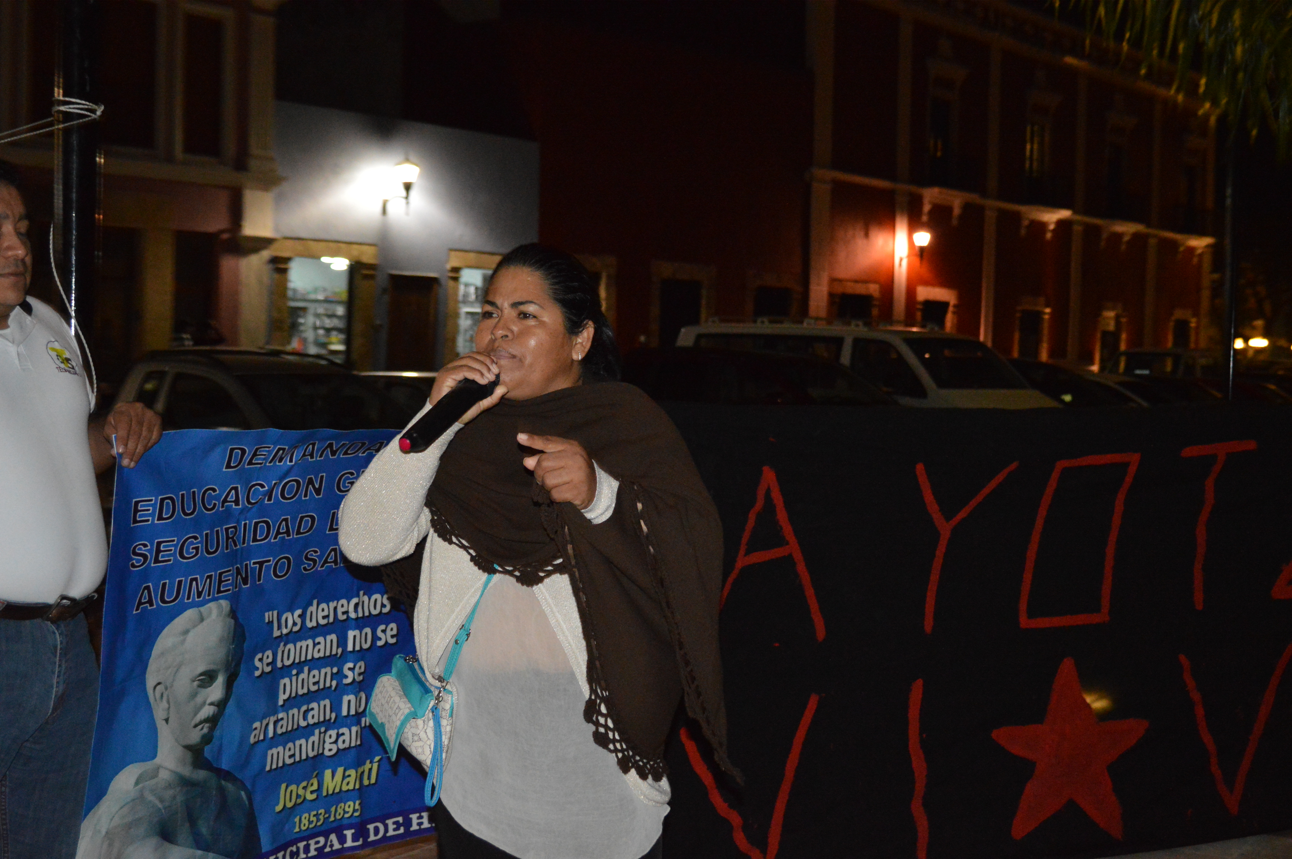 María Candelaria García, viuda de Armando García Jiménez, luchador social asesinado impunemente en Candelaria, pronunció un emotivo discurso que estremeció a los asistentes a la Octava Acción Global por Ayotzinapa en la ciudad capital, y derramó lágrimas por los abusos del Estado, exigiendo justicia para los jóvenes desaparecidos y su familia. Por Ronny Aguilar CAMPECHE, Cam. 27 de enero del 2015.- María Candelaria García, viuda de Armando García Jiménez, luchador social asesinado impunemente en Candelaria, pronunció un emotivo discurso que estremeció a los asistentes a la Octava Acción Global por Ayotzinapa en la ciudad capital, y derramó lágrimas por los abusos del Estado, exigiendo justicia para los jóvenes desaparecidos y su familia. García, incansable luchadora social en el municipio de Candelaria, está exiliada de su propia comunidad, por los contantes acosos de grupos vinculados a las autoridades, que han atentado no solo contra la vida de su esposo, sino hasta de sus hijos. Durante el evento, se le pidió que dirigiera unas palabras y en breve discurso, caló el alma de los asistentes con sus palabras y lágrimas, por ser una mujer que ha sufrido de cerca las violaciones a sus derechos de manera cercana. “Quiero agradecer la oportunidad que me dan de expresarme, quiero que sepan que me duele mi país, que me duele mi gente, que me duelen ellos (los 43), que me duele que el pueblo no tenga valor y que no tengan sentimientos, estoy aquí como madre de familia y me duele lo que le duele a los padres de estos jóvenes, como dicen los compañeros, que le quiten a uno a sus hijos, a ver quién no va a ir a buscarlo, si no va a hacer hasta lo que no pueda por reclamar su sangre”, expresó. “Dónde están aquellos que nos dieron patria y libertad, para que vean en lo que estamos sumidos, estamos sumidos en la nada, todo el que tenga un hijo que se acuerde que esos muchachos son hijos desaparecidos, son hijos que le duelen a sus padres, y son hijos que hasta debajo de las piedras debemos buscar”, agregó. “Soy la esposa de un hombre asesinado, soy nieta de un abuelo asesinado, soy la madre de una hija secuestrada y ultrajada, soy compañera ciudadana de tres compañeros secuestrados y torturados por el Ejército y aquí estoy de pie y de frente a ustedes, diciéndoselo para que lo oiga Fernando Ortega Bernés”, abundó. “Soy una ciudadana que respeta a su país y sus leyes, pero que exige justicia para los padres, los hijos, las esposas y para todo al que ha perdido un ser amado, los que me escuchan no saben la tristeza y el dolor que uno siente, pero dentro de la tristeza y el dolor, tenemos hambre y sed de justicia y ojalá que mis palabras hagan eco en sus oídos y vayan a Guerrero y vean lo que duele y se siente convivir con esos padres, gracias y los felicito por estar aquí”, puntualizó.