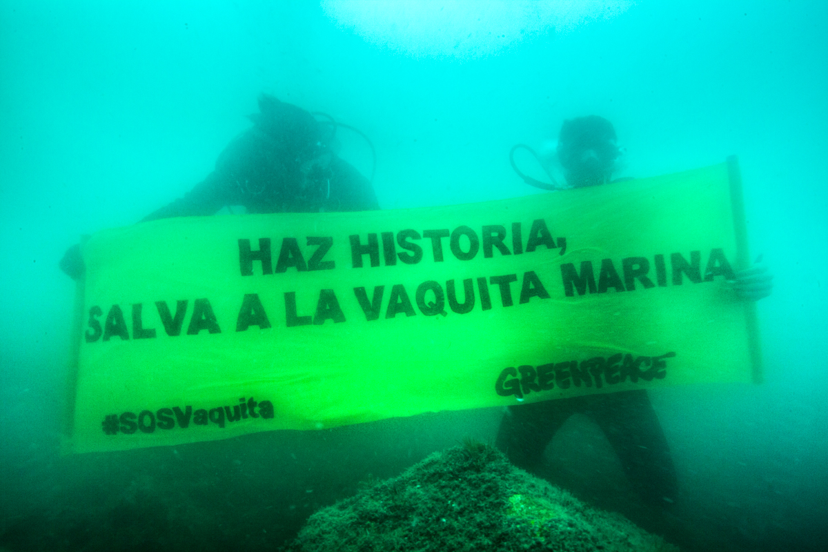 Activistas de Greenpeace lanzaron desde el fondo de las turbias aguas del Alto Golfo de California, un mensaje para alertar sobre la urgencia de salvar de la extinción a la vaquita marina, una especie endémica de México y de la que solo quedan 97 ejemplares, de acuerdo con las últimas estimaciones del Comité Internacional para la Recuperación de la Vaquita (Cirva)[1]. CIUDAD DE MEXICO, D.F. 25 febrero del 2015.- Activistas de Greenpeace lanzaron desde el fondo de las turbias aguas del Alto Golfo de California, un mensaje para alertar sobre la urgencia de salvar de la extinción a la vaquita marina, una especie endémica de México y de la que solo quedan 97 ejemplares, de acuerdo con las últimas estimaciones del Comité Internacional para la Recuperación de la Vaquita (Cirva)[1]. La agrupación ambientalista manifestó que “se trata de una campaña dirigida al gobierno encabezado por el presidente Enrique Peña Nieto, para exigir la protección de este raro y tímido cetáceo que sólo habita en el Mar de Cortés”. “Greenpeace lanza este llamado de SOS desde el fondo del mar, para hacer historia y evitar la desaparición de uno de los mamíferos más emblemáticos de México”, expresó.