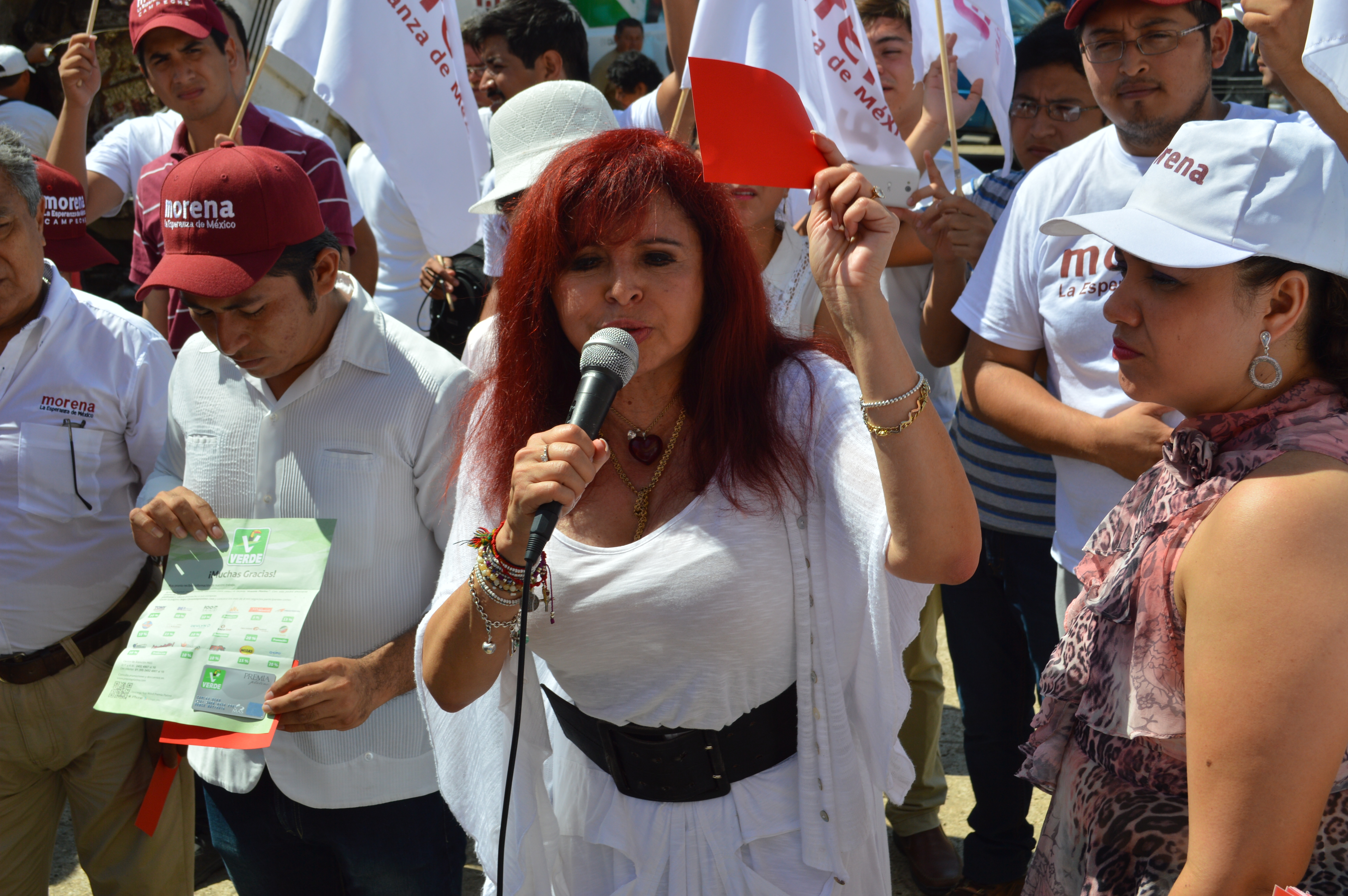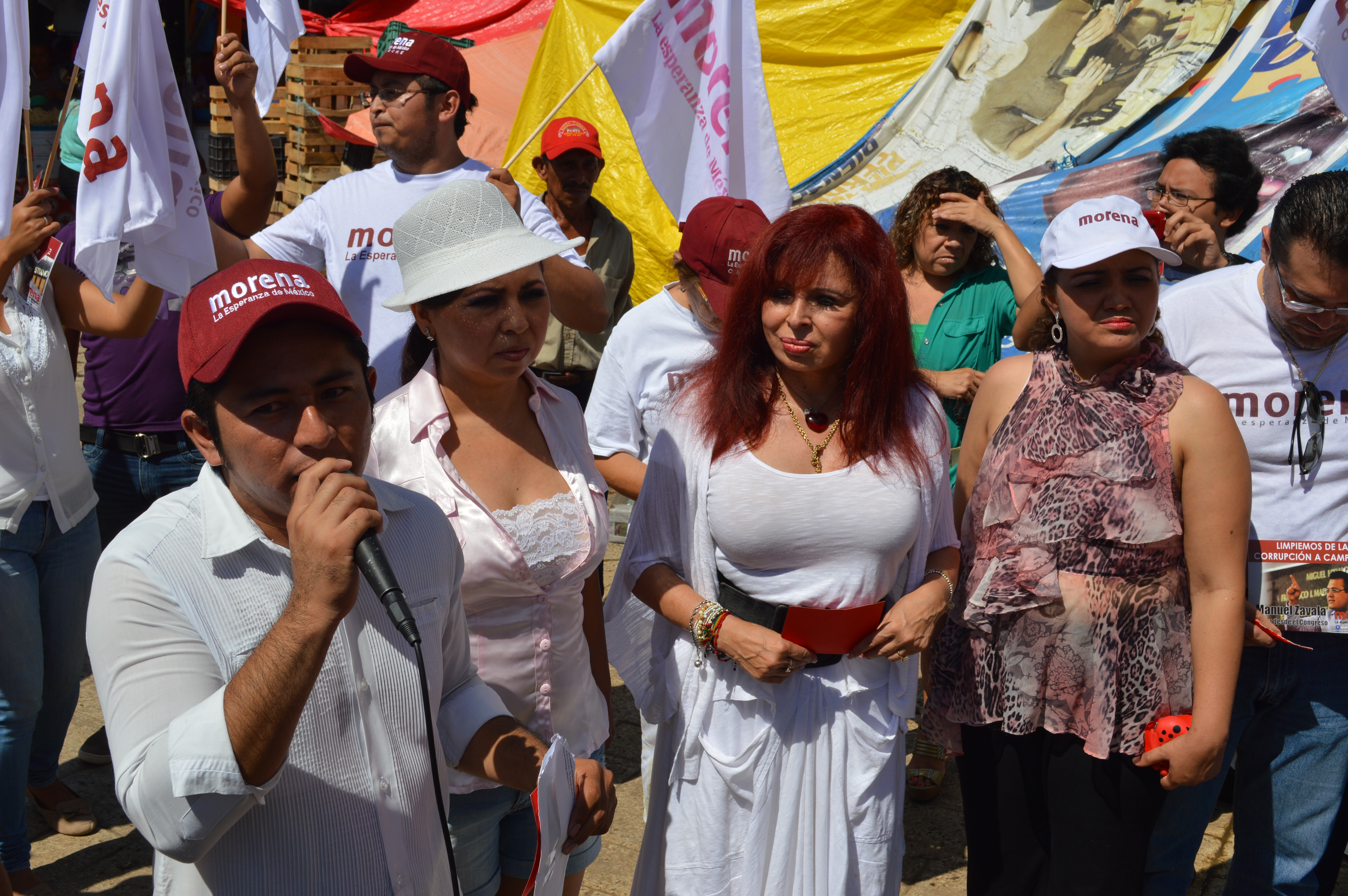 “Insistiremos ante el INE para que se sancionen estas conductas, que son irregulares; si el INE actuara con firmeza y responsabilidad y no como empleado del gobierno, tendría que ser cancelado el registro del PVEM”, señala la candidata de Morena a la gubernatura. 16ver El dirigente estatal de Morena, Carlos Ucán Yam, denuncia la compra adelantada del voto con tarjetas del PVEM y revela que este partido utilizó sus datos para hacerle llegar un plástico. CAMPECHE, Cam. 16 de marzo del 2015.- Carlos Ucán Yam, dirigente estatal del partido político Morena, denunció la compra adelantada del voto, a través de la entrega de tarjetas del Partido Verde Ecologista de México, y la candidata a la gubernatura, Layda Sansores San Román, señaló que el PVEM está haciendo el trabajo sucio por el PRI, lo que ya amerita la cancelación de su registro. El líder morenista, en compañía de Sansores San Román, a las afueras del área de pescadería del mercado “Pedro Sáinz de Baranda”, ofreció una conferencia de prensa, en la cual mostró una credencial con su nombre, la cual llego a su casa de parte del PVEM, conteniendo 700 pesos y una gama de establecimientos que apoyan “este asqueroso fraude electoral”. “Esta mafia de poder está buscando la forma de capitalizar el voto, porque ya no cree en el PRI, ya no cree en el PAN, ahora está inflando al Partido Verde Ecologista de México y están entregando tarjetas, están usando datos personales lo que viola la privacidad de los ciudadanos, utilizan los datos para llevar tarjetas directamente a sus casas”, indicó Ucán Yam. “Apenas ayer y aun cuando hemos pedido que se frene la entrega de estas tarjetas, y por eso mandamos un mensaje al INE, que el IFE, aunque se vista de INE, IFE se queda, y a mi casa me llegó la tarjeta el día de ayer, la reparten casa por casa, dice mi nombre y mi número de tarjeta es 1301302809502907, vence en mayo del 2016”, puntualizó. El dirigente de Morena manifestó que habría que preguntarle al dirigente del PVEM, Cristian Bello, que dicho sea de paso es sobrino de Alejandro Moreno, candidato del PRI a la gubernatura, “cuándo me afilié, o cuándo me depositan o me dan mi despensa, lo vamos a buscar y lo vamos a encarar, la gente no se puede dejar engañar por esta situación, les sacamos la tarjeta roja por corruptos”. Por su parte, Layda Sansores pidió que se tome en cuenta esta acción, pues amerita que se le impida participar en el proceso electoral al PVEM, pues es una clara compra de conciencias las que está intentando hacer, aprovechando la necesidad del pueblo campechano. “Esto ya amerita la cancelación de su registro, porque el INE ya emitió la orden de suspender la entrega de tarjetas y no es que hayan llegado por correo y no lo pudieron evitar, las dan casa por casa con un donativo de 700 pesos que pueden cobrar en diferentes almacenes, además de que se les sancionó por los spots y por las llamadas a los domicilios, violan el derecho a la privacidad y violan los mandatos del INE”, agregó. “Insistiremos ante el INE para que se sancionen estas conductas, que son irregulares; si el INE actuara con firmeza y responsabilidad y no como empleado del gobierno, tendría que ser cancelado el registro del PVEM, parece que el PVEM es el chambelán del PRI y creo que la hace de algo más y esto no se acepta, luego se ponen cara de ecologistas, eso no es partido, es negocio y explotan a los ciudadanos y por eso sacamos la tarjeta roja”, subrayó. La abanderada de Morena aseguró que el candidato Alejandro Moreno Cárdenas ha dicho que respeta a los contrincantes, pero esta es la muestra de que no existe el respeto, no solo por los demás, sino por los ciudadanos y por Campeche. 16ver2