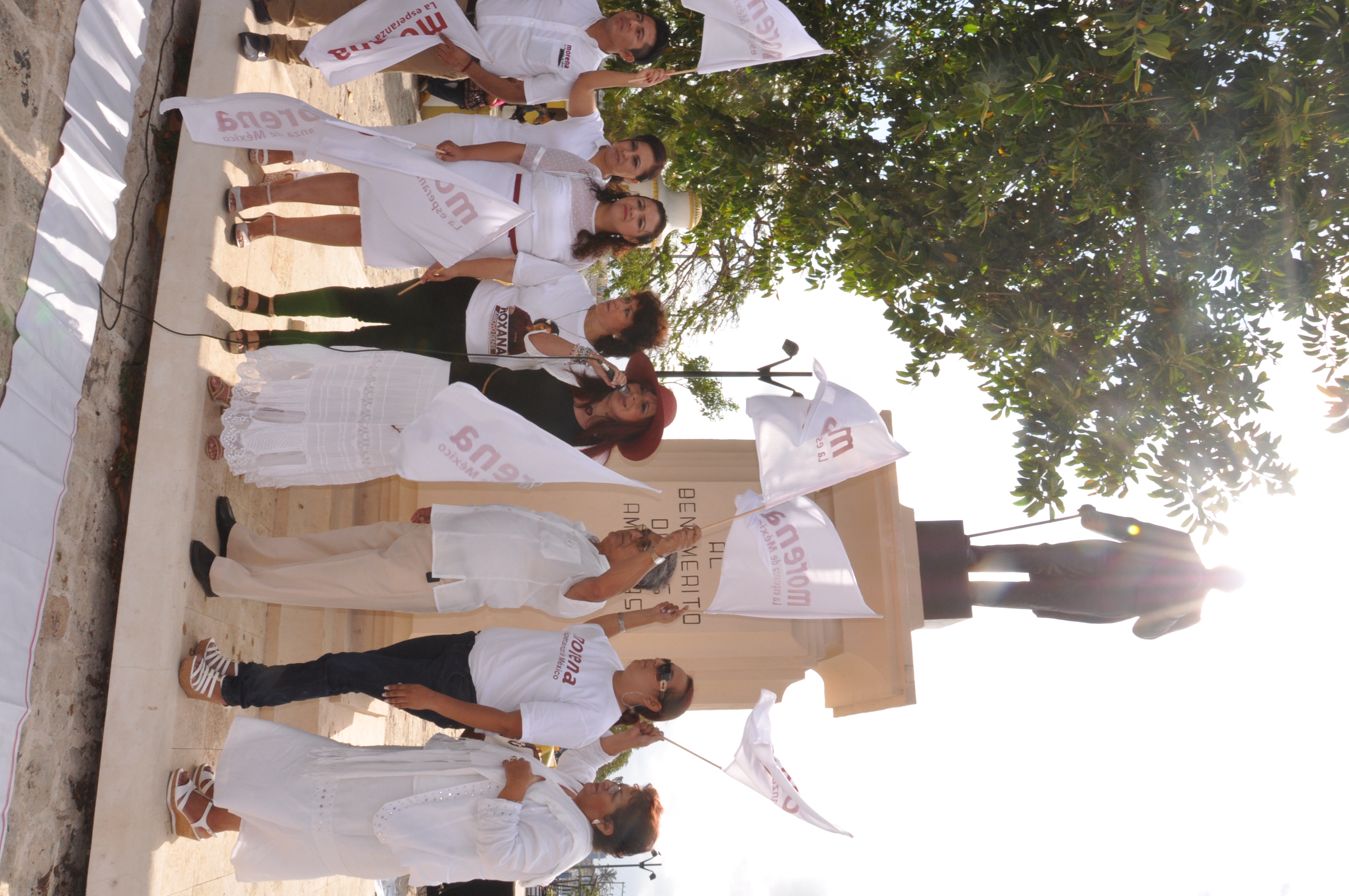 Al pie del monumento a Benito Juárez Layda Sansores, junto con Bertha Pérez y los candidatos a diputados locales por los distritos de la capital campechana, estuvieron al pie del monumento a Don Benito Juárez García, en el parque de la Alameda del mercado “Pedro Sáinz de Baranda”. La senadora dio el banderazo de salida para los candidatos de Morena por la alcaldía y las diputaciones locales de la capital, y señaló que la campaña da inicio en el monumento a Juárez, porque la mejor forma de honrar al Benemérito de las Américas no es con flores, sino con actitudes impecables. “Él fue un hombre incansable e invencible, eso es Morena y vamos a demostrarlo hoy y siempre, Morena es un movimiento que viene de lejos y llegó para quedarse, vamos a tomar las calles buscando a los ciudadanos, no esperamos hacer actos masivos en donde se acarree a base de una torta; el que venga, que sea con conciencia; miremos a los ojos a los ciudadanos y démosles las razones por las que urge un cambio a fondo en el estado de Campeche y en nuestro municipio, Morena está unido a un ideal conjunto: Democracia para Campeche”, destacó. Finalmente, la candidata recorrió los paraderos de autobuses urbanos que están a un costado de la Alameda e incluso, subió a uno de los camiones a saludar a la gente y pedir su confianza en las próximas elecciones.