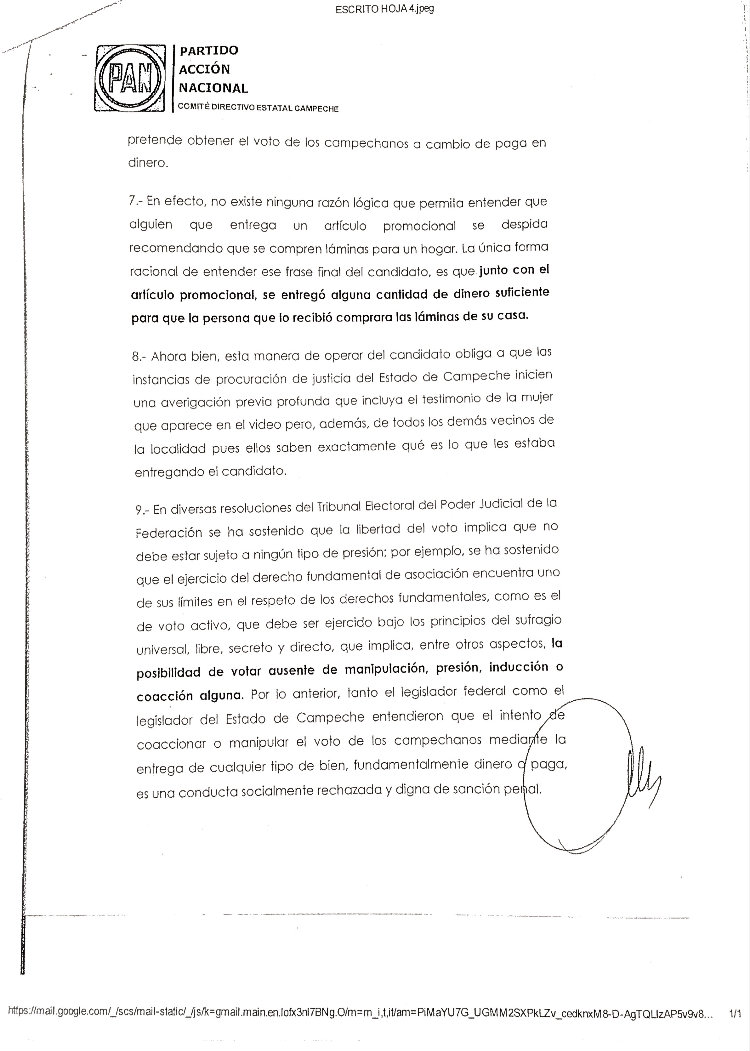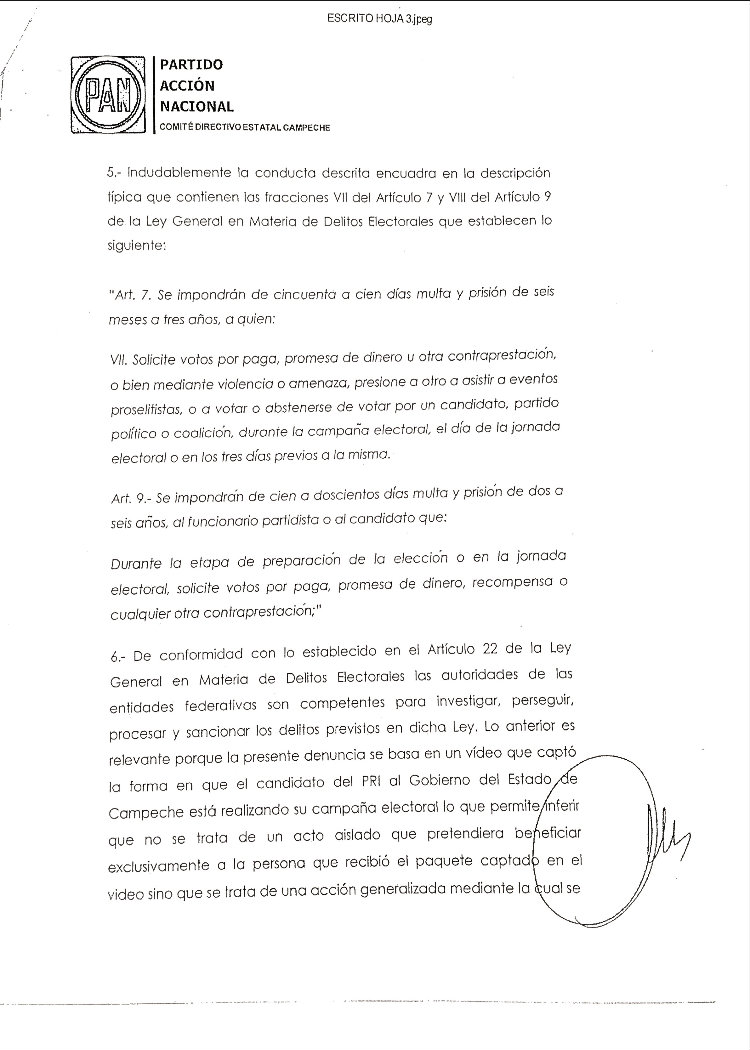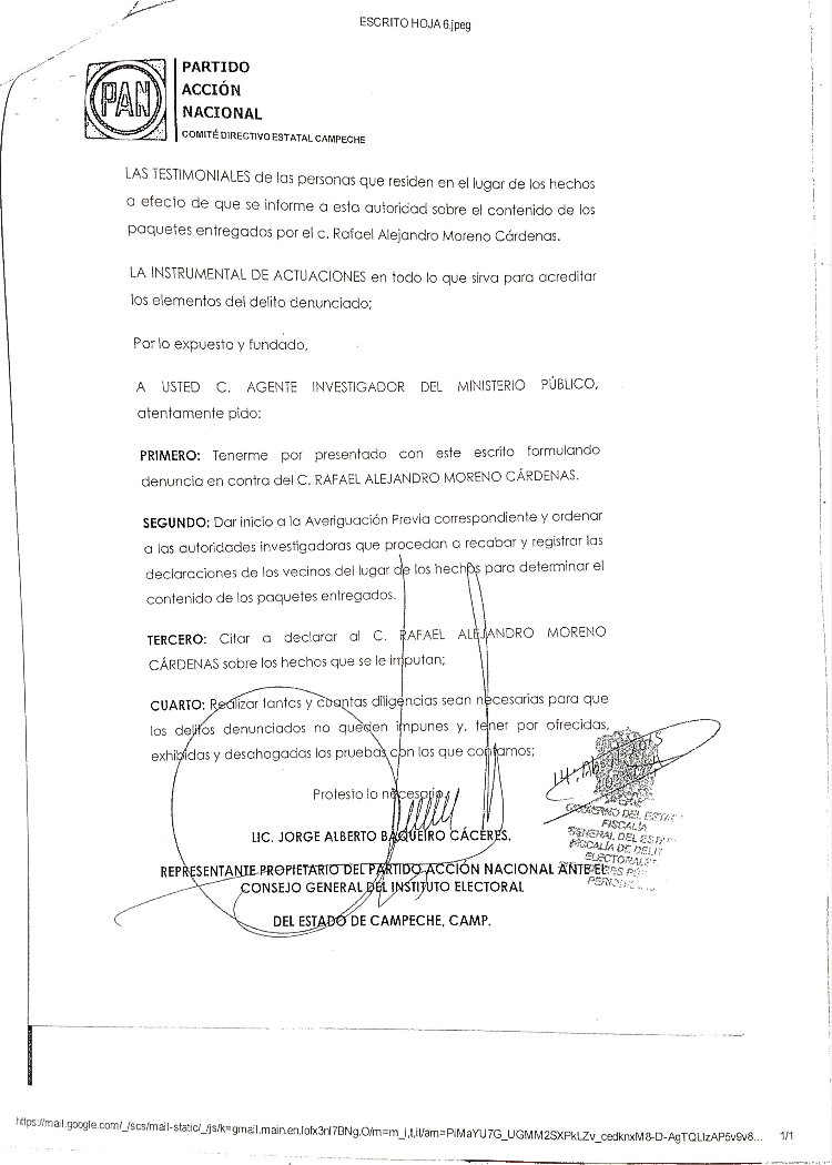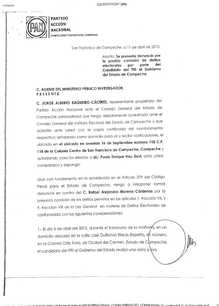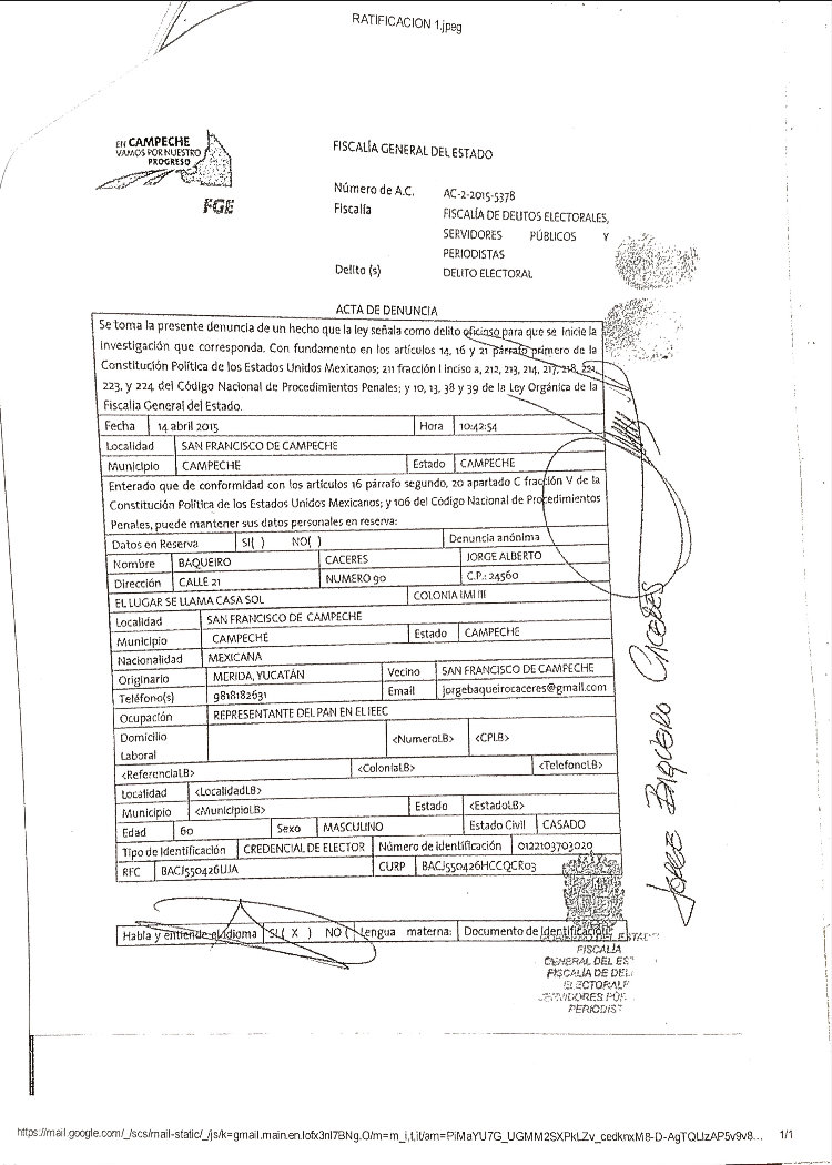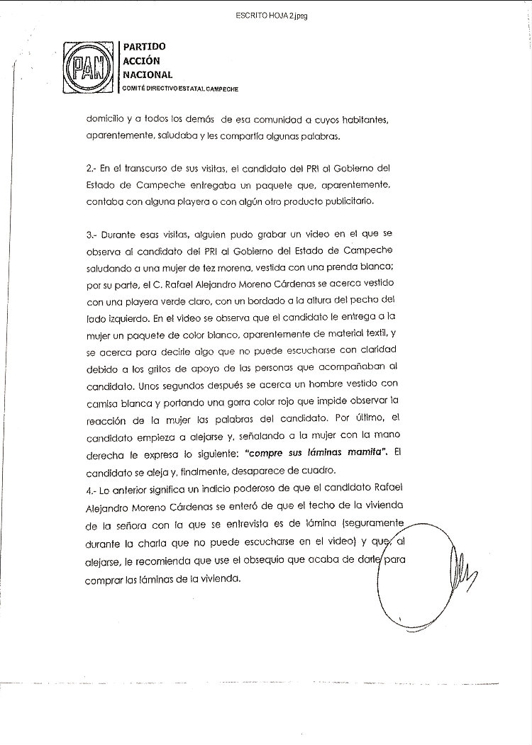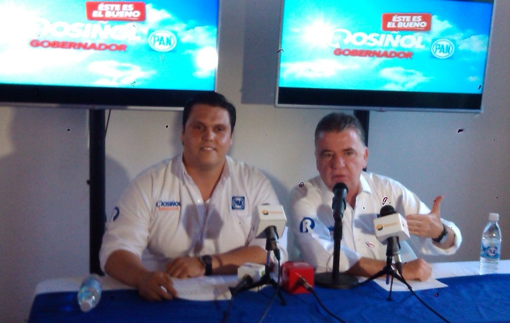 El candidato del PAN a la gubernatura se resiste a signar acuerdo con “vándalos, cínicos y mucho menos con rateros” y acusa al candidato del PRI de comprar conciencias y despedir a empleados municipales en Palizada por simpatizar con el blanquiazul. Por Gilberto Avila CAMPECHE, Cam. 17 de Abril del 2015.- El candidato del Partido Acción Nacional a la gubernatura, Jorge Rosiñol Abreu, anunció que no asistirá a la firma del Pacto de Civilidad, que se efectuará esta noche en el Centro de Convenciones, pues aseguró que “para firmar un pacto, tendría que ser entre candidatos civilizados, no con vándalos, no con cínicos y mucho menos con rateros”. En conferencia de prensa, el coordinador de campaña del panista y también diputado federal, Humberto Prieto Herrera, anunció la postura de Rosiñol Abreu sobre el pacto propuesto por el Instituto Electoral del Estado de Campeche (IEEC). “Nuestro candidato del PAN, Jorge Rosiñol Abreu, no va a firmar un supuesto Pacto de Civilidad, por los siguientes argumentos: el candidato del PRI y del Verde no es la persona autorizada para convocar a esta firma de convenio, porque no es la autoridad electoral; pareciera que quiere atribuirse las funciones del Instituto Electoral y eso, además de cínico, es ilegal”, expuso. Prieto Herrera, al momento de mostrar un video donde se aprecia al candidato del PRI, Alejandro Moreno Cárdenas, entregando una playera envuelta y diciendo una frase que da pie a una denuncia penal por compra y coacción del voto, dijo que no pactarán con un candidato que entrega dinero en playeras envueltas para que la ciudadanía compre láminas o despensas. Además, informó que el PAN ya interpuso la denuncia ante la Fiscalía General del Estado por la posible comisión de delitos electorales por parte del candidato del PRI al gobierno del Estado de Campeche, Alejandro Moreno, la cual fue recibida el pasado martes 14 de abril, para iniciar con las averiguaciones previas. “Ahí se ve claramente cómo entrega una playera y se escucha claramente cómo luego dice el candidato oficial “con eso puedes comprar tus láminas” y ahí está la prueba contundente. No vamos a pactar con ellos, cuando el Partido Acción Nacional ya ha interpuesto una denuncia por estos actos ante la autoridad competente. Para firmar un pacto, tendría que ser entre candidatos civilizados, no con vándalos, no con cínicos y mucho menos con rateros”, señaló. “Uno hace la demanda, porque se ve un acto sospechoso y no vamos a permitir ese tipo de cosas, ya que las instancias correspondientes investiguen. Sin embargo, Acción Nacional va a defender que el voto sea libre y secreto”, arremetió. Acusan de “copión” al candidato del PRI En este sentido, el dirigente panista también enfatizó que no firmarían este pacto, debido a que “Alito” copió las propuestas de la bancada panista sobre la eliminación del pago de la tenencia, propuesta que presentó el priísta esta mañana en una conferencia de prensa, en compañía de los candidatos de la coalición PRI-PVEM. “No vamos a pactar con los corruptos que votaron en contra de la propuesta del presidente Felipe Calderón para eliminar la tenencia en todos los Estados y que se dedicaron rotundamente a sangrar a los campechanos con una recaudación de 120 millones de pesos anuales, que no se van para obra pública, sino para el bolsillo de los rateros de siempre”, puntualizó. “No vamos a pactar con aquellos que reconozcan que las propuestas del PAN son las mejores y hasta las copian, pero que en el Congreso y en los Congresos locales las votan en contra, porque aquí en Campeche, ya van dos legislaturas locales que rechazan las iniciativas del PAN para eliminar la tenencia”, abundó. “No vamos a pactar con aquellos que dicen que nuestras propuestas son ocurrencias, porque ocurrencias son las compras de votos con playeras, ocurrencias son copiar propuestas del PAN, ocurrencias son proponer cosas imposibles que no van a cumplir”, externó. “No vamos a pactar con aquellos que se espantan de vender dos vacas y que se llenan la boca de decir que los campesinos tienen hambre, cuando han sido ellos quienes durante 90 años han mantenido en la pobreza a este Estado”, añadió. “Por todo lo anterior, no vamos a dar un solo paso atrás, sino todo lo contrario; no tenemos miedo ni a sus declaraciones, ni a sus playeras con dinero. Vamos a ganar este Estado de Campeche, porque la gente así lo quiere, las encuestas así lo han estado diciendo y porque caballo que alcanza siempre gana”, asentó. Asimismo, indicó que no hay civilidad por parte del PRI ya que ellos son los que amenazas, persiguen y han “fregado” a Campeche durante aproximadamente 90 años. “Recordarles que no hay mal que dure 100 años, ni pueblo que lo aguante; ya basta de tenerle miedo al gobierno y a los priístas, basta que nos persigan y compren a las personas. ¿Cuál Pacto de Civilidad? Si los que no tienen civilidad son ellos, si ellos son los que compran, los que amenazan, los que persiguen, y los que llevan 90 años fregando al Estado de Campeche”, afirmó. “No vamos a poner la otra mejilla señores, y por eso Jorge Rosiñol vuelve a retar a Alejandro Moreno, que no se esconda, que deje de copiar nuestras propuestas y que, por supuesto, acepte la prueba de confianza para que la próxima semana, los candidatos digan y enseñen a la ciudadanía campechana quiénes están completamente limpios en su físico y, por supuesto, serán capaces de gobernar al Estado de Campeche en los próximos seis años”, sentenció. Contra la represión y la revancha de “Alito”: Rosiñol Por su parte, el abanderado panista, Jorge Rosiñol Abreu, avaló este pronunciamiento y detalló que no le parece que sea realmente un Pacto Civilidad, cuando los del PRI-PVEM están haciendo todo lo contrario. “Avalo la libertad de expresión en Campeche, avalo que los ciudadanos campechanos voten libremente. No a