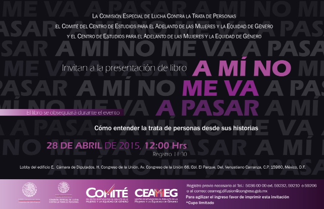 “A mí no me va a pasar”, obra de CEAMEG y Comisión Especial Por Anaiz Zamora Márquez Cimacnoticias CIUDAD DE MEXICO, D.F. 28 de abril del 2015.- La prioridad del gobierno federal durante este sexenio ha sido el tema energético y financiero, con lo que ha dejado asuntos relevantes como la prevención de la trata de personas, delito del que apenas se detecta al 0.4 por ciento de las víctimas. El Centro de Estudios para el Adelanto de las Mujeres y la Equidad de Género (CEAMEG) y la Comisión Especial de la Lucha Contra la Trata de Personas, ambas instancias de la Cámara de Diputados, publicaron el libro “A mí no me va a pasar”, en el que a través de las historias de sobrevivientes de ese flagelo se busca prevenir el delito. Durante la presentación hoy del libro, Leticia López Landero, presidenta de la Comisión Especial, señaló que aunque “se habla mucho del tema poco se entiende de él”, lo que deriva en que mucha de las acciones sean para atender a las víctimas y no para prevenir el delito, “es así que terribles historias continúan sucediendo todos los días”. Al señalar que las víctimas pueden ser personas de todas las edades y las condiciones sociales, y que este ilícito se compone de 11 modalidades, la legisladora llamó al Senado para que apruebe a la brevedad la minuta de la Ley General para Prevenir, Sancionar y Erradicar los Delitos en Materia de Trata de Personas y para la Protección y Asistencia a las Víctimas de estos Delitos. Ese llamado –agregó– también es para el gobierno federal, que se ha enfocado en crear leyes en materia energética y financiera, pero ha dejado de lado los temas humanos. “Es en estos temas en donde el gobierno debe ser más sensible, esos son en los que necesitamos que pongan el corazón”, apuntó. “A mí no me va a pasar” contiene 18 historias sobre personas sobrevivientes de trata escritas por las y los periodistas África Barrales, Ale del Castillo, Analía Ferrerya, Humberto Padget, Lydiette Carrión, Mariel Ibarra, Moisés Castillo, Pablo Zulaica, Tanya Guerrero y Vanessa Job. En su intervención, la periodista independiente Ale del Castillo, quien coordinó la obra, señaló que la labor periodística puede ser un aliado para paliar este flagelo, y que la intención de las y los colaboradores fue contar las historias de quienes han logrado sobrevivir a estos delitos crueles para que su historia permita que otras y otros eviten ser víctimas de trata. Añadió que es indispensable sumar esfuerzos para detener la trata de personas, ya que aunque se ha hablado mucho del tema aún no se sabe el número real de víctimas, y se estima que apenas el 0.4 por ciento de quienes caen en estas redes son detectadas. Las historias del libro abordan ocho modalidades de trata: utilización de personas menores de 18 años en actividades delictivas, trabajo o servicios forzados, prostitución ajena u otras formas de explotación sexual, pornografía infantil, mendicidad forzada, adopción ilegal, condición de esclavitud, y explotación sexual. En la publicación también se asienta que entre el 55 y el 84 por ciento de las víctimas identificadas a nivel mundial son del sexo femenino, y el 98 por ciento de las víctimas de trata con fines de explotación sexual son mujeres. Más de 16 mil niñas y niños en México están sometidos a esclavitud sexual, según datos del Fondo de Naciones Unidas para la Infancia (UNICEF). Estudios calculan que la cifra de niñas y niños sujetos a explotación sexual en México asciende a 70 mil, de los cuales 50 mil son explotados en las zonas fronterizas. Además se generan entre 32 mil y 36 mil millones de dólares al año en ganancias para las redes de trata de personas.