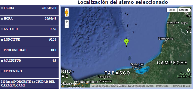 El Cenecam reporta que sólo se sintió levemente en Ciudad del Carmen, sin reportes de daños o afectaciones de los ciudadanos o de Pemex. El movimiento telúrico se presentó a las 10:02 horas de este domingo, a 113 kilómetros al noroeste de Ciudad del Carmen y al norte del complejo petrolero Ku-Maloob-Zaap. Por Daniel Sánchez CIUDAD DEL CARMEN, Cam. 10 de mayo del 2015.- Un sismo de 4.5 grados en la escala de Richter, se registró en la Sonda de Campeche, a unos 113 kilómetros al noroeste de Ciudad del Carmen y al norte del complejo petrolero de Pemex, Ku-Maloob-Zaap. El Centro Estatal de Emergencias de Campeche (Cenecam), a través de su director general, Hugo Villa Obregón, informó que hicieron el monitoreo en los municipios del sur del estado, y sólo se tuvo una sensación muy leve en Ciudad del Carmen. El organismo estatal manifestó que “no se tuvo reporte o llamada de ciudadanos a Protección Civil, ni hubo reporte de afectación, ni hay información de que Pemex haya realizado alguna acción de respuesta por el sismo”. “Fue de magnitud menor, poco perceptible en tierra, en Palizada, Candelaria, Escárcega y Champotón no hay reporte de que se haya sentido”, puntualizó. Villa Obregón reportó que los últimos años, se han presentado siete sismos, cuyos epicentros han sido ubicados en el territorio estatal o en las profundidades del sur del Golfo de México, y en todos los casos han sido de menor intensidad, de 3.5 a 4.5 grados, y no han dejado afectaciones. El Servicio Sismológico Nacional de la Universidad Nacional Autónoma de México (UNAM) precisó que a las 10:02 horas de este domingo, detectó un sismo, ubicado en la Latitud Norte 19.58 grados, y Longitud Oeste -92.26 grados, a una profundidad de 10 kilómetros. La magnitud del sismo fue determinada en 4.5 grados en la escala de Richter y el epicentro fue ubicado a 113 kilómetros al noroeste de Ciudad del Carmen.