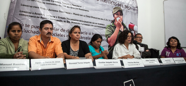 © César Martínez López Familias de comunitarios presos anuncian movilizaciones/CIMACFoto: César Martínez López Por Anayeli García Martínez Cimacnoticias CIUDAD DE MEXICO, D.F. 14 de mayo del 2015.- Familiares de la activista Nestora Salgado García –quien lleva nueve días en huelga de hambre en un penal en Tepic, Nayarit–, así como parientes de otros policías comunitarios presos, anunciaron que iniciarán bloqueos carreteros e incluso una movilización hacia la Ciudad de México si no se libera a estas personas recluidas. En conferencia de prensa hoy en esta capital, Cleotilde Salgado y Geovanni Torres, hermana y sobrino de Nestora, informaron que la ex comandanta de la Policía Comunitaria de Olinalá, en el estado de Guerrero, sigue en ayuno sin que las autoridades hayan considerado la petición de trasladarla a otro penal en la Ciudad de México. Ante esta situación, familiares de otros policías comunitarios, también presos y acusados de secuestro por su labor en contra de la delincuencia organizada en Guerrero, dijeron que podrían realizar bloqueos carreteros y si antes del próximo 2 de junio no tienen una respuesta, harían un plantón en la capital del país el 3 y 4 de junio, antes de las elecciones del 7 de junio. Agustina García, esposa del policía comunitario Arturo Campos, y Ausencia Honorato, esposa del agente Gonzalo Molina, se sumaron a la petición de libertad para Nestora y para sus compañeros, quienes están recluidos en el Centro Federal de Readaptación Social número 1 “Altiplano”, en el Estado de México. Agustina y Ausencia señalaron que sus parejas podrían iniciar una huelga de hambre en solidaridad con la activista, quien desde agosto de 2013 está presa en el Centro Federal de Readaptación Social número 4 “Noreste” en Tepic, acusada de privación ilegal de la libertad en su modalidad de secuestro. De acuerdo con Agustina García, los comunitarios son “presos sociales”, por lo que aseguró que si antes del 2 de junio no tienen respuesta sobre la libertad de todos los acusados de secuestro, quienes en realidad hacían frente al crimen organizado, podrían instalar un plantón en el DF antes de las elecciones del 7 de junio. A su vez, Felicitas Martínez, consejera de la Coordinadora Regional de Autoridades Comunitarias-Policía Comunitaria (CRAC-PC) de Guerrero, dijo que se analiza la posibilidad de organizar bloqueos carreteros para sitiar las casetas de cobro, dejar pasar a los automovilistas, e informar sobre la situación de sus compañeros. Asimismo, destacó que a estas acciones de solidaridad se suman los guardias comunitarios de Aquila, en el estado de Michoacán, y además esperan que se sumen más actores sociales, organizaciones civiles y activistas, para que esta petición de libertad se cumpla, ya que los casos tienen un “atraso jurídico e irregularidades procesales”. Leonel Rivero Rodríguez, abogado de Nestora Salgado, informó que hasta el momento no hay una respuesta del Organismo Administrativo Desconcentrado de Prevención y Readaptación Social sobre el eventual traslado de la activista a un penal del DF. Recordó que la salud de Nestora va en detrimento, ya que padece gastritis y una neuropatía en las cervicales, que le provoca adormecimiento en las extremidades, además del cansancio y la debilidad de no ingerir alimentos y sólo beber agua. Asimismo, adelantó que el próximo lunes 18 de mayo la defensa legal de la ex comandanta tendrá una reunión con funcionarios de la subsecretaría de Asuntos Jurídicos y Derechos Humanos de la Secretaría de Gobernación, al parecer para dar cumplimiento a las medidas otorgadas por la Comisión Interamericana de Derechos Humanos en enero pasado a fin de que se proteja su salud.