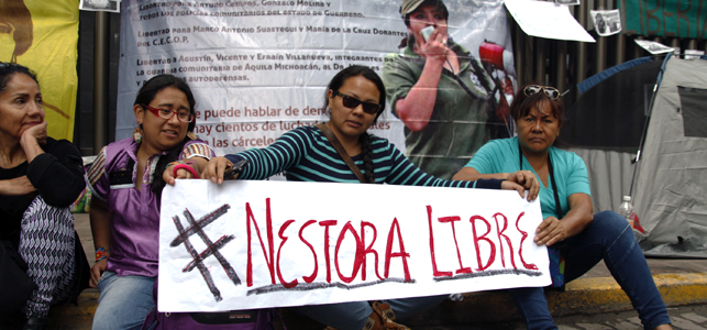Familiares y simpatizantes exigen se le dé atención médica/CIMACFoto: César Martínez López Por Anayeli García Martínez Cimacnoticias CIUDAD DE MEXICO, D.F. 29 de mayo del 2015.- La familia de la ex comandanta de la Policía Comunitaria (PC) de Olinalá, estado de Guerrero, Nestora Salgado García, pidió al Gobierno del Distrito Federal (GDF) que permita la comunicación con la activista una vez que llegue al Centro Federal de Readaptación Social de Tepepan, al sur de esta ciudad, procedente del Centro Federal Femenil del Noroeste en Tepic, Nayarit. Hasta el cierre de esta edición, Cleotilde Salgado realizaba gestiones en una oficina del Órgano Administrativo Desconcentrado de Prevención y Readaptación Social de la Secretaría de Gobernación (Segob), en la delegación Cuauhtémoc en esta capital, para que se le permitiera hablar con su hermana Nestora. Desde las siete de la mañana, Cleotilde y su familia –junto con una veintena de simpatizantes– colocaron en las afueras de esa oficina mantas y cartulinas para exigir la libertad de Nestora y otros policías comunitarios. Lo anterior luego de conocer que esta madrugada el Juzgado Décimo Segundo en Materia de Amparo Penal en el Distrito Federal ordenó el inmediato traslado de la ex comandanta desde el penal de Tepic a Tepepan. Las y los manifestantes aseguraron que permanecerán en el lugar hasta que tengan noticias de que Nestora llegó a la torre médica de Tepepan, donde será recluida mientras continúa su proceso legal acusada de secuestro. Al respecto, Omar Javier Santillán Cervantes, secretario particular del director de la Dirección General de Reclusorios del DF, atendió a las y los inconformes y dijo a Cletotilde que el avión que trasladaba a Nestora aterrizó en Cuernavaca, Morelos, debido a las condiciones climatológicas en la capital del país. Asimismo, explicó que el traslado de la activista continuaría por carretera, y que ella era acompañada por un médico que vigilaba su estado de salud. Cabe decir que hasta hoy Nestora cumplió 25 días en huelga de hambre en protesta por su encarcelamiento, y las irregularidades del proceso en el que se le acusó de secuestro. A su vez, Israel de Rosas Gazano, director general de Concertación Política del GDF, tuvo una comunicación telefónica con Cleotilde, quien le pidió que le ayudara a gestionar una llamada con su hermana, lo cual estaba en trámite de realizarse. Ahora lo que más preocupa a la familia de Nestora es la vida de la ex comandanta y por ello analiza la posibilidad de trasladarse a Tepepan para poder verla, porque, dijeron los familiares, no confían en las autoridades al no mantenerlos informados del traslado. Esta madrugada, el Juzgado Décimo Segundo en Materia de Amparo Penal en el DF ordenó al Órgano Administrativo Desconcentrado de Prevención y Readaptación Social de la Secretaría de Gobernación el traslado inmediato de Nestora Salgado. La resolución judicial fue en respuesta a un amparo presentado por la defensa de la ex comandanta de la PC, para pedir que se diera atención médica y se preservara la vida e integridad de Nestora, quien ya estaba muy deteriorada de salud debido a la huelga de hambre, y por una neuropatía en las cervicales que le adormece las extremidades.