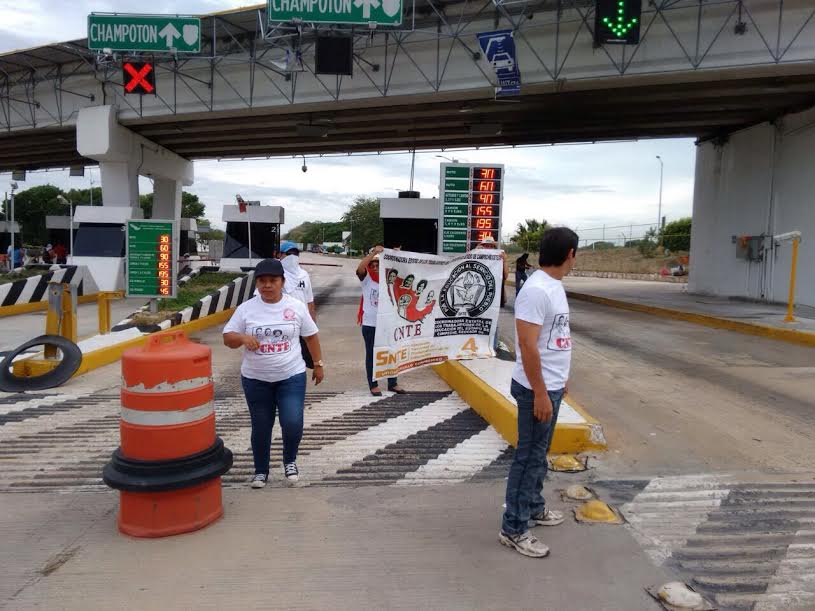 Por Gustavo Uc Pérez CAMPECHE, Cam. 1 de junio de 2015.- Aproximadamente a las 5:30 de la tarde, se presentó un grupo de maestros pertenecientes a la Coordinadora Estatal de los Trabajadores de la Educación del Campeche (CETEC), adherentes a la Coordinadora Nacional de los Trabajadores de la Educación (CNTE), en la caseta de cobro de Seybaplaya, ubicada en la autopista Campeche-Champotón. Los profesores, sin violencia alguna, se apoderaron de las casetas de cobro para el levantamiento de las plumas, con la finalidad de liberar el tránsito vehicular, como medida de apoyo al inicio de la huelga nacional, convocada por la CNTE a nivel nacional. Durante esta semana, algunos miembros de este grupo manifestaron que se realizarán diferentes actividades en apoyo a sus homólogos, que se están concentrando en el plantón permanente ubicado en el Monumento a la Revolución, en la ciudad de México.
