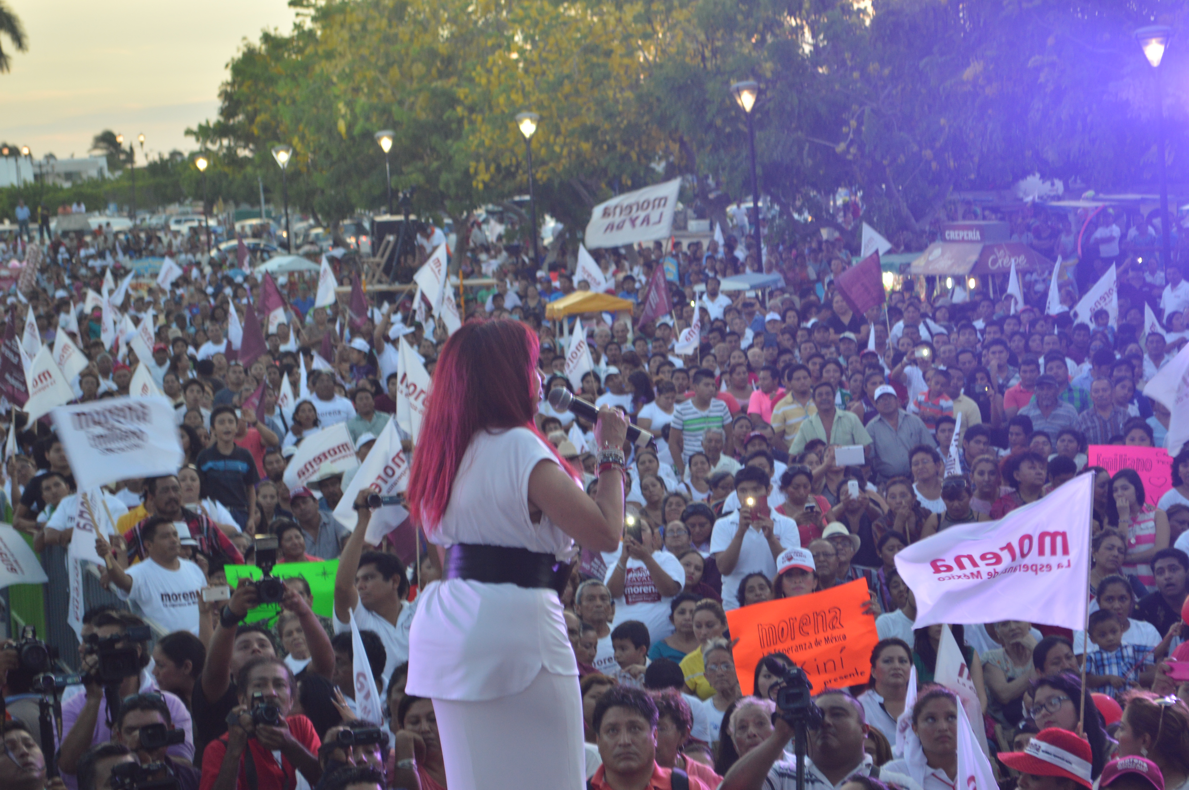 Presente, López Obrador señala que “Alito”, a billetazos, se aprovecha de la pobreza de la gente y compra conciencias, y asegura que Sansores San Román recuperará lo que quitaron Peña y Calderón a Campeche por la explotación petrolera. CAMPECHE, Cam. 3 de junio del 2015.- Miles de campechanos acudieron al cierre de campaña de la candidata de Morena a la gubernatura, Layda Sansores San Román, quien los llamó a a salir a las calles estos últimos días y terminar de convencer al pueblo, para que no haya manera de que se pueda dar un nuevo robo electoral. Los ciudadanos se dieron cita en la Plaza de la República para el último cierre nacional de campaña de Morena y Sansores San Román, en el que se contó con la participación distinguida del senador Manuel Bartlett Díaz y del presidente del Consejo Nacional de Morena, Andrés Manuel López Obrador. Durante su participación, la aspirante morenista agradeció al senador Bartlett, a Andrés Manuel López Obrador, a sus candidatos, a sus allegados y a la gente que se entregó de corazón, tal y como ella siempre lo hace, a su esposo, a sus hijos, sus hermanas y sus padres, por haberla apoyado siempre. También dio las gracias a los medios de comunicación por su labor, al igual al ejército de las redes sociales, que contribuyeron en mucho a difundir con objetividad e imparcialidad lo que está sucediendo minuto a minuto, con la voz de los ciudadanos. Indicó, ante una Plaza de la República llena, que quizás pudieron cambiarle el nombre al lugar que se pisaba, cambiar los árboles, cambiar el piso y los alrededores, pero que es emblemática y que siempre será la Plaza de la Democracia, esa que fue testigo de ocho meses de resistencia en 1997, la que vio represiones, golpes, lágrimas, cantos, oraciones, gritos de euforia y muertos. “Me emociona que muchos compañeros de la resistencia civil están aquí presentes y uno a uno, hemos estado tomando sus nombres, porque quiero que queden escritos en la lista del recuerdo histórico, escritos en un libro, para que nunca se pierda su memoria”, expresó.