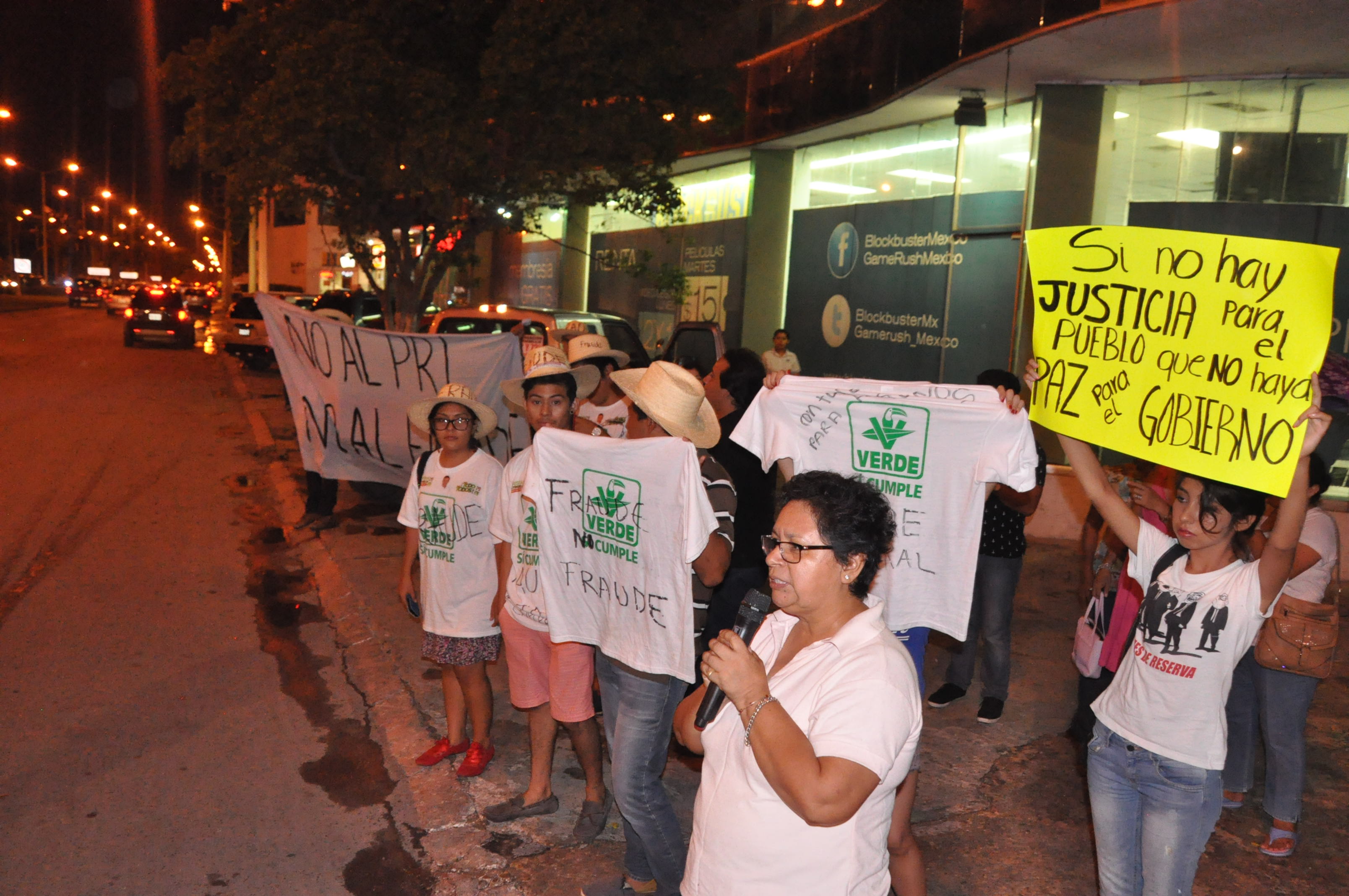 CAMPECHE, Cam. 9 de junio del 2015.- Ciudadanos campechanos se manifestaron en contra de la prolongación del PRI en el gobierno del Estado, en el malecón de la capital, a la altura del Obelisco a los Marinos, con mantas en repudio a Alejandro Moreno Cárdenas, el candidato del PRI a la gubernatura. La tarde-noche de este martes, inconformes con el fraude electoral de Estado acudieron al malecón, para protestar en contra de la elección realizada el dia siete de junio y de la victoria de Alejandro Moreno, la cual consideran una ofensa a los ciudadanos. Por segundo día consecutivo, los manifestantes se pronunciaron en contra de la compra de conciencias y el acarreo que utilizó el priismo para perpetuarse seis años más en el gobierno del Estado. Los protestantes gritaron consignas, fijaron posturas acerca de la corrupción de los gobiernos priistas y de las muertes que han orquestado como terrorismo de Estado, y antes de terminar, se contó hasta el 43 por los muertos de Ayotzinapa, para terminar en solo grito de ¡Justicia!, y al término entonaron el himno nacional mexicano.