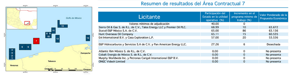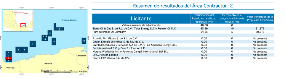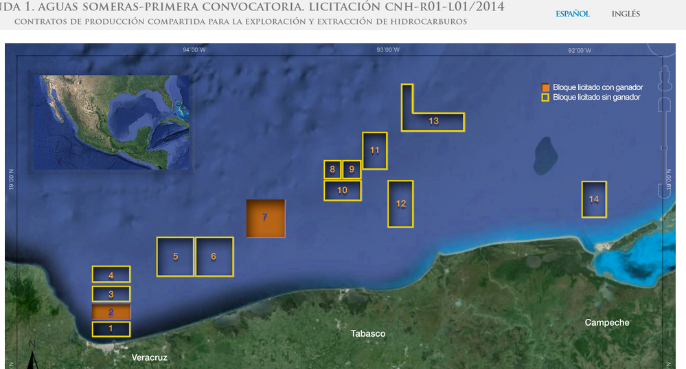 La Sener y la CNH sólo adjudican 2 de los 14 bloques petroleros de la Sonda de Campeche, el 2 y el 7, ubicados frente a costas de Veracruz y Tabasco, con 658 kilómetros cuadrados.