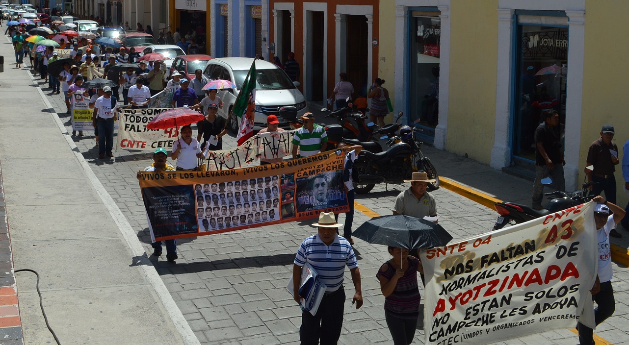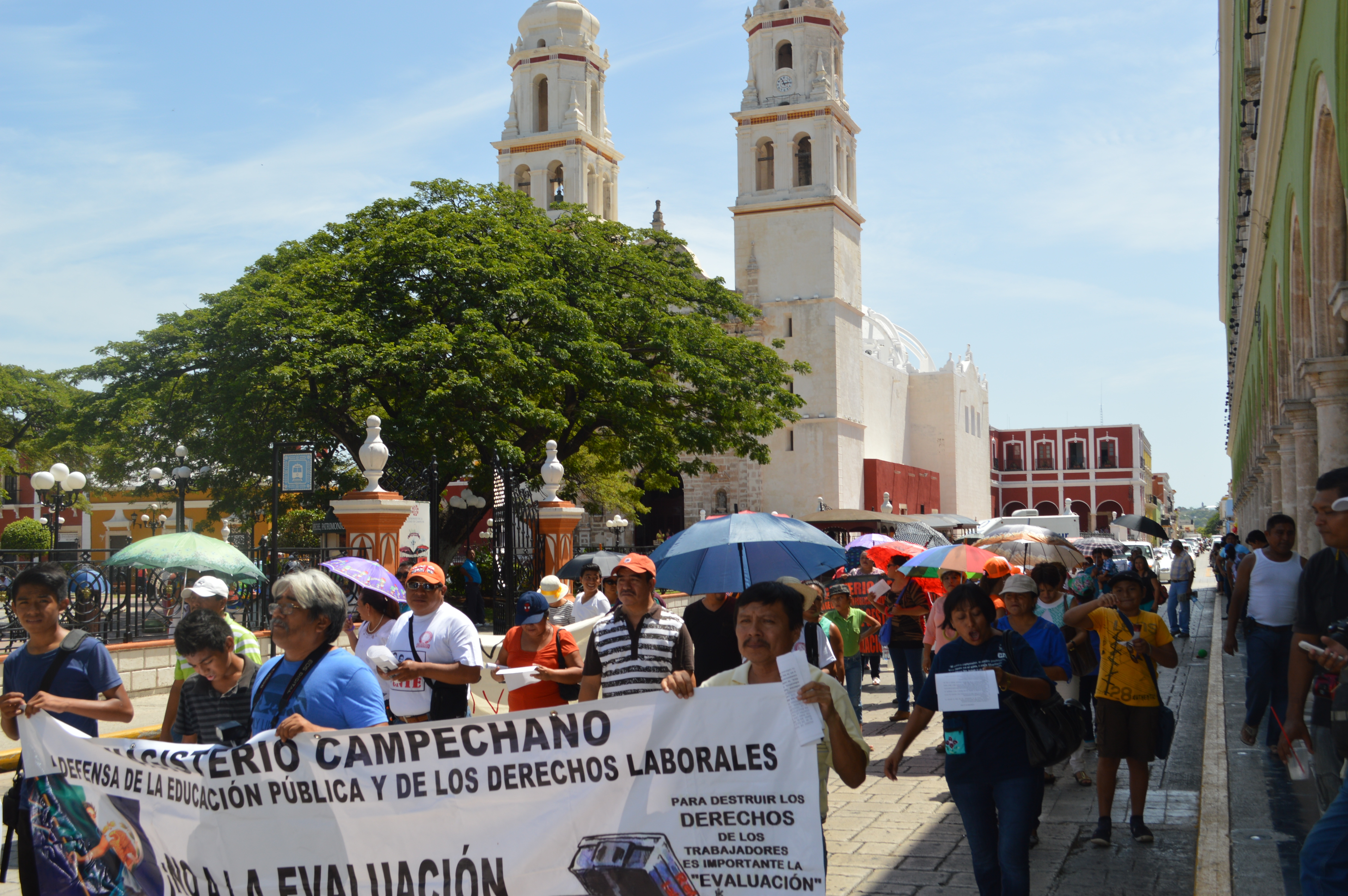 Por Ronny Aguilar CAMPECHE, Cam. 26 de julio del 2015.- Trabajadores de la educación del estado marcharon y realizaron un mitin en contra de la Reforma Educativa, pero también exigieron la aparición con vida de los 43 normalistas de Ayotzinapa, desaparecidos desde hace 10 meses. Los maestros también pidieron a los padres de familia tomar conciencia de las repercusiones de la “autonomía de gestión”, pues ahora tendrán que aportar más recursos para el mantenimiento de las escuelas, y se solidarizaron con el magisterio del estado de Oaxaca, ante la desaparición del Instituto Estatal de la Educación Pública de Oaxaca (IEEPO). En punto de las 11 de la mañana, decenas de docentes iniciaron su movilización, en compañía de profesores jubilados, padres de familia y sociedad en general, en contra de la Reforma Educativa impuesta por el gobierno priísta de Enrique Peña Nieto, la cual costará el empleo a miles de maestros del país. La marcha avanzó con normalidad por la calle 10 del centro histórico de la capital campechana, hasta llegar al Instituto Campechano, en donde se redireccionó hacia el Congreso del Estado y el Palacio de Gobierno, hasta llegar al parque principal, en donde se realizó el mitin. Es necesario señalar que a lo largo de la marcha y en el mitin, se repartieron folletos informativos acerca de la “autonomía de gestión”.