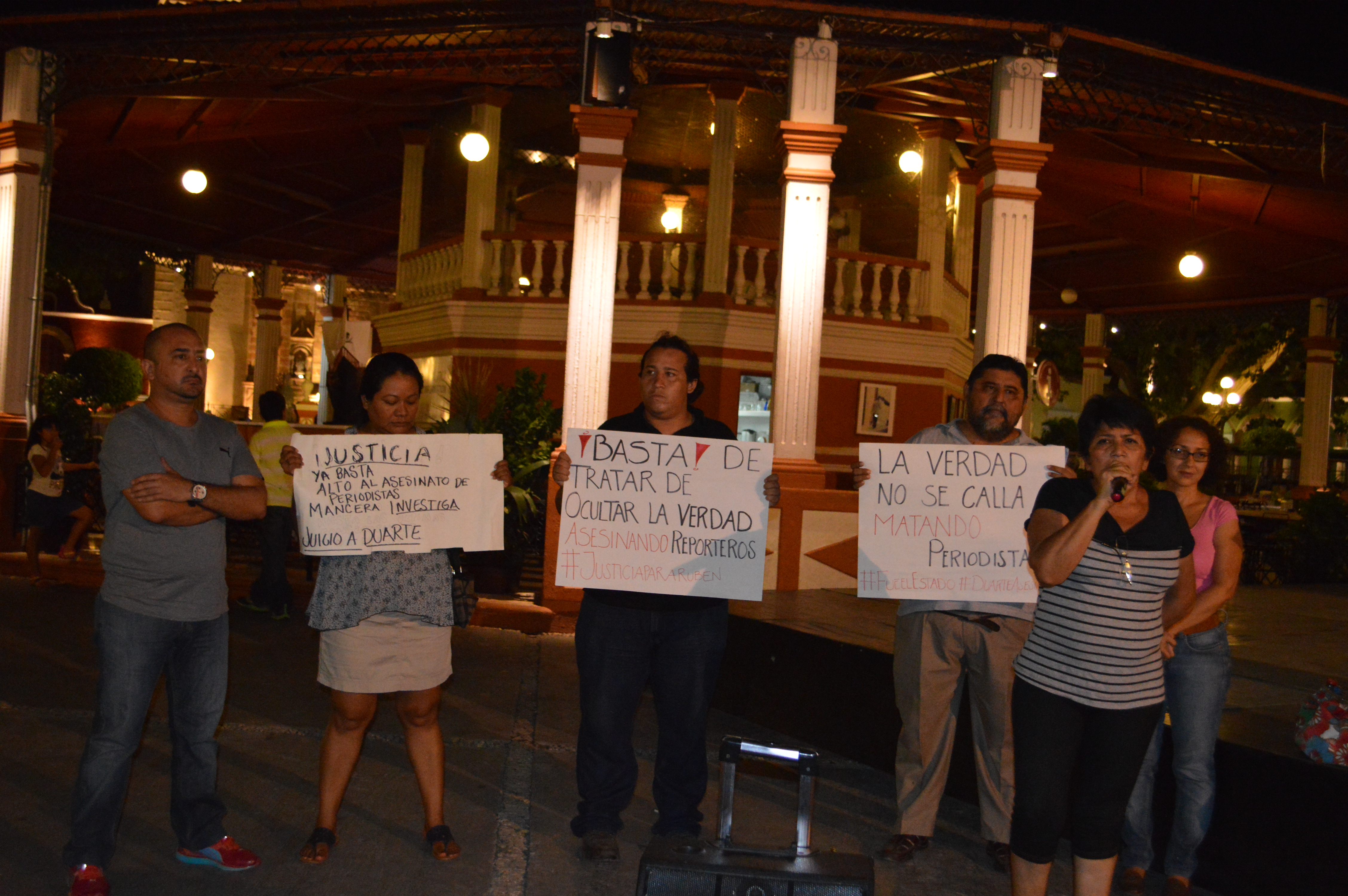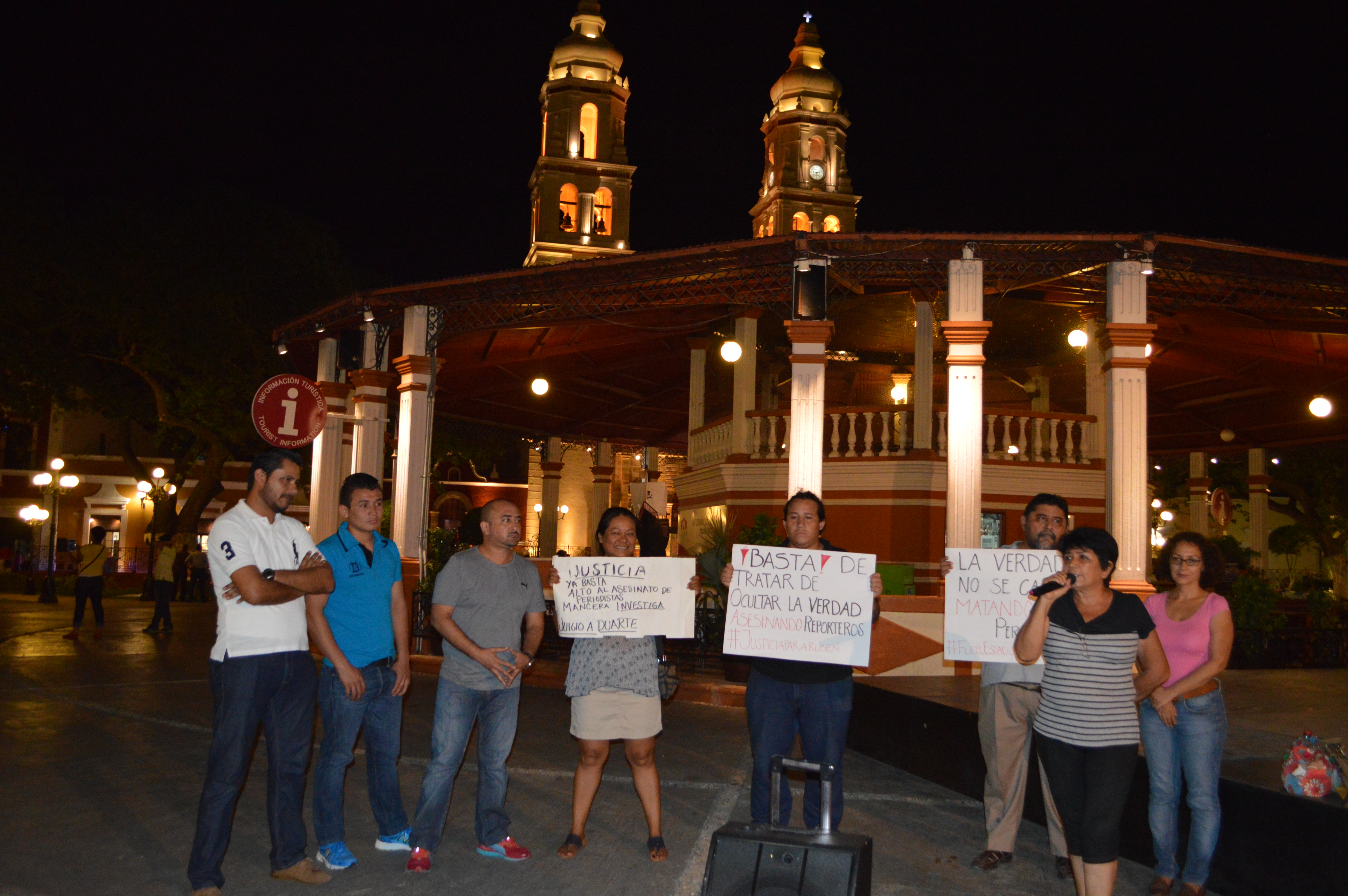 Activistas y comunicadores reclaman justicia para Rubén Espinosa y Nadia Vera, y sus tres acompañantes, y exigen juicio político al gobernador de Veracruz, Javier Duarte, quien los había amenazado de muerte. Por Ronny Aguilar CAMPECHE, Cam. 3 de agosto del 2015.- También en Campeche, activistas y comunicadores reclamaron justicia ante el artero asesinato foto-reportero de Cuartoscuro y Proceso, Rubén Espinosa, y la defensora de derechos humanos, Nadia Vera, y exigieron juicio político para el gobernador de Veracruz, Javier Duarte, quien los había amenazado de muerte hace algunos meses. Los manifestantes se plantaron en el parque principal, con pancartas, para pronunciarse en contra de las acciones de violencia que se están presentando en el país, tal es el caso de las amenazas de muerte cumplidas en contra de Rubén Espinosa y Nadia Vera, junto con tres mujeres más, quienes fueron torturados y muertos con tiro de gracia, el pasado viernes, por la noche, en la colonia Narvarte, del Distrito Federal. También se demandó al jefe de Gobierno del Distrito Federal, Miguel Ángel Mancera, que atienda y esclarezca totalmente el caso, en el que definitivamente te no se acepta la versión del robo como móvil del crimen. Campeche se suma a los demás estados del país que han decidido movilizarse en contra de las agresiones contra los trabajadores de la comunicación, además de las activistas que fueron asesinadas junto con Rubén y que se suman a las cifras de feminicidios. En base a lo anterior, se anuncia que desde el lunes tres y hasta el viernes siete de agosto, se estarán llevando a cabo acciones diarias de protesta en pro de la justicia y la libertad de expresión, a las 8:30 de la noche, en el parque principal.