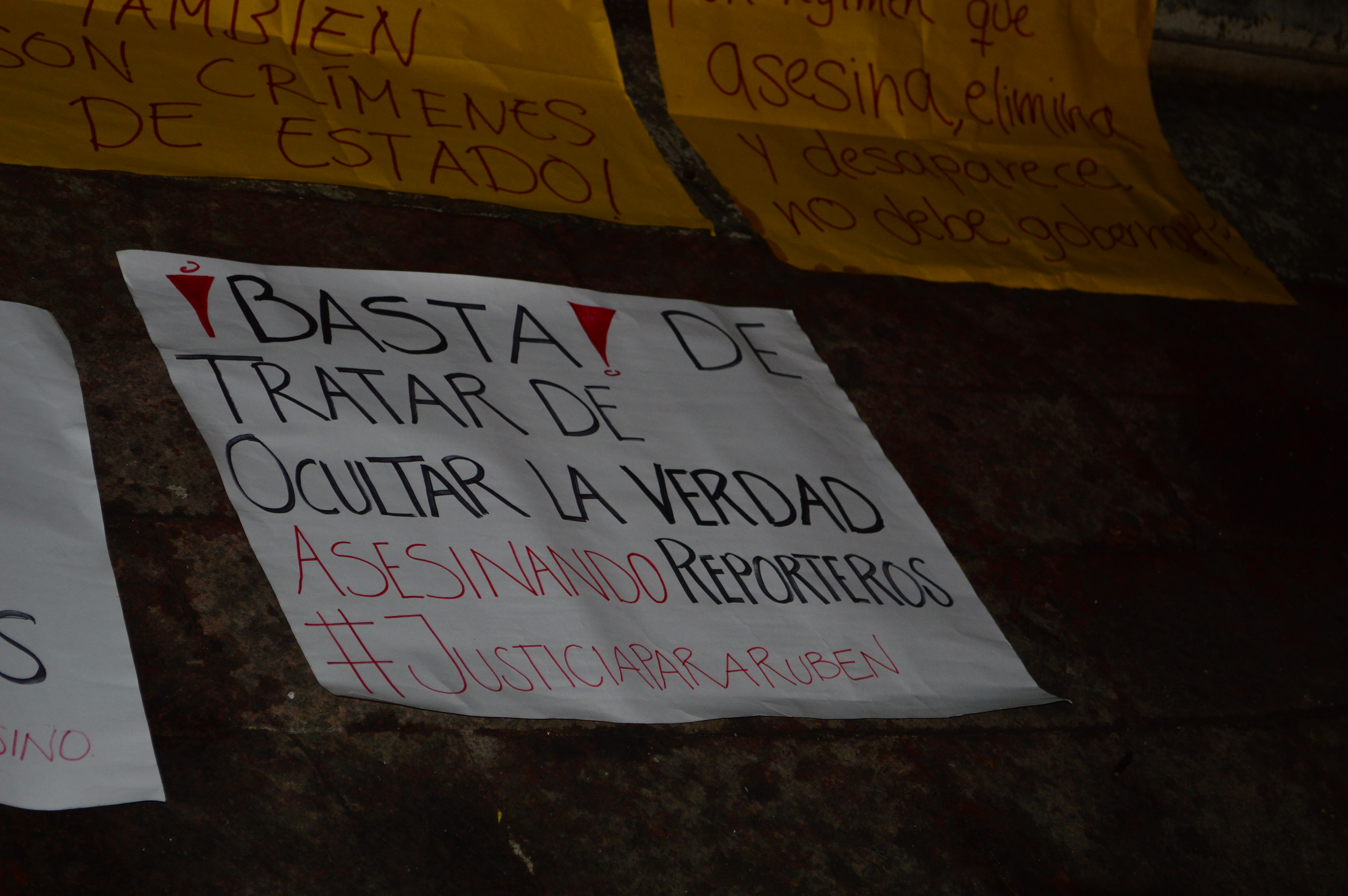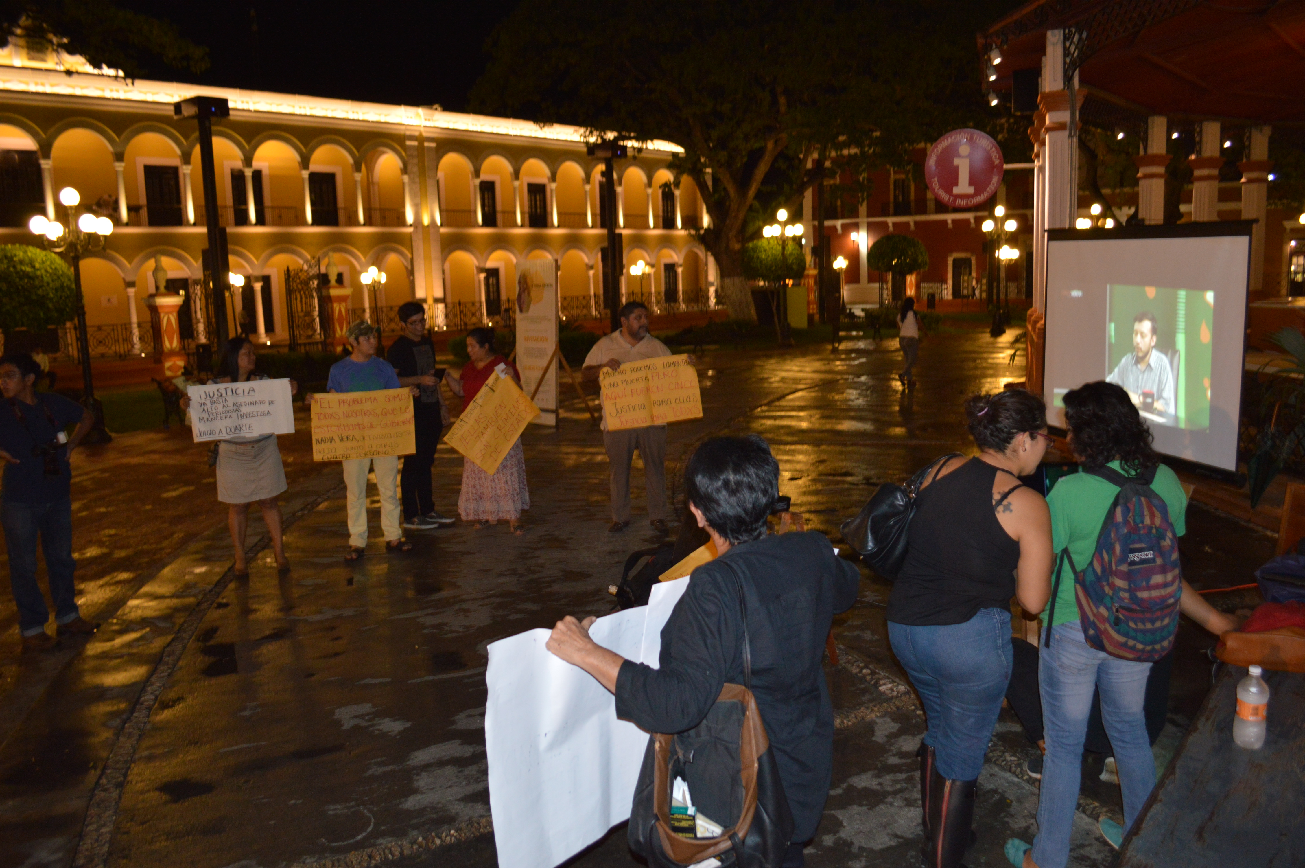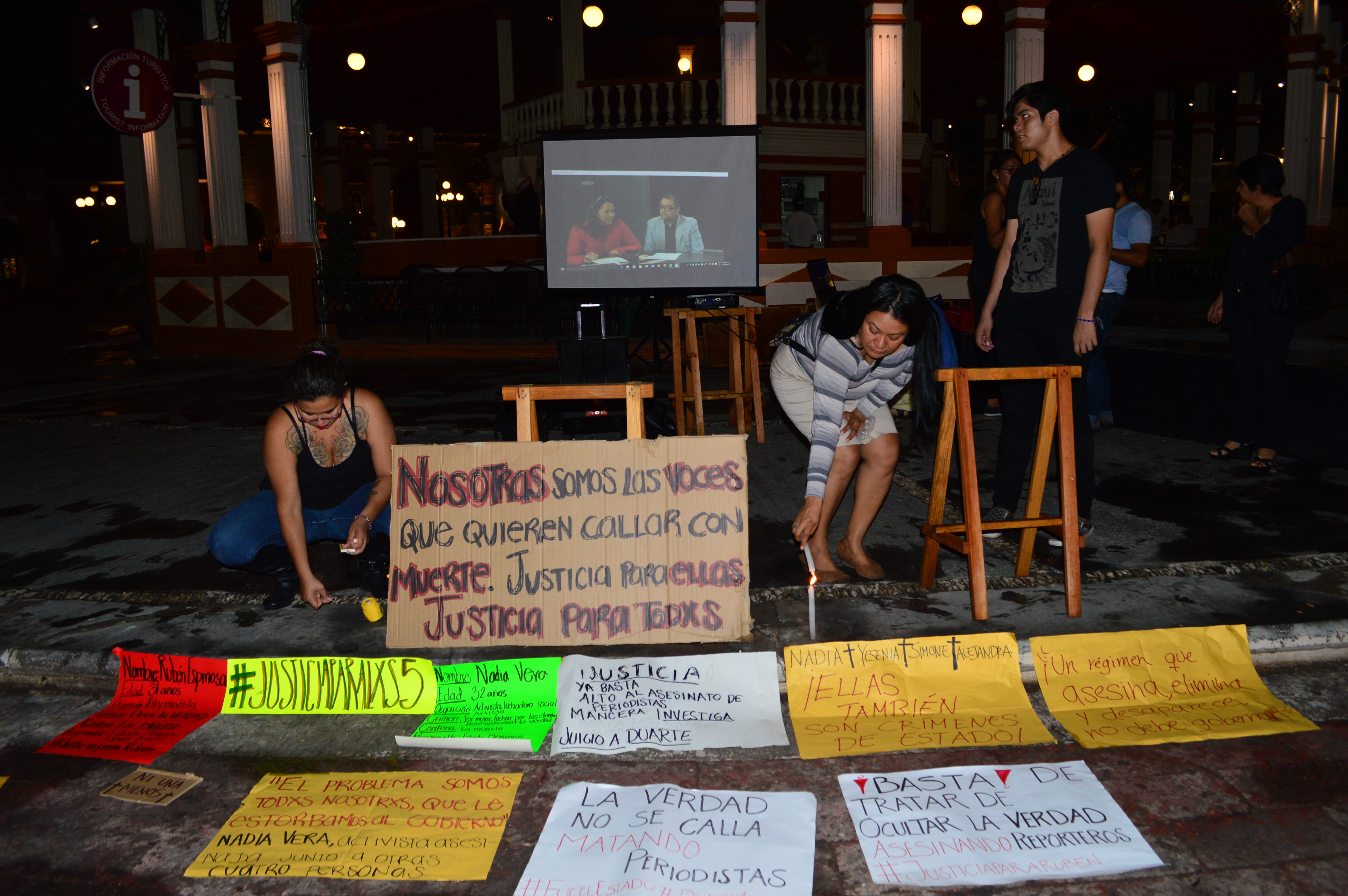 Por Ronny Aguilar CAMPECHE, Cam. 3 de agosto del 2015.- En el segundo día de protestas, activistas y comunicadores mantuvieron su exigencia de justicia por el asesinato del reportero gráfico, Rubén Espinosa y la activista Nadia Vera, quienes ya habían sido amenazados meses atrás por el gobernador de Veracruz, Javier Duarte, y sus tres acompañantes. El día de hoy, como estaba anunciado, reporteros y defensores de derechos humanos dejaron las cámaras y los micrófonos, tomaron las pancartas y protestaron en contra del asesinato del fotógrafo de Cuartoscuro y Proceso, pero también por el de las cuatro mujeres que fueron ultimadas el pasado viernes. Los demandantes de justicia no alzaron la voz el día de hoy, ni recitaron consignas, ni pronunciaron discurso alguno, las voces que se escucharon fueron las de las activistas, la de Nadia, la de Rubén y desde luego la de Duarte y sus amenazas, en un discursos en el que se desenmascara solo, en donde amenaza a los reporteros, bajo el pretexto de que tiene nexos con el crimen organizado, por eso les pide: “Pórtense bien y nada les va pasara”. Durante más de una hora, se proyectaron videos y declaraciones, en donde Rubén y Nadia contaban los abusos de los que eran víctimas de parte del Estado, y dejan claro que no creían en la autoridad, que al final, no hizo nada por protegerlos y porque siguieran con vida. Las acciones de protesta continuarán este martes cuatro de agosto en el parque principal, a las 8:30 de la noche, en la semana de protesta denominada “Por la libertad de expresión y la Justicia”.