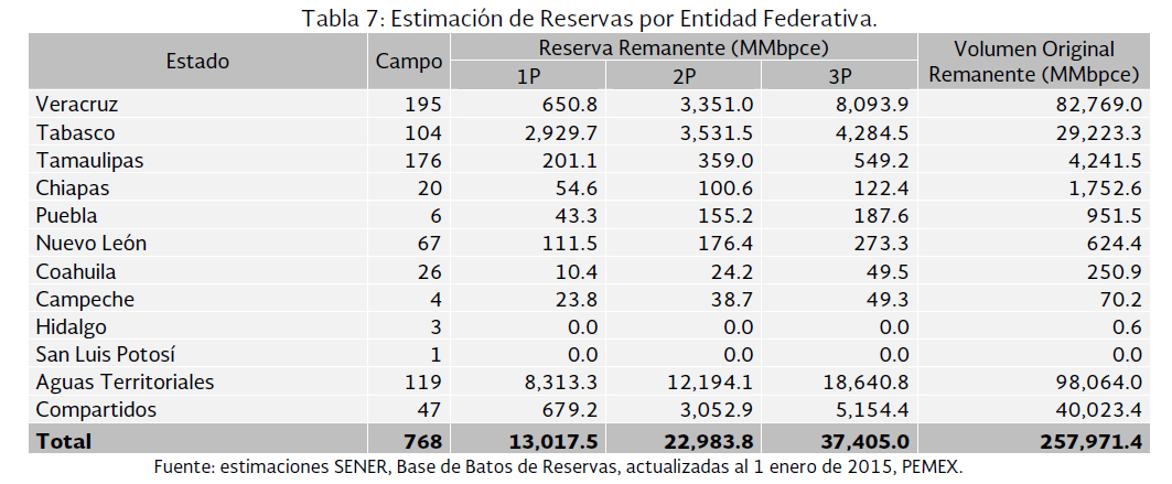 La escasez de reservas en tierra El Plan Quinquenal también revela la escasez de reservas petroleras en territorio del Estado de Campeche, al informar en un estimación de reservas que cuenta actualmente con cuatro campos descubiertos, con una riqueza probada de 23.8 millones de barriles de petróleo crudo equivalente, probable de 38.7 millones y posible de 49.3 millones, mientras que el volumen original remanente se estimaba en 70.2 millones de barriles de petróleo crudo equivalente. La entidad campechana también cuenta con dos campos petroleros compartidos con Tabasco, el Narváez y el Mangar, con una reserva probada de 10.5 millones de barriles de petróleo crudo equivalente, probable de 11.5 millones y posible de 11.9 millones, así como un volumen original remanente de 22.3 millones de barriles de petróleo crudo equivalente.