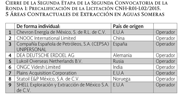 La Comisión Nacional de Hidrocarburos dio a conocer las 9 compañías y los 5 consorcios que precalificaron para la segunda convocatoria de la Ronda 1, pero no está entre ellos Pemex.