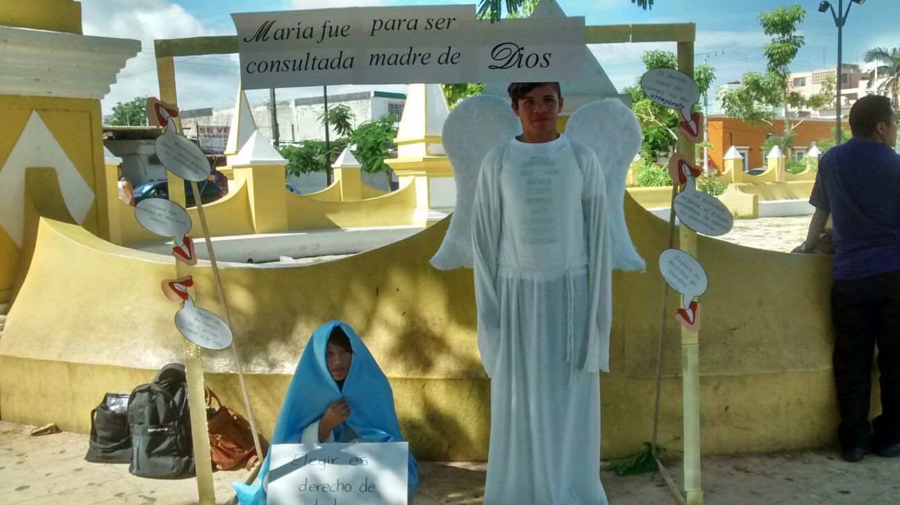 Integrantes de la Red Nacional Católica de Jóvenes por el Derecho a Decidir en Campeche presentó el cuadro vivo “María fue consultada para ser madre de dios, elegir es derecho de todas”. Por Ronny Aguilar CAMPECHE, Cam. 27 de septiembre del 2015.- Integrantes de la Red Nacional Católica de Jóvenes por el Derecho a Decidir en Campeche, presentó el cuadro vivo “María fue consultada para ser madre de dios, elegir es derecho de todas”, en el marco del 27 de septiembre, Día de Prevención del Embarazo no Planificado, y el 28 de septiembre, Día de la Despenalización del Aborto en América Latina y el Caribe. La Alameda “Francisco de Paula Toro”, cercana al mercado “Pedro Sáinz de Baranda”, fue el escenario escogido para presentar este performance, que tiene la intención de concientizar a la ciudadanía del derecho de las mujeres a elegir si desean o no ser madres, pues hasta a María, madre de Jesucristo, le fue consultado si quería ser madre de dios. “El cuadro vivo consta de la representación de cuando Gabriel consulta a María para ser madre de dios, o sea que el ángel le da la opción de una maternidad libre, nadie la está obligando a ser madre, es una elección propia”, explicó una de las participantes. Asimismo, dijo que hace poco se lanzó la estrategia nacional para reducir los embarazos en adolescentes y una de las metas que se habían planteado en la estrategia es disminuir el porcentaje en la tasa de fecundación y los embarazos de niñas de 10 a 14 años y una de las demandas es que no solo se proporcione una cantidad de dinero al tema de la prevención, si no que se agregue la educación sexual integral. Manifestó que una encuesta nacional de opinión católica dice que la feligresía está de acuerdo en que libros de quinto y sexto de primaria tengan temas de anticonceptivos y de prevención, por lo que dicen que el Estado debería hacer más caso de la feligresía, que de los jerarcas o las personas que tienen estos conflictos morales.
