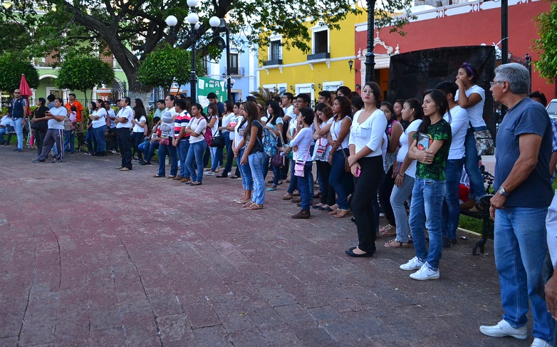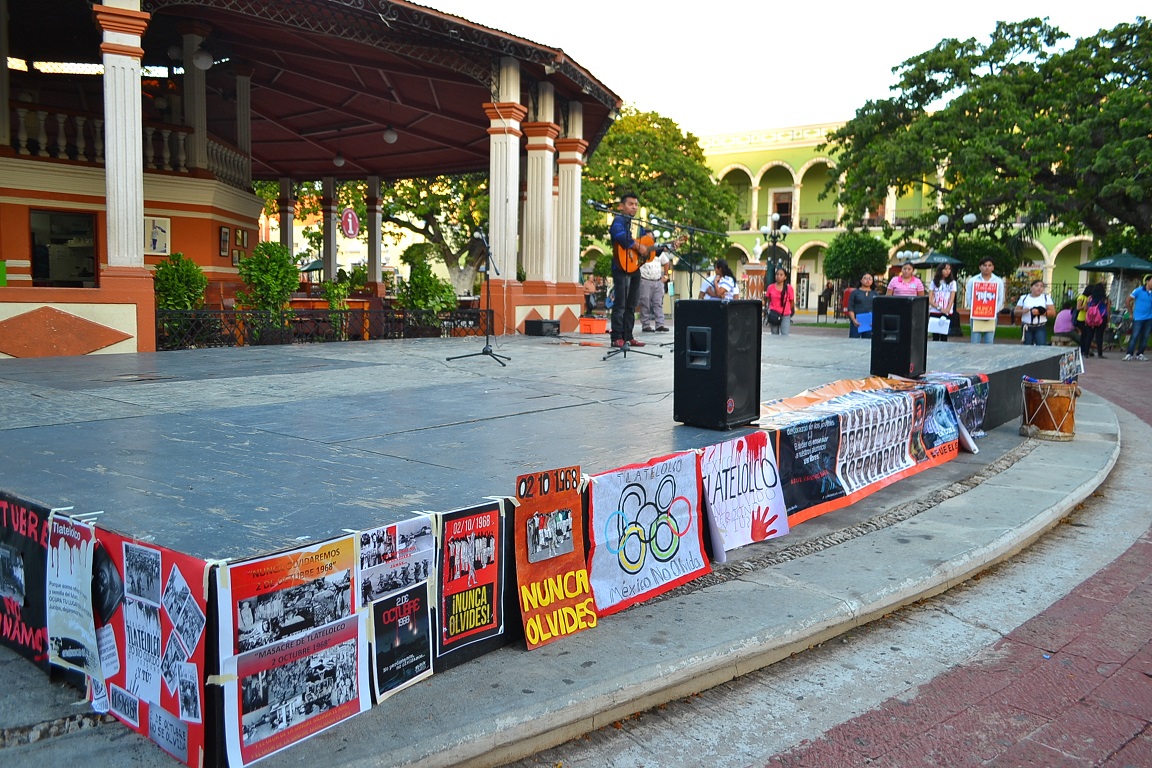 CAMPECHE, Cam. 2 de octubre del 2015.- Decenas de jóvenes y maestros, e integrantes de la sociedad civil, realizaron un homenaje a los caídos el dos de octubre de 1968, en el parque principal de esta ciudad capital, en el que cantaron y recitaron poemas y se pronunciaron por la presentación con vida de los 43 estudiantes normalistas de Ayotzinapa. Alrededor de las seis de la tarde, comenzó el mitin en honor a los jóvenes asesinados en la Plaza de las Tres Culturas, de Tlatelolco, el dos de octubre de 1968, y a 47 años de este fatídico día, en todo el país se sigue acusando al Estado de la brutal matanza orquestada por el Batallón Olimpia, bajo la presidencia del priísta Gustavo Díaz Ordaz. Los manifestantes colocaron mantas y pancartas en alusión a la Matanza de Tlatelolco, pero también hubo constantes pronunciamientos por los 43 desaparecidos de Ayotzinapa, muestra clara que las luchas del ayer son las mismas que se viven en la actualidad y de nueva cuenta vinculadas al Estado. Con música de protesta, algunas de ellas canciones de Víctor Jara, los jóvenes universitarios, en su mayoría, participaron en el mitin que además, incluyó poesía y discursos sobre los reclamos sociales que se presentan en este momento histórico del país. Horas antes, antes de las 11:00 horas, los estudiantes de la Escuela Normal Rural “Justo Sierra Méndez”, de Hecelchakán, como cada año, realizaron una marcha desde la alameda “Francisco de Paula Toro” y gritaron consignas en los bajos del Palacio de Gobierno. Pasada su actuación, salieron corriendo hacia la calle como cada año, sin emitir declaración alguna.