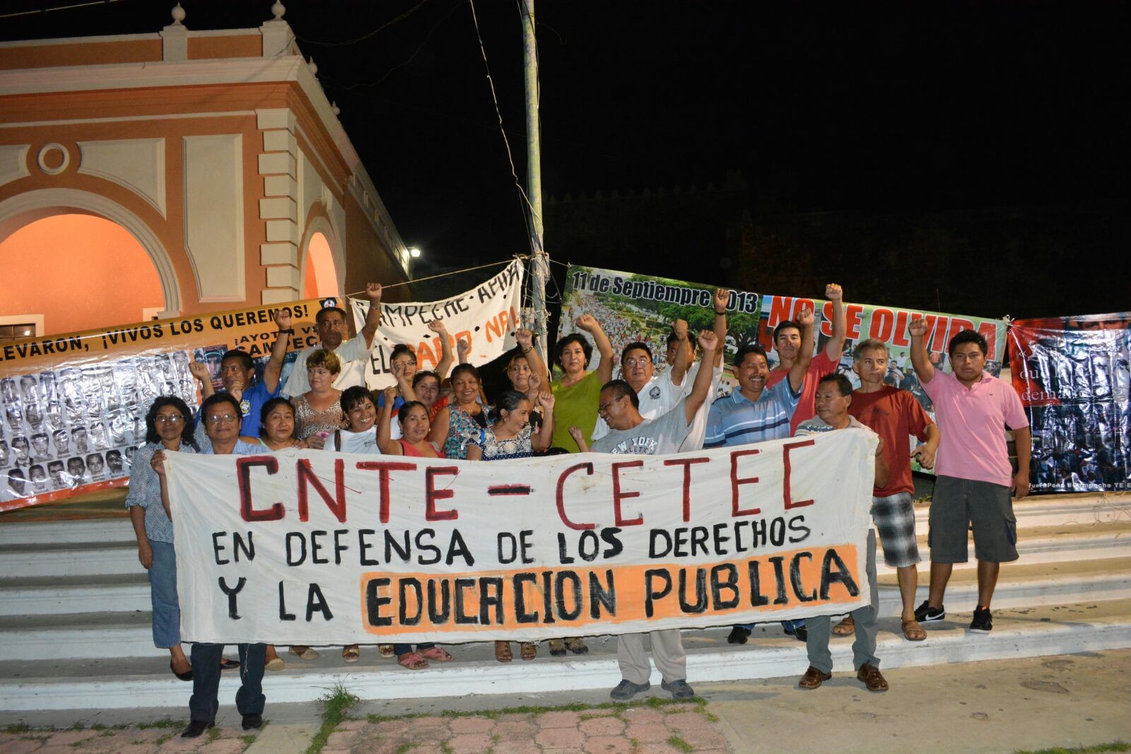 Por Ronny Aguilar CALKINI, Cam. 12 de octubre del 2015.- Maestros de la Coordinadora Estatal de Trabajadores de la Educación de Campeche (CETEC) mostraron su apoyo al paro nacional convocado por la Coordinadora Nacional de Trabajadores de la Educación (CNTE), con un mitin en los bajos del Palacio Municipal de Calkiní, insistiendo en la demanda de dar marcha atrás a la Reforma Educativa, impuesta por Enrique Peña Nieto. En el marco del Día de la Raza, los profesores campechanos expresaron su solidaridad con el paro nacional convocado por la CNTE en Calkiní y pronunciaron posicionamientos acerca de las afectaciones que traerá consigo la Reforma Educativa y la necesidad de unificar luchas en el país en contra las demás reformas peñistas. Con mantas y pancartas, los docentes se plantaron por espacio de dos horas en los bajos del Palacio Municipal, en donde también gritaron consignas. Los manifestantes dieron a conocer que en otros estados de la República, donde la CNTE está consolidada, se realizaron bloqueos de carreteras, marchas y cierre de tiendas departamentales, en estados como Michoacán y puebla incluso se desplegaron antimotines, mientras que aún continúan los paros en entidades, como Tabasco y Oaxaca.