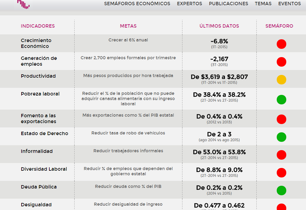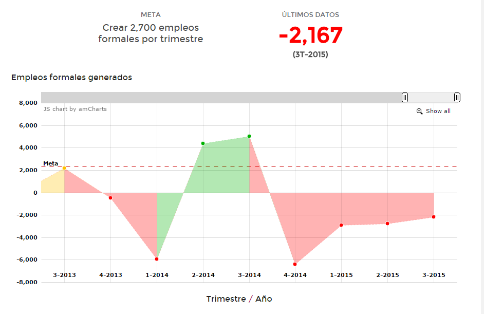 Los semáforos económicos estatales del Imco y México Evalúa mantienen Campeche con “focos rojos” en 6 de 10 indicadores económicos. Por Daniel Sánchez CAMPECHE, Cam. 14 de octubre del 2015.- En los semáforos económicos estatales de la iniciativa “México ¿Cómo vamos? Metas para transformar al país” de las organizaciones civiles Instituto Mexicano de la Competitividad (Imco) y México Evalúa, a Campeche le sigue yendo mal en seis de los 10 indicadores. En el rubro de Generación de empleos, que ya incluye una parte de responsabilidad del ilegítimo y espurio Alejandro Moreno Cárdenas, se informa que en el tercer trimestre del año 2015 (julio, agosto y septiembre), la entidad campechana no cumplió con crear los dos mil 700 empleos formales, incluso tuvo un retroceso de dos mil 167. La tendencia a perder puestos de trabajo, principalmente por el retroceso de la actividad en la industria petrolera, asentada en Ciudad del Carmen, se mantuvo, como en los últimos tres trimestres, cuando se tuvieron descensos de dos mil 791 en el segundo trimestre del año; dos mil 904 en el primer trimestre, y seis mil 385 en el último trimestre del 2014. En total, a lo largo de un año, Campeche ha perdido 14 mil 247 empleos, un 9.1 por ciento menos, y se espera que además de los despidos en las compañías petroleras, los registrados en el gobierno estatal contribuyan a mantener en foco rojo la generación de puestos de trabajo. Según los datos del Instituto Mexicano del Seguro Social (IMSS), el estado registró 142 mil 222 plazas formales el mes pasado, contra los 156 mil 469 en septiembre de 2014, es decir, que en el último año se perdieron 14 mil 247 empleos formales.
