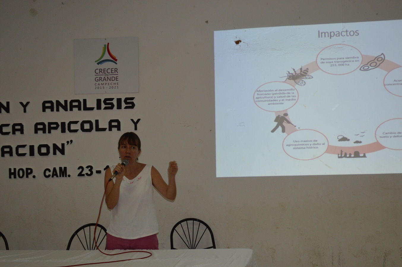 23che1 En Foro sobre problemática apícola y deforestación, la especialista Irma Gómez González señala que la incompatibilidad de la coexistencia de los sectores productivos y explica que hay gente que ha tenido que dejar la actividad apícola, porque no hay a donde ir para continuarla en Hopelchén. 23che Por Ronny Aguilar HOPELCHEN, Cam. 23 de octubre del 2015.- Apicultores mayas de la región de Los Chenes ratificaron su rotundo rechazo a cualquier posibilidad de coexistir con plantaciones de soya transgénica y señalaron que son mayores los perjuicios que los beneficios. El día de hoy, el Ayuntamiento de Hopelche realizó el “Foro de reflexión y análisis de la problemática apícola y la deforestación en el municipio”, oportunidad que fue utilizada por los apicultores mayas para frente al alcalde, Ignacio España, exponer las diversas problemáticas que se están presentando en la zona. Los asistentes, en su mayoría campesinos, hablaron de los apoyos que se han dejado de brindar por las autoridades que privilegian a los grandes productores, la tala inmoderada, el cambio de uso de suelo, la problemática de las fumigaciones aéreas, que han matado miles  de colmenas y del riesgo que corre la selva maya. La primera ponencia estuvo a cargo de Irma Gómez González, quien cuenta con una maestría en Desarrollo Rural y asesora del Colectivo Apícola de Los Chenes, seguido de las participaciones de los apicultores, continuando con una breve intervención del alcalde Ignacio España. Asimismo, el foro cerró con la participación de la doctora en Biotecnología, Aída Hernández Martínez, quien defendió a los organismos genéticamente modificados, y su ponencia ocasionó que muchos abandonaran el recinto, pues los apicultores indicaron que estaba pagada por la compañía transnacional Monsanto. La especialista actualmente es subdirectora de Educación del Colegio de Posgraduados, Campus Campeche, quien anunció que se abriría una especie de módulo de información en la zona. Mención aparte, la participación de Irma Gómez detalló ciertos aspectos de la incompatibilidad de la coexistencia de los sectores productivos, y explicó que hay gente que ha tenido que dejar la actividad apícola, porque no hay a donde ir para continuarla en Hopelchén, pues a donde te muevas, te llegan los plaguicidas. “Se está reduciendo la posibilidad de hacer apicultura, porque se está reduciendo el monte, el caso de Argentina es un caso muy interesante, porque se habla de que está produciendo miel y vendiendo miel y no es verdad, Argentina redujo su producción y el impacto socioeconómico es grande, hay más de 15 mil apicultores menos en Argentina, los productores más pequeños tuvieron que dejar la actividad, porque no tenían posibilidad de moverse y esto afecta a los pequeños, porque los más grandes pueden trasladar sus colmenas, ahí es un desierto de soya”, indicó. “El otro factor que está acabando es el agroquímico, es glifosato, el faena, hay reportes científicos que hablan de afectaciones a las abejas con el glifosato, pero también con los insecticidas, y tanto la soya transgénica, como la Huasteca, están plagadas y están aplicando insecticida, tienen una plaga como común, que es la mosca del citrato y son plagas que empeorarán, por lo que requerirán más químicos y las afectadas son las abejas, pero también las personas”, puntualizó. Mencionó que hay comunidades en las que las avionetas están bajando a 400 metros del pueblo, como en San Juan Bautista Sacabchén, en la que en las últimas semanas, se escuchan a diario las aplicaciones de plaguicidas. “El tema de la deforestación y el cambio de uso de suelo, es un amenaza sobre la tierra, cada día hay más presión para rentar, para vender, el asunto de la baja del precio del maíz, que deja sin la posibilidad a los campesinos de sembrar, obligándolos a rentar”, expuso. Afirmó que este año, se ha generado información importante del tema, tales como que hay estudios que revelan que la mayor deforestación del país se ha generado en la Península de Yucatán y de la Península, Campeche es el Estado más deforestado y en primer lugar, en deforestación, es justamente Hopelchén, seguido de Candelaria. “Se calcula que en Campeche, entre 2001 y 2013, se perdieron 60 mil hectáreas, que representa el 10 por ciento de la superficie total del municipio. Datos sacados de información agropecuaria de Sagarpa, que se encuentra en línea, dice que entre el 2012 y el 2014, la superficie sembrada con soya aumentó 14 mil hectáreas en dos años y en ese mismo periodo, la deforestación aumentó 18 mil 500 hectáreas, por lo que las tendencias coinciden, aumenta la superficie de soya sembrada y aumenta la superficie de deforestación, y tenemos deforestaciones nuevas en donde lo que está sembrado es soya”, aseveró. Comentó que con el glifosato se ahorra en recursos de la mano de obra para el deshierbe, pero en marzo del 2015, la Organización Mundial de la Salud (OMS) aseguró que el glifosato es un causante de cáncer en humanos, avalado por científicos de 11 países del mundo que participaron en la investigación. Puntualizó que es imposible que convivan la siembra de soya transgénica y la apicultura. “En general de la agricultura industrial, que es lo que aquí estamos viendo, inmensas superficies de monocultivo donde se aplica plaguicidas  y donde se está deforestando”, asentó. Detalló que el precio de la miel se aumentó tres veces su valor en los últimos años, representando  una de las oportunidades más importantes por el crecimiento económico, además de que se beneficie la gran mayoría de los campesinos, mientras hay un reducido número de soyeros.