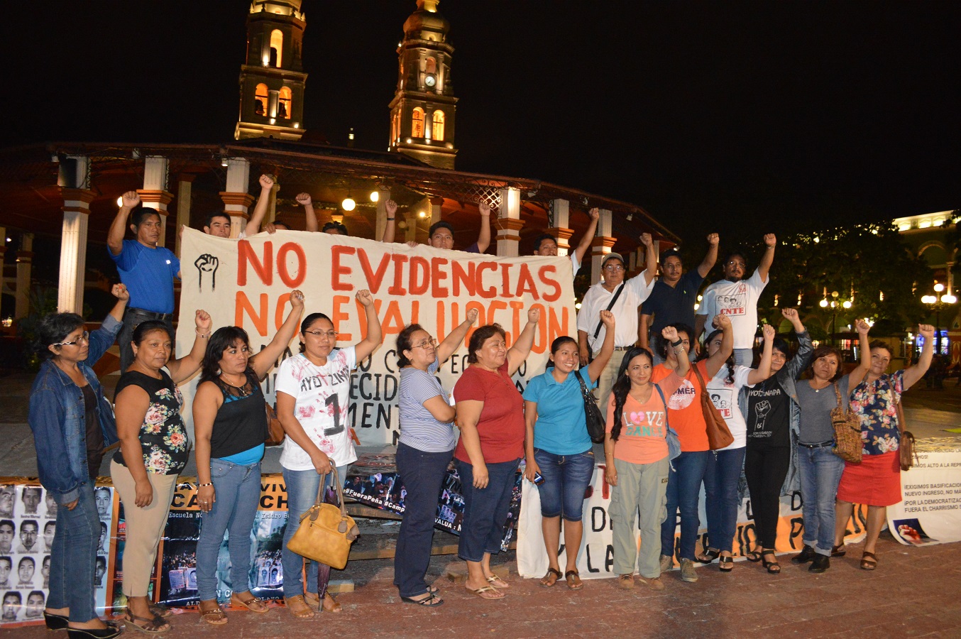 Por Ronny Aguilar  CAMPECHE, Cam. 26 de octubre del 2015.- Maestros de la Coordinadora Estatal de Trabajadores de la Educación de Campeche (CETEC) realizaron un mitin y exigieron, una vez más, al Estado mexicano la aparición con vida de los 43 estudiantes de la Escuela Normal “Raúl Isidro Burgos”, de Ayotzinapa, Guerrero, a 13 meses de la noche trágica; se pronunciaron contra la mal llamada Reforma Educativa de Enrique Peña Nieto y los cultivos transgénicos en Campeche, y demandaron la libertad del primer preso político del sexenio de “Alito”, Pedro Celestino May Can.  La tarde de hoy, profesores adheridos a la Coordinador Nacional de Trabajadores de la Educación (CNTE) se manifestaron en el parque principal, exigiendo en primera instancia, que el gobierno federal del traidor a la Patria, Enrique Peña Nieto, deje que el Ejército Mexicano también sea investigado por el caso y sean llamados militares al interrogatorio.  Rechazaron tajantemente la “verdad histórica” de la Procuraduría General de la República (PGR) y mostraron su descontento contra Excélsior TV, que replica esto a manera de documental desinformativo, que contribuye a que un pueblo viva enajenado y lejos de la realidad que los peritos independientes han señalado que sucedió en aquel basurero de Cocula.  Silverio Tuz Góngora, representante de CETEC, explicó que la Reforma Educativa que en este mes de noviembre, será aplicada en los exámenes de permanencia docente, está fallando en diversos aspectos, y señaló que la CNTE a nivel nacional respaldará a los maestros que no cargaron sus evidencias en el portal y a los que no acudan a presentarse a la evaluación.  Explicó que aquél que no acepte ser evaluado, no podrá ser cesado, caso diferente cuando eres llamado y aceptas presentar, ya que al firmar, renuncias a la retroactividad de la ley que te ampara.  “La semana pasada, se convocó a 200 maestros, que no subimos las evidencias, y el secretario de Educación en el estado, Ricardo Medina Farfán, dijo que se van aplicar 960 evaluacioones a los que ya subieron sus evidencias, cuando se convocó a mil 160 maestros, los otros 200 estamos en resistencia, en lucha y les digo como representante de la CNTE, que se va a respaldar a los maestros que no suban sus evidencias y no se presenten sus exámenes”, indicó.  También se hicieron presentes las posturas en contra de la siembra de monocultivos y específicamente de transgénicos en el estado de Campeche, lo que está próximo a resolverse en torno a la soya en la Suprema Corte de Justicia de la Nación.  De igual forma, se planteó la necesidad de respaldar al líder campesino de Lerma y preso político, Pedro Celestino May Can, además de expresar una alerta ante la creciente inseguridad que está padeciendo el estado.