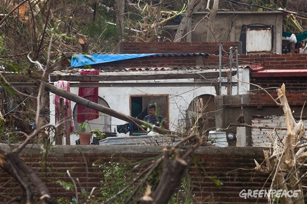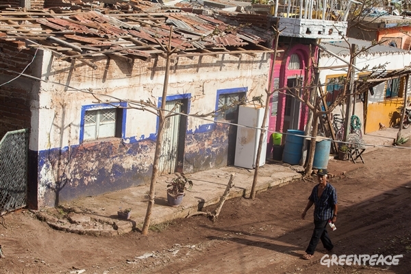 La Sierra Madre Occidental ayudó a aminorar el impacto del huracán considerado más grande y poderoso de los últimos tiempos. Foto: Prometeo Lucero/ Greenpeace. Hace apenas cuatro años, esta zona también recibió el impacto del huracán Jova (2011), y la flora y fauna del lugar estaba empezando a recuperarse cuando llegó Patricia. La selva baja caducifolia que se encuentra en esta cordillera fue devastada por los fuertes vientos de Patricia: árboles arrancados desde la raíz, otros sin hojas en sus copas y de algunos más solo quedaron sus troncos y no sabemos cuánto tiempo tarden en volver a crecer. De acuerdo con Claudia Uribe del Centro Universitario de Ciencias Biológicas y Agropecuarias (CUCBA) de la Universidad de Guadalajara (UDG), los daños a la selva ocasionarán la disminución de especies nativas de la zona y especies migratorias que utilizan la sierra para reproducirse o anidar. Para la Secretaría de Medio Ambiente y Desarrollo Territorial de Jalisco, una de las principales preocupaciones es que tras el paso de Patricia, quedó mucha materia prima para los incendios forestales (hojas, ramas, troncos) en una zona donde los próximos 8 meses son de época seca. Existe además el riesgo de que la ganadería se extienda hacia lugares en los que antes de Patricia había árboles, de ser así, la sierra que es una barrera natural para los ciclones, podría ya no estar ahí para defendernos en el siguiente fenómeno hidrometeorológico, que a causa del cambio climático, podría ser más frecuente, más intenso y más grande y en consecuencia con impacto mayor. Cientos de familias perdieron su casa y pertenencias, sectores económicos como el turismo y la agricultura, principales actividades de la región, resultaron dañadas y en consecuencia las familias que dependen de ellas. En Arroyo Seco, Jalisco, las cerca de 600 personas que ahí viven, sintieron en carne propia el golpe de Patricia, escucharon el chillido del viento que arrasaba los techos de láminas de sus casas, tumbaba paredes y arrancaba las cortinas metálicas de los negocios; después, el silencio y cuando creían que había pasado todo, el huracán volvió para derrumbar lo que encontraba a su paso.
