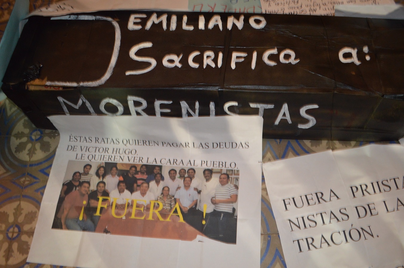 Por Ronny Aguilar CALKINI, Cam. 4 de noviembre del 2015.- Militantes del partido político Morena sitiaron el Palacio Municipal, la noche del martes y la madrugada del miércoles, con el alcalde Emiliano Canul Aké y regidores priístas y panalista en el interior, en demanda del despido de nueve funcionarios de extracción priísta y transparencia total en las anomalías detectadas a la administración de Víctor Hugo Baltazar Rodríguez. El presidente municipal se negó al diálogo con los inconformes, golpeó a la regidora Ludina Uribe Loeza y solicitó el apoyo de la fuerza pública al ilegítimo y espurio Alejandro Moreno Cárdenas, para que le abrieran paso y pudiera salir de la sede gubernamental, alrededor de las 02:30 horas, y huyó en una camioneta de la Policía Estatal, escoltado por cinco vehículos de la corporación policiaca. Mientras se realizaba la sesión ordinaria de Cabildo, alrededor de las 9:00 de la noche, decenas de manifestantes se plantaron en el Palacio Municipal, con pancartas y un ataúd de cartón, exigiendo ser atendidos por Canul Aké para pedir la destitución de nueve de los funcionarios municipales, por estar obstruyendo la claridad en las cuentas públicas de la administración saliente. Emiliano Canul fue electo como presidente municipal el pasado siete de junio, bajo los colores de Morena y al colocar a militantes del tricolor, algunos de ellos ratificados del trienio pasado, provocó la inconformidad de los habitantes del municipio, que buscaban un cambio ideológico y de gobierno.