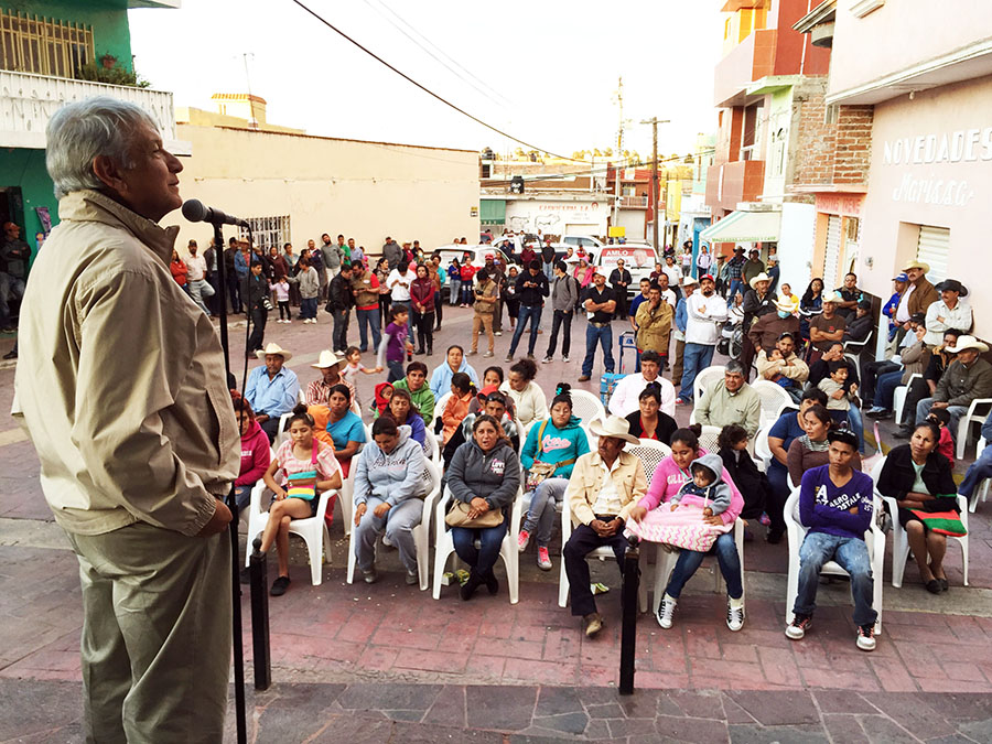 Alerta López Obrador que la mafia quiere borrar a Morena, por eso manda Salinas a Beltrones a decir que hace trampa. VILLA GARCIA, Zac. 13 de noviembre de 2015.- El presidente del Consejo Nacional, Andrés Manuel López Obrador, expresó que los integrantes de la mafia del poder tienen en la mira y ven con buenos ojos a ocho personas para que uno de ellos sea su candidato a la Presidencia de la República en el 2018 y los enumeró: Los secretarios de Gobernación, Miguel Ángel Osorio Chong; de Hacienda, Luis Videgaray Caso; de Educación, Aurelio Nuño Mayer; el presidente del PRI, Manlio Fabio Beltrones; así como el director general del Instituto Mexicano del Seguro Social, José Antonio González Anaya. Asimismo, añadió, la esposa del panista Felipe Calderón, Margarita Zavala Gómez del Campo; el gobernador de Nuevo León, Jaime Heliodoro Rodríguez Calderón, y hasta el jefe de Gobierno del Distrito Federal, Miguel Ángel Mancera Espinosa. El político de izquierda expuso que cualquiera de los ocho personajes cumplen las características para ser empleado, títere, pelele de la mafia del poder, asimismo, ellos forman parte del régimen de corrupción y de privilegios que se padece en el país. Los potentados, aseguró, no quieren al partido político Morena y a su posible candidato, ahí está la realidad, no ven con buenos ojos a Morena, porque quiere que haya un cambio, una transformación y terminar con la corrupción en el país, que es el principal problema de México. En otro tema, López Obrador alertó que “la mafia del poder está preocupada por el 2018 y quiere borrarnos, por eso mandó (Carlos) Salinas a (Manlio Fabio) Beltrones a decir que hago trampa, pues aparezco en los mensajes de radio y televisión en los tiempos oficiales de Morena”. En su cuenta de Facebook, expresó que los potentados son dueños o tienen a su servicio a casi todos los medios de información y por si fuese poco, en los tiempos oficiales tienen 10 veces más que nosotros. Indicó que “vetarnos por completo, con cualquier argucia, sería elevar la censura a rango supremo”, en otras palabras, se estaría cancelando por completo la libertad de expresión y convocó a sus seguidores a estar atentos, porque lo declarado por Beltrones “es un mensaje de la mafia, del hampa de la política y son capaces de todo”. En Villa García, así como en Villa González, explicó que la mafia del poder anda preocupada, porque no saben cómo enfrentar a Morena, porque solo este partido político no es de los potentados, ya que Morena es la única fuerza política independiente, hay 10 partidos, pero 9 están sometidos, apergollados, controlados por los potentados. “Solo hay un partido independiente, un partido del pueblo y para el pueblo y ese partido es Morena”, indicó, al comentar que solo hay dos partidos: el partido del pueblo que es Morena y los partidos de la mafia del poder. Afirmó que Morena quiere quitar los privilegios a los altos funcionarios públicos y frenar que los políticos corruptos se roben, cada año, el 10 por ciento del presupuesto público, que para este año fue de cuatro billones 600 mil millones de pesos y para el 2016 será de aproximadamente cinco billones de pesos. Denunció que la mafia del poder “maicea” muy bien a los políticos que están a su servicio, los colman de atenciones, de privilegios, y comentó que los altos funcionarios públicos de México son los mejores pagados del mundo como es el caso de los ministros de la Suprema Corte de Justicia de la Nación ganan 600 mil pesos mensuales y los ex presidentes reciben, cada uno, en total un millón mensual de pensión. El pequeño faraón, acomplejado y corrupto Enrique Peña Nieto, dijo, se atrevió a comprarse un avión de siete mil 500 millones de pesos, más el mantenimiento de la aeronave y la ampliación del hangar presidencial, son 10 mil millones de pesos, lo que significan 500 años, 5 siglos, del presupuesto de Villa García. Aseguró sin temor a equivocarse que es más corrupto el gobernador de Zacatecas, Miguel Alonso Reyes que el presidente municipal de Villa García, Gildardo Cruz Arteaga, es más corrupto Peña Nieto que Alonso Reyes, porque es sencilla la fórmula: “entre más elevados, más ladrones”. El ex candidato presidencial manifestó sentirse bien de visitar a los habitantes de Villa García, porque no le hace que sea su cumpleaños, pero lo principal es como decía el presidente Benito Juárez: “con el pueblo todo, sin el pueblo nada”.