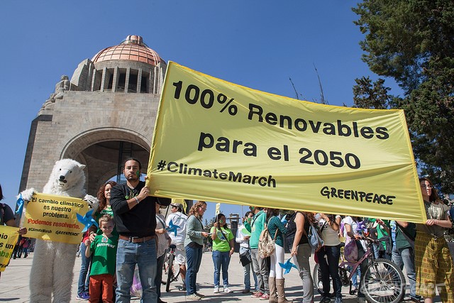 CIUDAD DE MEXICO, D.F. 30 de noviembre del 2015.- Cerca de 570 mil personas en 175 países tomaron ayer las calles para exigir acciones concretas contra el cambio climático. En la víspera de la reunión de los líderes mundiales para la cumbre climática en París, las personas se movilizaron desde la Ciudad de México hasta Australia con un llamado para alcanzar un acuerdo climático global, que ponga fin a la era de los combustibles fósiles y el continuo y peligroso aumento en las emisiones de gases de efecto invernadero. En la Ciudad de México, poco más de mil personas, entre ciudadanos, miembros de organizaciones civiles y movimientos ambientalistas y religiosos, convocados por Greenpeace, Avaaz, Caritas, 350.org, WWF, ITDP, entre otros, marcharon desde el Monumento a la Revolución hasta el de la Madre, con la consigna de exigir políticas orientadas a incrementar las energías renovables y la aprobación en el Senado de la Ley de Transición Energética. La movilización climática se replicó en capitales como Londres, Berlín, Madrid y Roma, también en Durban, Beirut, Seúl y Kieve. Tan solo en Sidney, Australia, unas 45 mil personas protestaron y guardaron un minuto de silencio por todos aquellos que ya están sufriendo los efectos del cambio climático. Las marchas comenzaron desde ayer en países como Nueva Zelanda, Fiji, Japón, Bangladesh, Egipto, Camerún y Sudáfrica. Se trata de una de las jornadas globales más importantes en la lucha contra el cambio climático toda vez que la sociedad civil celebró más de 2 mil 300 eventos en poco más de 175 países, para pedir por un mundo que se mueva no con sucios y obsoletos combustibles fósiles, sino con energías renovables. Las medidas de seguridad impuestas en Francia obligaron a cancelar cualquier evento masivo, por lo que Greenpeace y otras organizaciones crearon la plataforma March4me, una web que conectó a casi 30 mil personas que no pudieron marchar en Francia con aquellos que sí podían en otros países con el fin de que se movilizaran en su nombre. “En cinco continentes, las personas han tomado las calles para exigir que se cambie la forma en la que se dota de energía al mundo. La gente quiere un acuerdo climático que garantice que la temperatura del planeta se mantendrá en una zona segura, eso requiere finalizar la era de los combustibles fósiles y que nos encaminemos hacia un futuro 100 por ciento con energías renovables para el año 2050”, aseguró el coordinador del programa de Megaciudades de Greenpeace México, Gustavo Ampugnani. “Si en las próximas dos semanas tenemos eso, entonces en París se habrá alcanzado ahora sí un acuerdo histórico. La gente marchó y nosotros seguiremos ejerciendo presión en los próximos días, sin embargo ahora la pelota está en la cancha de los políticos”, añadió. Se trata de una de las jornadas globales más importantes en la lucha contra el cambio climático toda vez que la sociedad civil celebró más de dos mil 300 eventos en poco más de 175 países, para pedir por un mundo que se mueva no con sucios y obsoletos combustibles fósiles, sino con energías renovables.